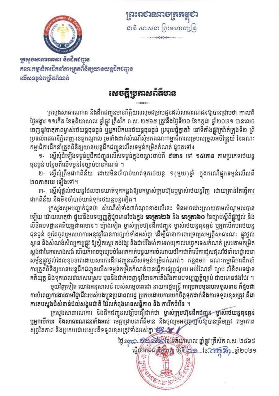 រាជធានីភ្នំពេញ៖ យោងតាមការចុះផ្សាយរបស់ ក្រសួងសាធារណការ និងដឹកជញ្ជូន បានចេញសេចក្តីប្រកាសព័ត៌មាន ស្តីពីការប្រមូលផ្តុំគ្នាតវ៉ា របស់ម្ចាស់រថយន្តធុនធ្ងន់ ឬអ្នកបើកបររថយន្តធុនធ្ងន់ នៅទីតាំងផ្លូវក្រវ៉ាត់ក្រុងទី២ ព្រំប្រទល់រាជធានីភ្នំពេញ-ខេត្តកណ្តាល កាលពីថ្ងៃទី២០ ខែកក្កដា ឆ្នាំ២០២១ រួមទាំងដាក់សំណើរសុំមកគណៈកម្មាធិការសម្របសម្រួលអចិន្ត្រៃយ៍ នៃគណៈកម្មាធិកាដឹកនាំត្រួតពិនិត្យយានយន្តដឹកជញ្ជូនលើសទម្ងន់កម្រិតកំណត់ ដូចតទៅ៖