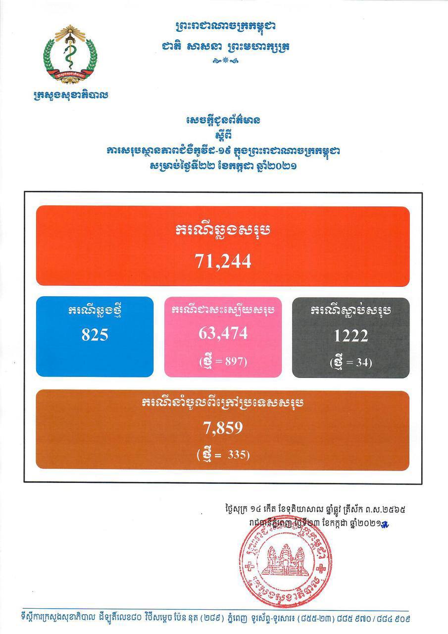 នៅថ្ងៃទី23 ខែកក្កដា ឆ្នាំ2021នេះ ក្រសួងសុខាភិបាលកម្ពុជា បានចេញសេចក្តីជូនដំណឹងពី ការរកឃើញករណីវិជ្ជមានវីរុសកូវីដ១៩ថ្មី ចំនួន 825នាក់ ខណៈអ្នកបានជាសះស្បើយថ្មីមានចំនួន 897នាក់ និងមានអ្នកបាត់បង់ជីវិត34នាក់។ គិតមកទល់ពេលនេះ ករណីឆ្លងកូវីដ១៩ សរុបនៅក្នុងប្រទេសកម្ពុជា មានចំនួន 71,244នាក់, ករណីជាសះស្បើយសរុប 63,474នាក់ និងស្លាប់សរុប 1,222នាក់៕
