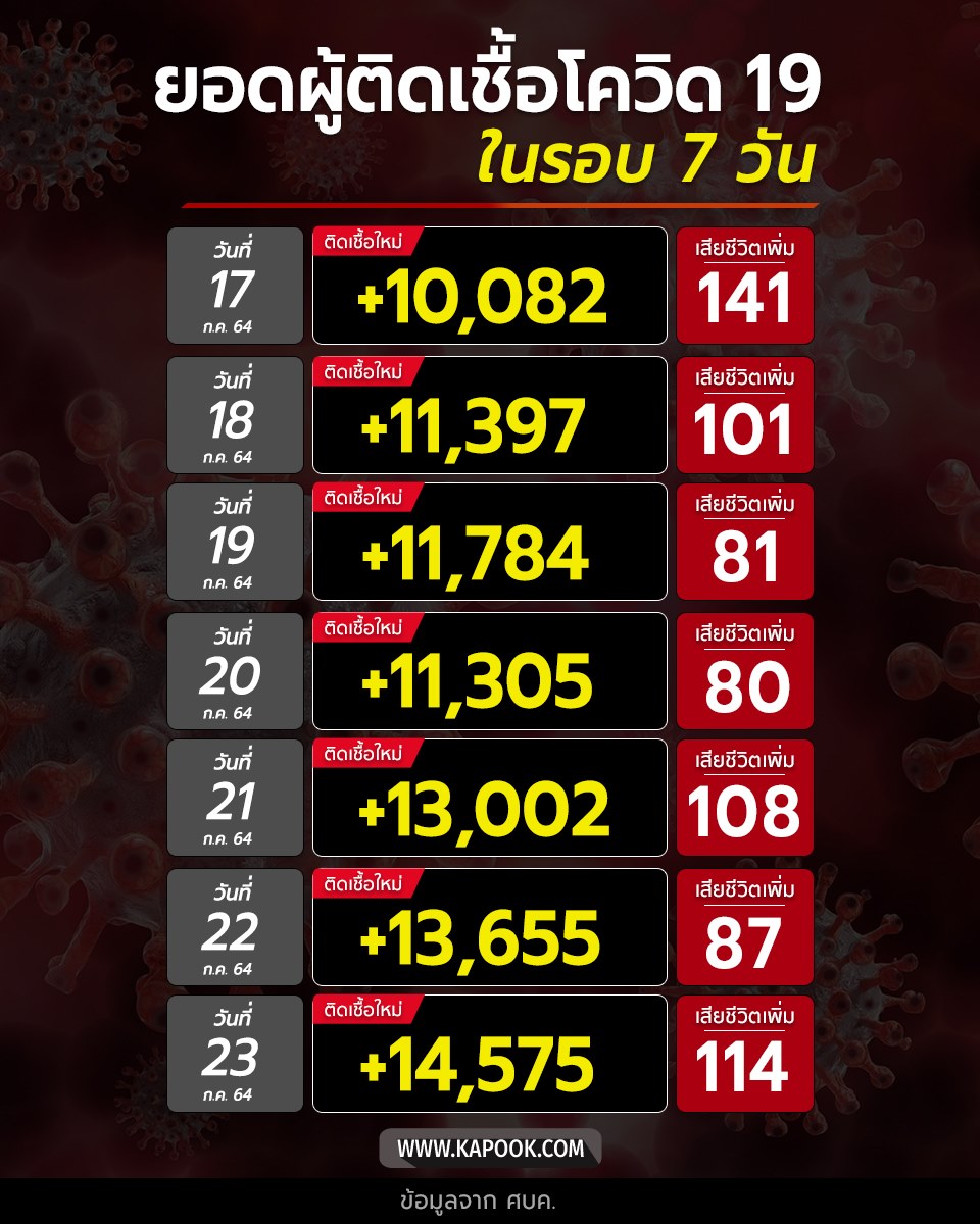 ដោយឡែកសម្រាប់ថ្ងៃសុក្រទី ២៣ ខែកក្កដានេះវិញ តួលេខអ្នកឆ្លងថ្មីនៅទូទាំងប្រទេសថៃបានកើនឡើងរហូតដល់ ១៤,៥៧៥ នាក់ ខណៈចំនួនអ្នកស្លាប់វិញមានចំនួន ១១៤ នាក់ផងដែរ។ បើគិតជាសរុបរួមគឺត្រឹមពេលនេះប្រទេសថៃបានរកឃើញអ្នកឆ្លងកូវីដ ១៩ សរុបចំ​នួន ៤៦៧,៧០៧នាក់ និងស្លាប់សរុបចំនួន ៣,៨១១ នាក់។ សូមបញ្ជាក់ផងដែរថា នៅចំពោះមុខស្ថានភាពរាតត្បាតជំងឺកូវីដ ១៩ យ៉ាងច្រើនដូចនេះ អាជ្ញាធរសុខាភិបាលថៃក៏បានជួបប្រទះនឹងបញ្ហាដ៏ធំមួយផងដែរគឺនៅតាមមន្ទីរពេទ្យក្នុងទីក្រុងបាងកកនិងតាមបណ្តាខេត្តមួយចំនួនគ្មានកន្លែងទំនេរសម្រាប់ដាក់ព្យាបាលអ្នកឆ្លងថ្មីនោះទេ ដោយអ្នកឆ្លងថ្មីទាំងអស់ត្រូវធ្វើការរង់ចាំជាច្រើនថ្ងៃរហូតមានគ្រែទំនេរទើបពួកគាត់អាចទៅសម្រាកក្នុងមន្ទីរពេទ្យបាន ហើយក៏មានអ្នកជំងឺខ្លះបានស្លាប់នៅផ្ទះខ្លួនឯងក្នុងអំឡុងពេលរង់ចាំនេះផងដែរ៕