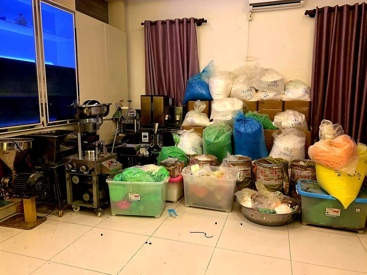 គ.សម្ភារមធ្យោបាយ និងឧបករណ៍កែច្នៃសារធាតុញៀន៖ ទូរស័ព្ទ ០៤គ្រឿង, ម៉ាស៊ីនសម្រាប់សម្ងួតសារធាតុញៀនចំនួន ០២គ្រឿង, ក្រឡុកសារធាតុញៀន ចំនួន០៦គ្រឿង, ពុម្ពសម្រាប់វាយគ្រាប់សារធាតុញៀនមួយចំនួនធំ និងវេចខ្ចប់សារធាតុញៀន០១គ្រឿង ៕