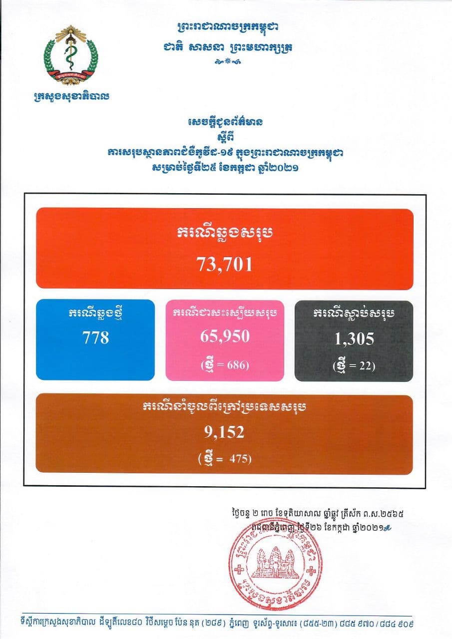 នៅថ្ងៃទី26 ខែកក្កដា ឆ្នាំ2021នេះ ក្រសួងសុខាភិបាលកម្ពុជា បានចេញសេចក្តីជូនដំណឹងពី ការរកឃើញករណីវិជ្ជមានវីរុសកូវីដ១៩ថ្មី ចំនួន 778នាក់ ខណៈអ្នកបានជាសះស្បើយថ្មីមានចំនួន 686នាក់ និងមានអ្នកបាត់បង់ជីវិត 22នាក់។ គិតមកទល់ពេលនេះ ករណីឆ្លងកូវីដ១៩ សរុបនៅក្នុងប្រទេសកម្ពុជា មានចំនួន 73,701នាក់, ករណីជាសះស្បើយសរុប 65,950នាក់ និងស្លាប់សរុប 1,305នាក់៕