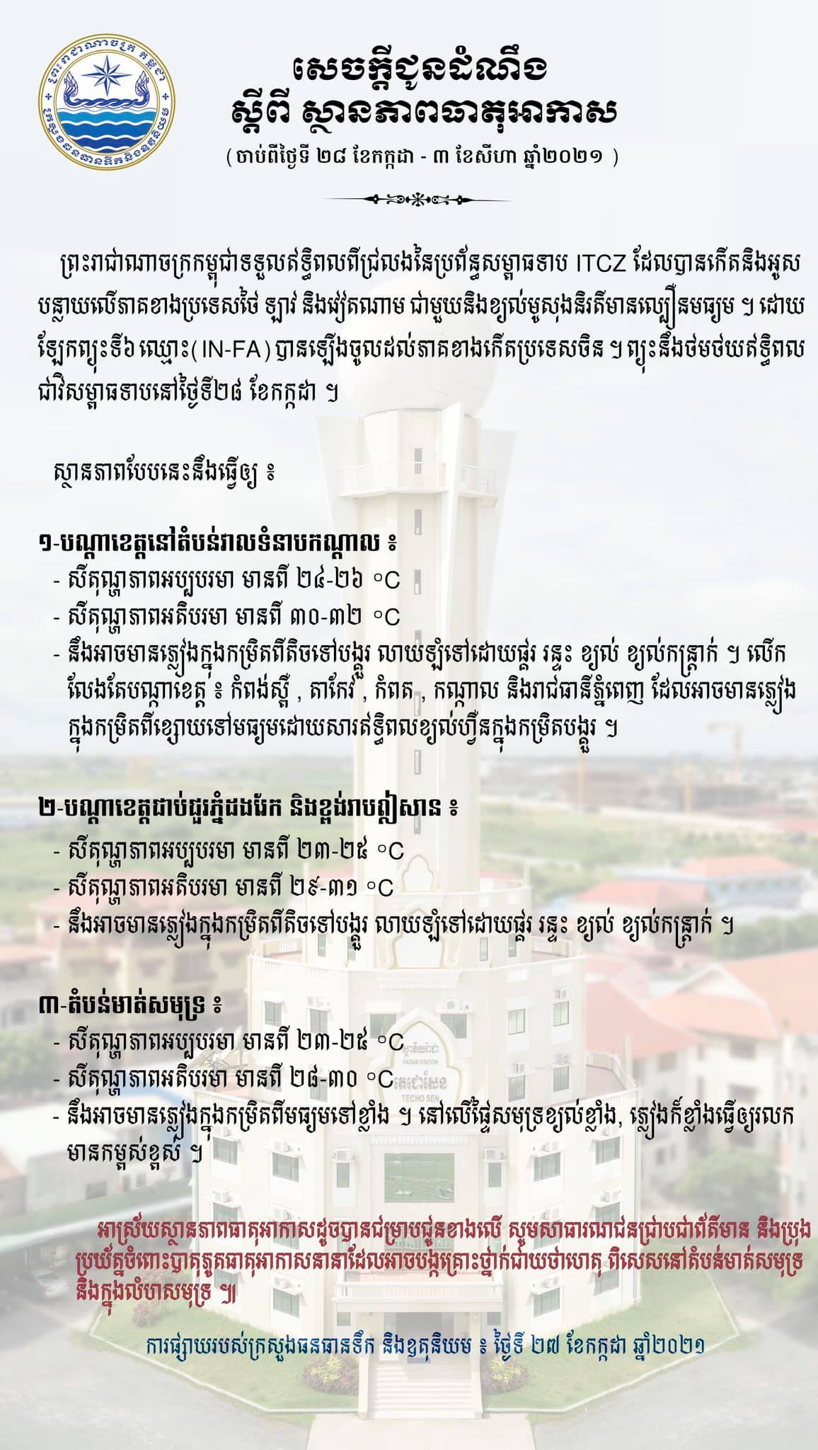 យោងតាមការបញ្ជាក់ពីក្រសួងធនធានទឹក និងឧតុនិយម បានឲ្យដឹងថា ចាប់ពីថ្ងៃទី២៨ ខែកក្កដា ដល់ថ្ងៃទី៣ ខែសីហា នេះទៅ ព្រះរាជាណាចក្រកម្ពុជាទទួលឥទ្ធិពលពីជ្រលងនៃប្រព័ន្ធសម្ពាធទាប ITCZ ដែលបានកើតនិងអូសបន្លាយលើភាគខាងប្រទេសថៃ ឡាវ និងវៀតណាម ជាមួយនឹងខ្យល់មូសុងនិរតីមានល្បឿនមធ្យម។ ដោយឡែកព្យុះទី៦ ឈ្មោះ (IN-FA) បានឡើងចូលដល់ភាគខាងកើតប្រទេសចិន។ ព្យុះនឹងថមថយឥទ្ធិពលជាវិសម្ពាធទាបនៅថ្ងៃទី២៨ ខែកក្កដា។ ស្ថានភាពបែបនេះនឹងធ្វើឲ្យ៖