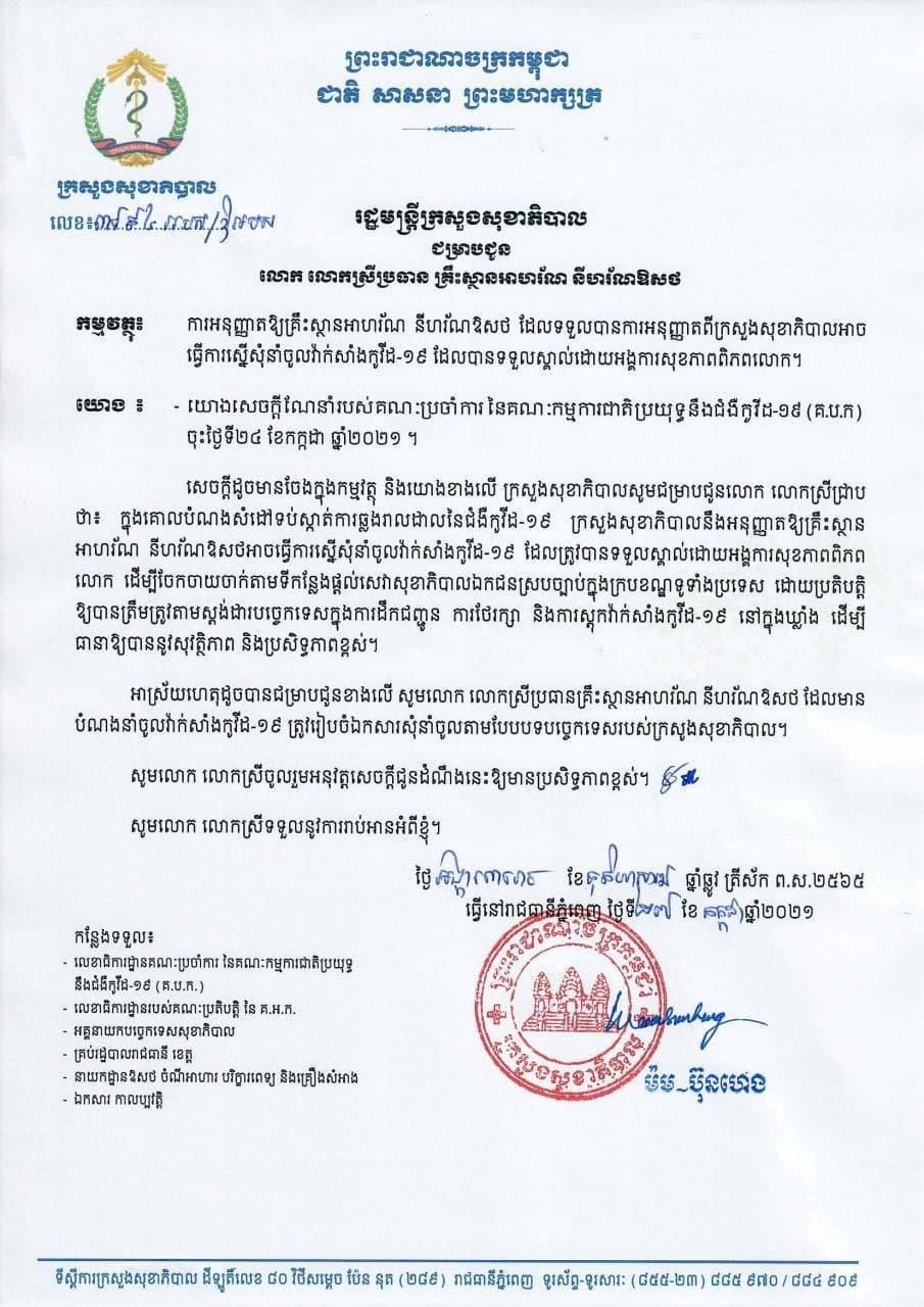 យោងតាមការបញ្ជាក់ពី ក្រសួងសុខាភិបាល បានឲ្យដឹងថា ក្នុងគោលបំណងសំដៅទប់ស្កាត់ការឆ្លងរាលដាលនៃជំងឺកូវីដ១៩ ក្រសួងសុខាភិបាលនឹងអនុញ្ញាតឲ្យគ្រឹះស្ថានអាហ័រណ នីហរ័ណ ឱសថអាចធ្វើការស្នើសុំនាំចូលវ៉ាក់សាំងកូវីដ១៩ ដែលត្រូវបានទទួលស្គាល់ដោយអង្គការសុខភាពពិភពលោក ដើម្បីចែកចាយចាក់តាមទីកន្លែងផ្តល់សេវាសុខាភិបាលឯកជនស្របច្បាប់ក្នុងក្របខណ្ឌទូទាំងប្រទេស ដោយប្រតិបត្តិឲ្យបានត្រឹមត្រូវតាមស្តង់ដារបច្ចេកទេសក្នុងការដឹកជញ្ជូន ការថែរក្សា និងការស្តុកវ៉ាក់សាំងកូវីដ១៩ នៅក្នុងឃ្លាំង ដើម្បីធានឲ្យបាននូវសុវត្ថិភាព និងប្រសិទ្ធភាពខ្ពស់៕