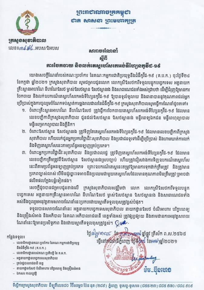 ក្រសួងសុខាភិបាលនៃព្រះរាជាណាចក្រកម្ពុជា បានចេញសេចក្តីណែនាំជូនលោក លោកស្រីឱសថការីទទួលបន្ទុកបច្ចេកទេស អគ្គនាយកគ្រឹះស្ថានអាហរ័ណ នីហរ័ណ ម្ចាស់ឱសថស្ថាន ឱសថស្ថានរង និងសាធារណជនទាំងអស់ជ្រាបថា ដើម្បីជំរុញឲ្យមានការចែកចាយ និងលក់ឧបករណ៍តេស្តរហ័សអង់ទីហ្សែនកូវីដ១៩ ឲ្យបានទូលំទូលាយ និងធានាបាននូវគុណភាពដល់អ្នកប្រើប្រាស់ក្នុងការចូលរួមចំណែកទប់ស្កាត់ការឆ្លងរាលដាលនៃជំងឺកូវីដ១៩ ក្រសួងសុខាភិបាលសូមធ្វើការណែនាំដូចខាងក្រោម៖