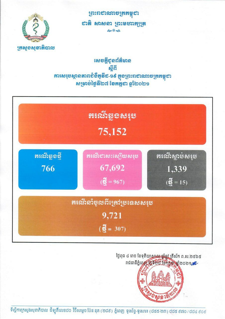 នៅថ្ងៃទី28 ខែកក្កដា ឆ្នាំ2021នេះ ក្រសួងសុខាភិបាលកម្ពុជា បានចេញសេចក្តីជូនដំណឹងពី ការរកឃើញករណីវិជ្ជមានវីរុសកូវីដ១៩ថ្មី ចំនួន 766នាក់ ខណៈអ្នកបានជាសះស្បើយថ្មីមានចំនួន 967នាក់ និងមានអ្នកបាត់បង់ជីវិត 15នាក់។ គិតមកទល់ពេលនេះ ករណីឆ្លងកូវីដ១៩ សរុបនៅក្នុងប្រទេសកម្ពុជា មានចំនួន 75,152នាក់, ករណីជាសះស្បើយសរុប 67,692នាក់ និងស្លាប់សរុប 1,339នាក់៕