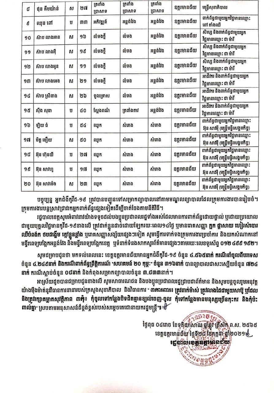 បើតាមសេចក្តីប្រកាសព័ត៌មានរបស់រដ្ឋបាលខេត្តឧត្តរមានជ័យ បានបញ្ជាក់ថា ក្នុងចំណោមអ្នកជំងឺកូវីដទាំង ២០១នាក់ ក្នុងនោះមានអ្នកជំងឺចំនួន ១២នាក់ ជាពលករកំពុងធ្វើចត្តាឡីស័ក និងចំនួន១៦៩នាក់ទៀត ជាពលករទើបមកពីប្រទេសថៃ តាមច្រកអន្តរជាតិអូរស្មាច់ និងចំនួន ២០នាក់ទៀត ក្នុងព្រឹត្តិការណ៍សហគមន៍ ២០ កុម្ភៈ។