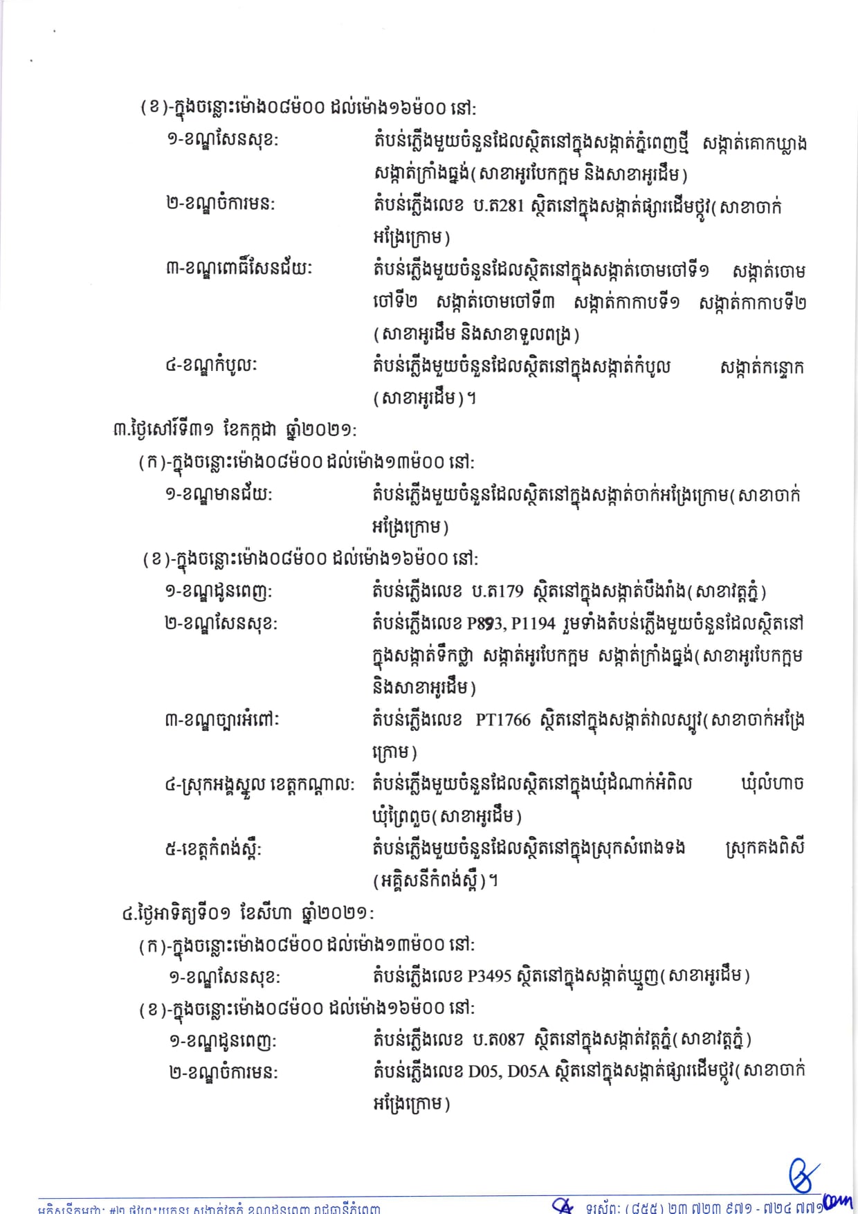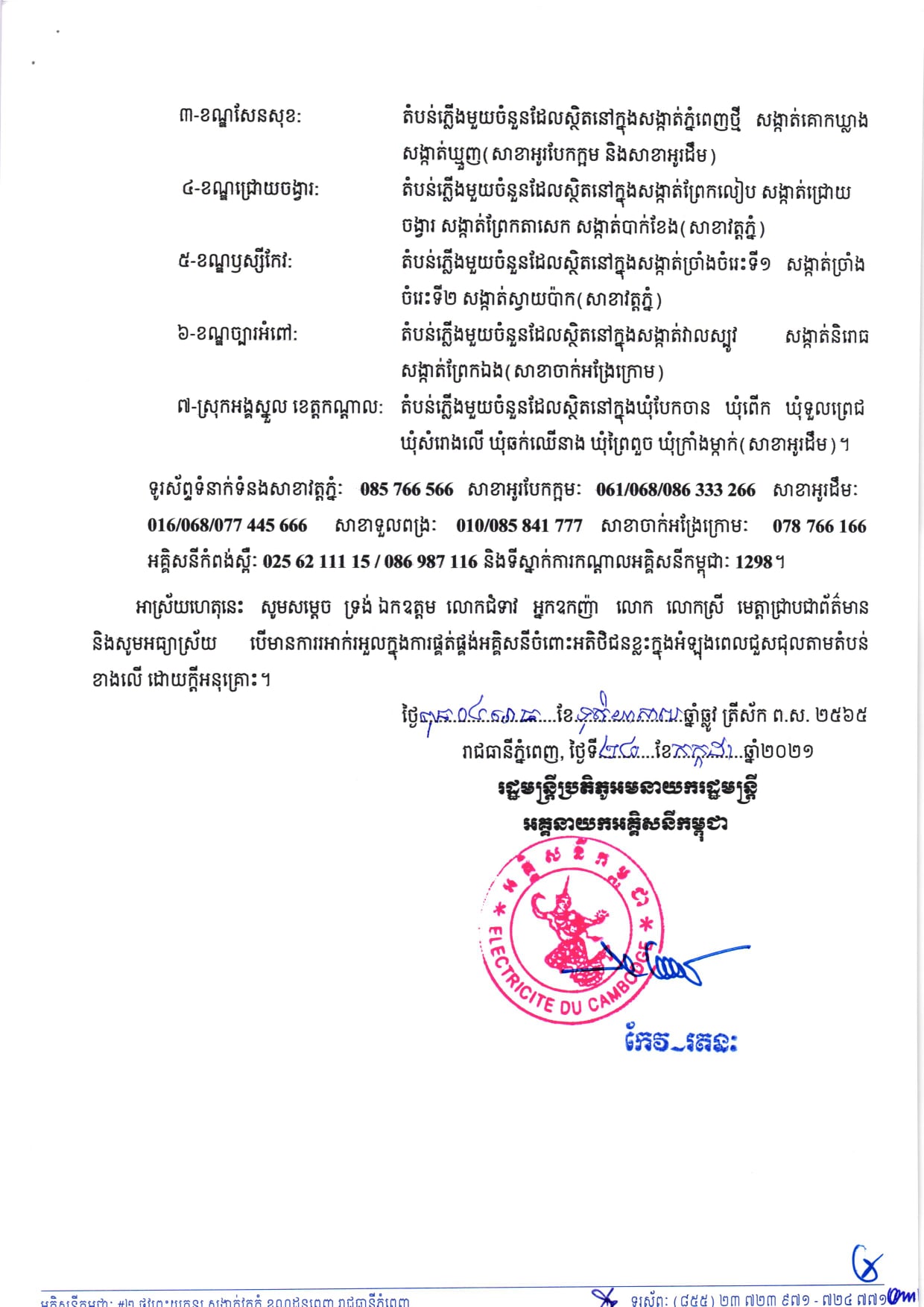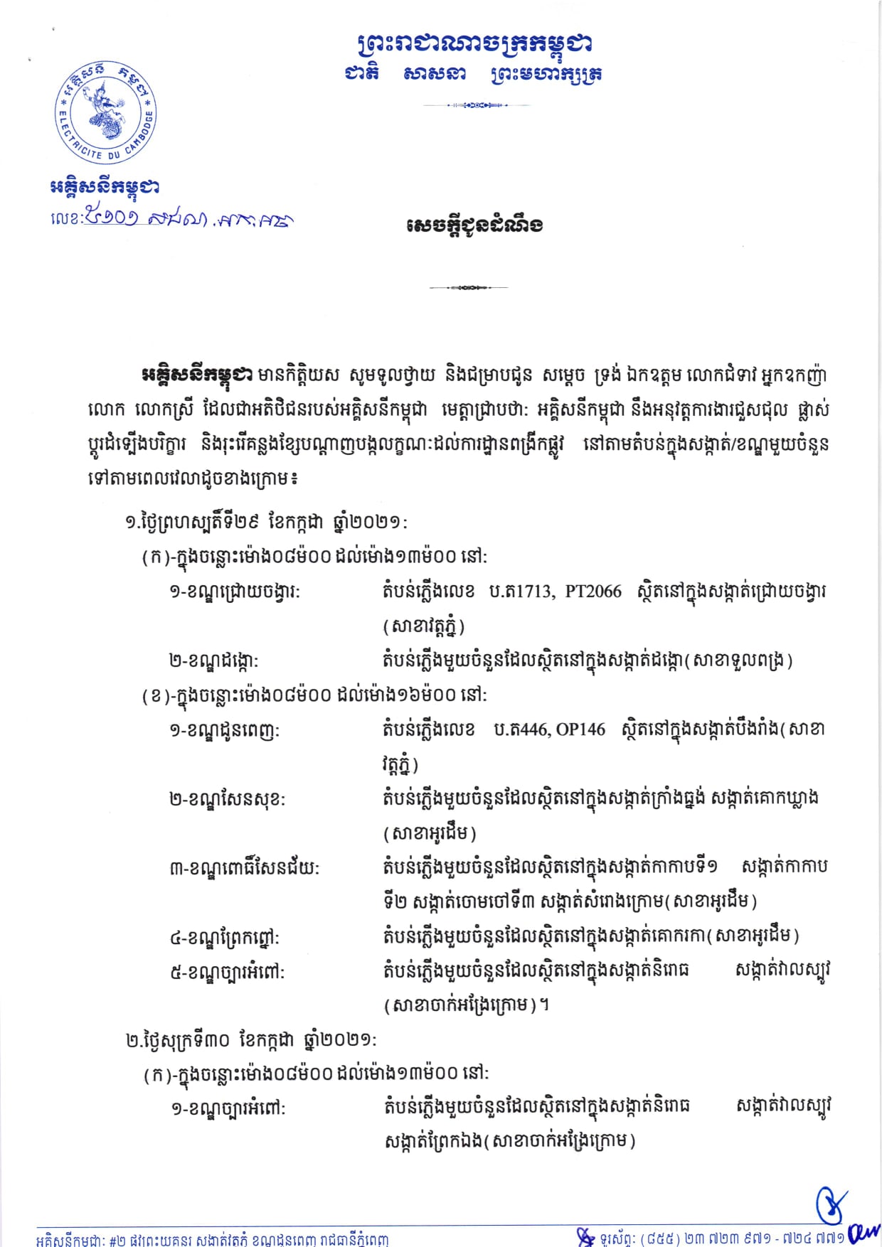រាជធានីភ្នំពេញ៖ យោងតាមការចុះផ្សាយរបស់ អគ្គិសនីកម្ពុជា បានចេញសេចក្តីជូនដំណឹងស្តីពីការអនុវត្តការងារជួសជុល ផ្លាស់ប្តូរ តម្លើងបរិក្ខារនានា និងរុះរើគន្លងខ្សែបណ្តាញអគ្គិសនីរបស់អគ្គិសនីកម្ពុជា ដើម្បីបង្កលក្ខណៈងាយស្រួលដល់ការដ្ឋានពង្រីកផ្លូវ នៅថ្ងៃទី២៩ ខែកក្កដា ឆ្នាំ២០២១ ដល់ថ្ងៃទី០១ ខែសីហា ឆ្នាំ២០២១ នៅតំបន់មួយចំនួនទៅតាមពេលវេលា និងទីកន្លែងដូចសេចក្តីជូនដំណឹងលម្អិតខាងក្រោម។ ទោះជាមានការខិតខំថែរក្សាមិនឲ្យមានការប៉ះពាល់ដល់ការផ្គត់ផ្គង់អគ្គិសនីធំដុំ ប៉ុន្តែការផ្គត់ផ្គង់ចរន្តអគ្គិសនីនៅតំបន់ខាងលើអាចនឹងមានការរអាក់រអួលខ្លះៗជៀសមិនផុតដែលយើងខ្ញុំស្នើសុំអភ័យទោសទុកជាមុន។