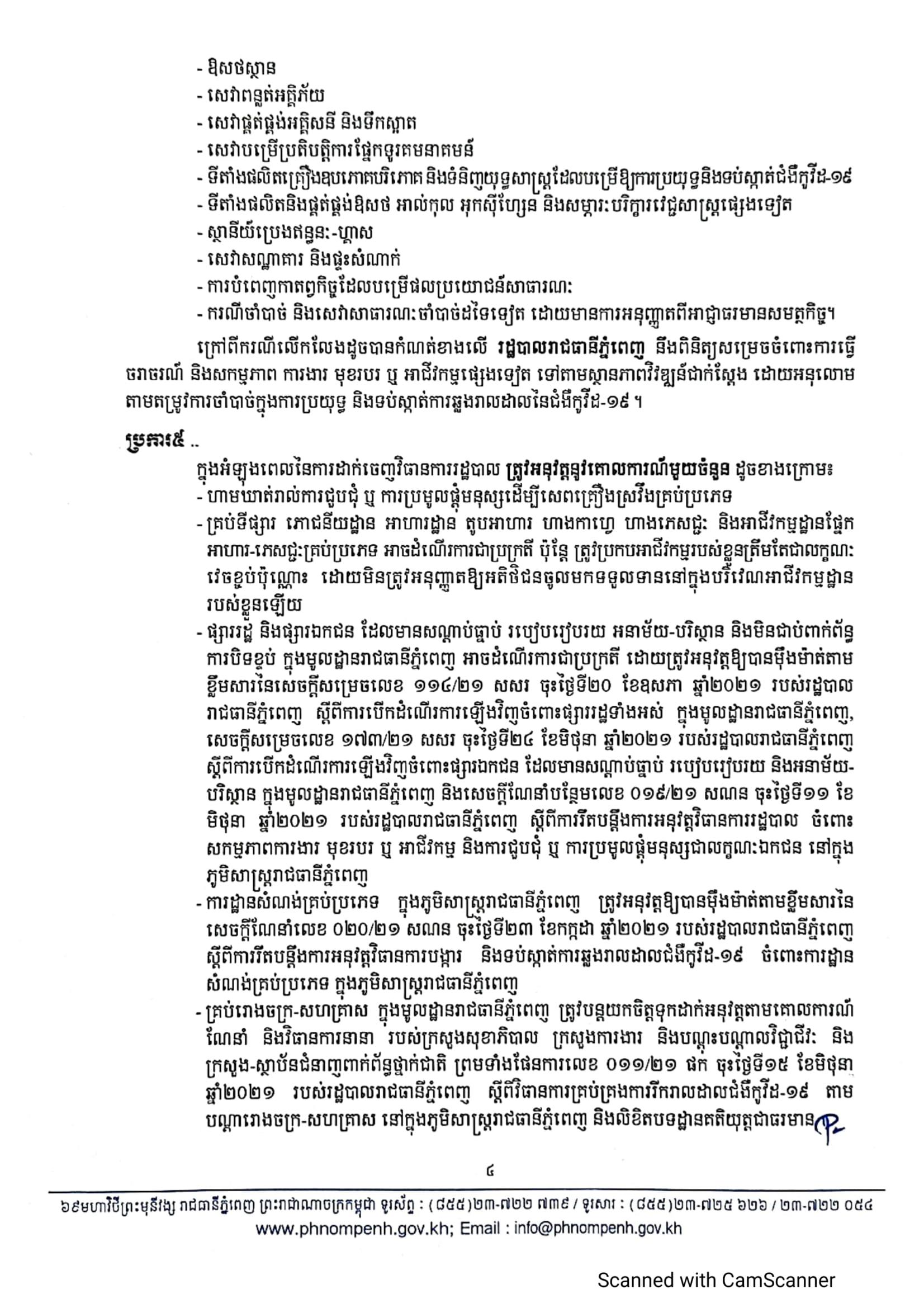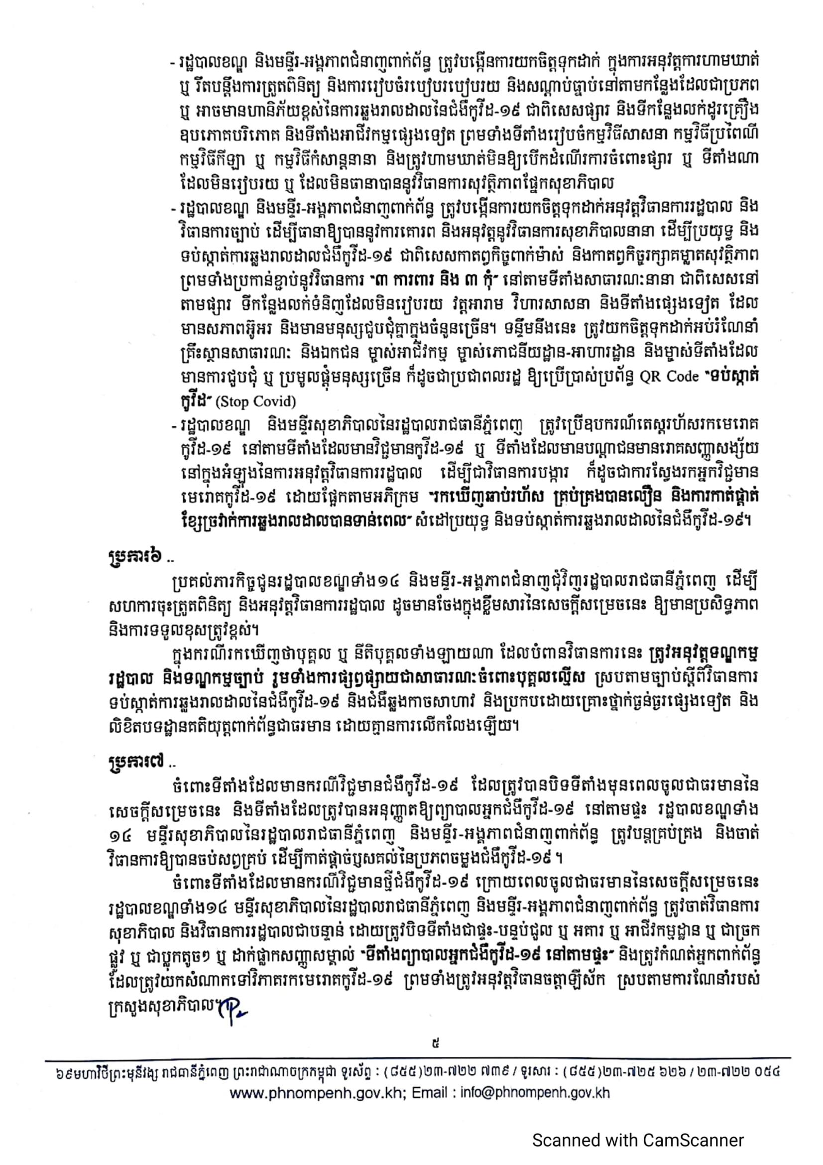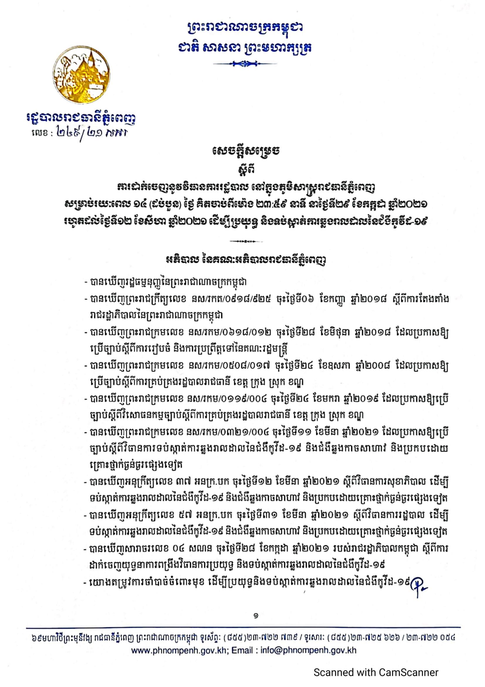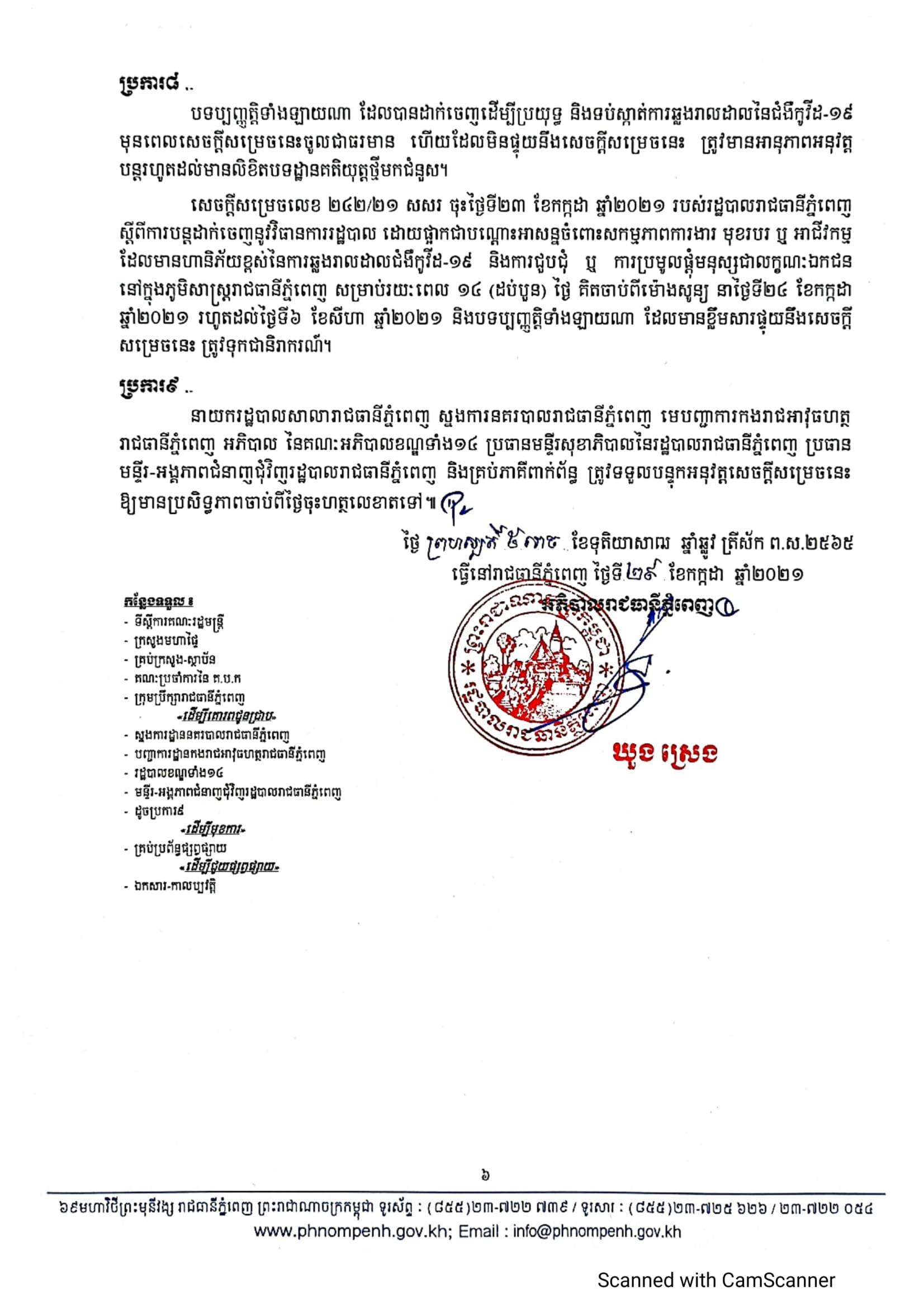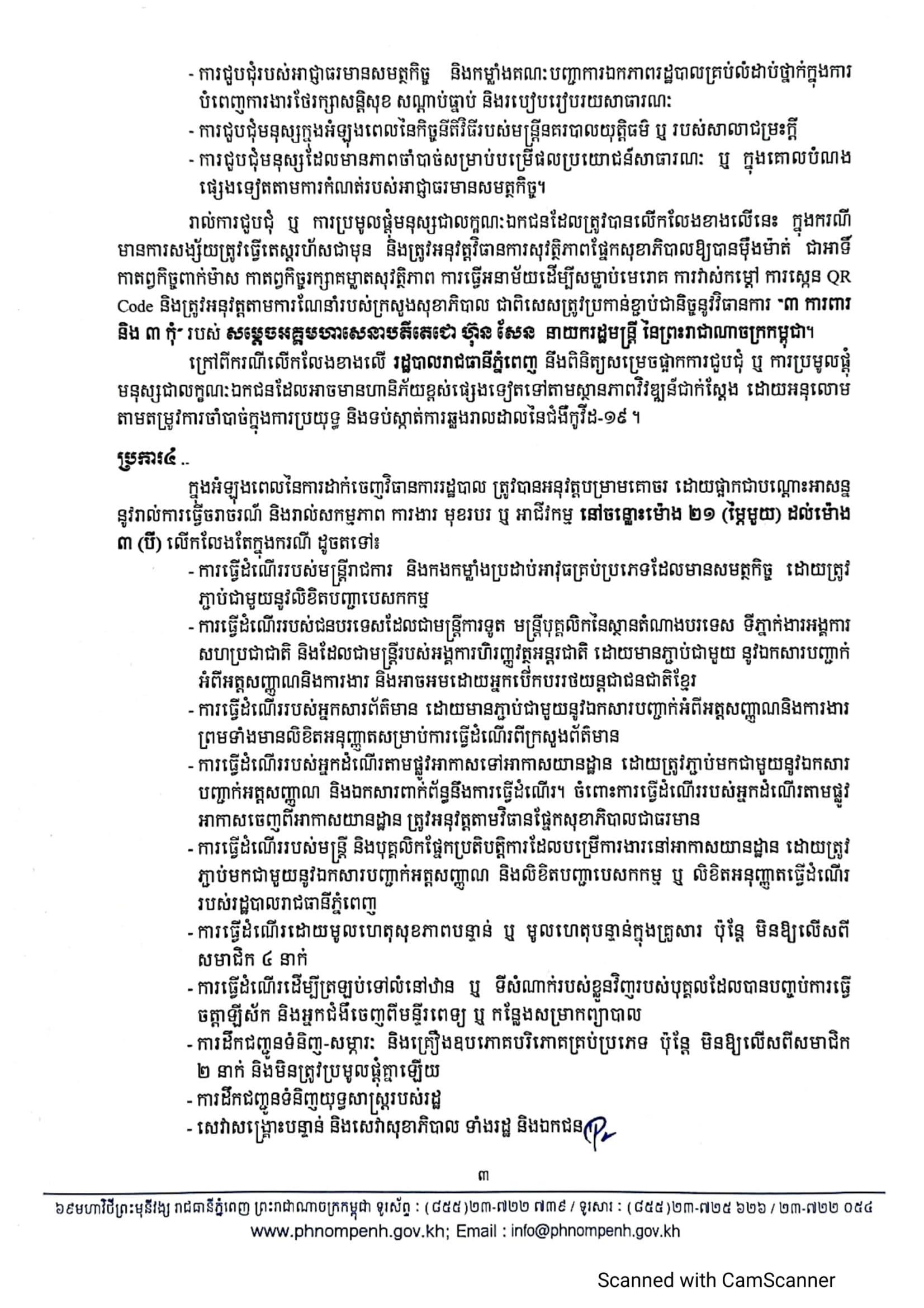 នៅក្នុងសេចក្តីសម្រេចខាងលើនេះ អភិបាលរាជធានីភ្នំពេញ បានសម្រេចដាក់បម្រាមគោចរ ដោយផ្អាកបណ្តោះអាសន្ននូវរាល់ការធ្វើចរាចរណ៍ និងរាល់សកម្មភាព ការងារ មុខរបរ ឬអាជីវកម្មនៅចន្លោះម៉ោង ៩យប់ដល់ម៉ោង ៣ទៀបភ្លឺ និងបម្រាមជាច្រើនទៀត។ សូមអានសេចក្តីសម្រេចខាងក្រោមនេះ៖