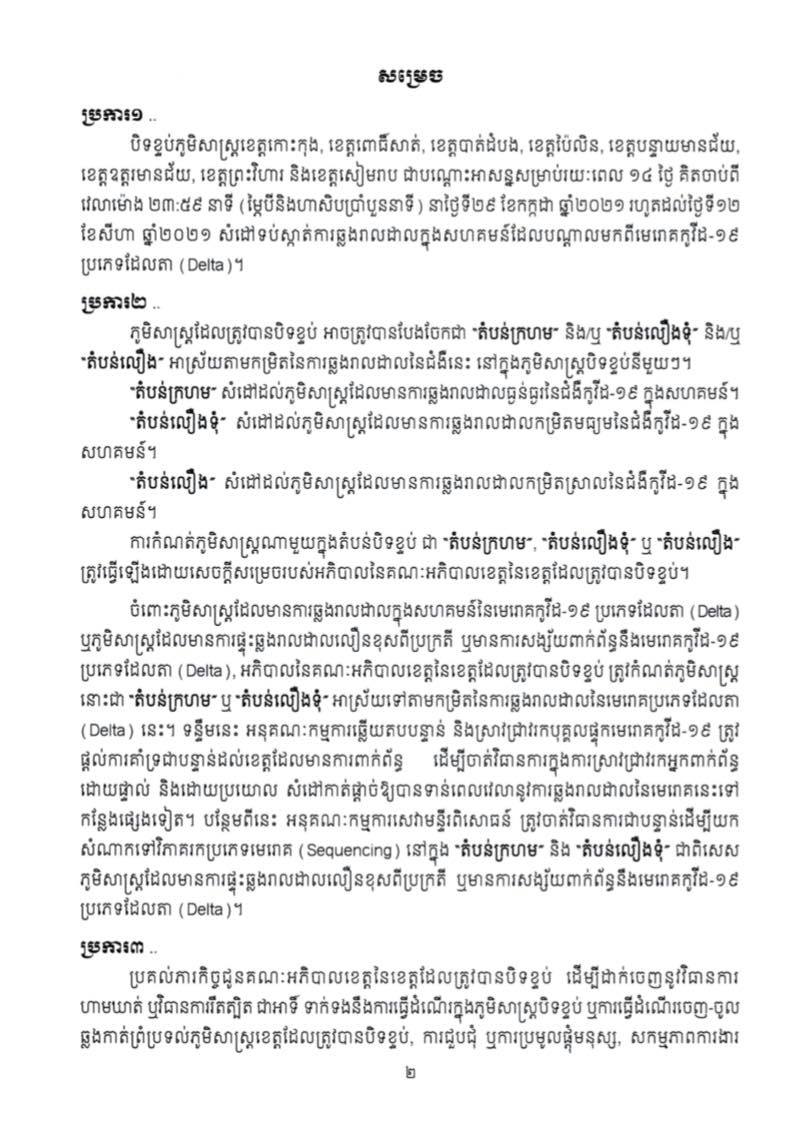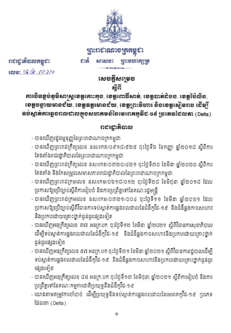 កាលពីយប់ថ្ងៃទី២៨ ខែកក្កដា ឆ្នាំ២០២១ រាជរដ្ឋាភិបាលកម្ពុជា បានចេញសេចក្តីសម្រេចស្តីពីការបិទខ្ទប់ភូមិសាស្រ្តខេត្តកោះកុង,ខេត្តពោធិ៍សាត់,ខេត្តបាត់ដំបង,ខេត្តប៉ៃលិន,ខេត្តបន្ទាយមានជ័យ,ខេត្តឧត្ដរមានជ័យ,ខេត្តព្រះវិហារ និងខេត្តសៀមរាប រយៈពេល១៤ថ្ងៃ គិតចាប់ពី២៣:៥៩នាទីថ្ងៃទី២៩ ខែកក្កដា ឆ្នាំ២០២១ រហូតដល់ថ្ងៃទី១២ ខែសីហា ឆ្នាំ២០២១ ដើម្បីសំដៅទប់ស្កាត់ការឆ្លងរាលដាលក្នុងសហគមន៍នៃមេរោគកូវីដ១៩ ប្រភេទដែលតា(Delta)។