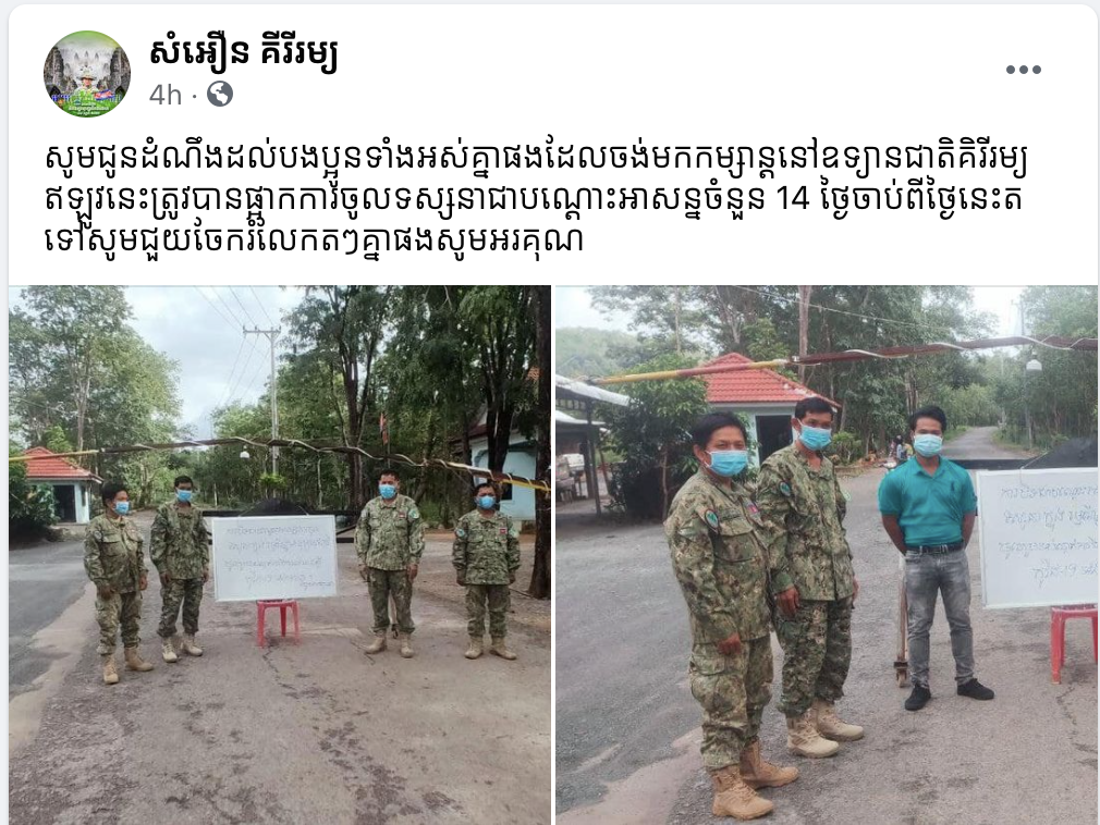 ស្របតាមសេចក្តីប្រកាសបិទខ្ទប់ខេត្តចំនួន៨ របស់រាជរដ្ឋាភិបាលនេះផងដែរ នៅតំបន់ឧទ្យានជាតិគិរីរម្យក៏បានធ្វើការបិទការចូលទស្សនារយៈពេល១៤ថ្ងៃផងដែរ។ យោងតាមគណនីហ្វេសប៊ុក សំអឿន គីរីរម្យ បានឲ្យដឹងថា “សូមជូនដំណឹងដល់បងប្អូនទាំងអស់គ្នាផងដែលចង់មកកម្សាន្តនៅឧទ្យានជាតិគិរីរម្យឥឡូវនេះត្រូវបានផ្អាកការចូលទស្សនាជាបណ្ដោះអាសន្នចំនួន 14 ថ្ងៃចាប់ពីថ្ងៃនេះតទៅសូមជួយចែករំលែកតៗគ្នាផងសូមអរគុណ”៕