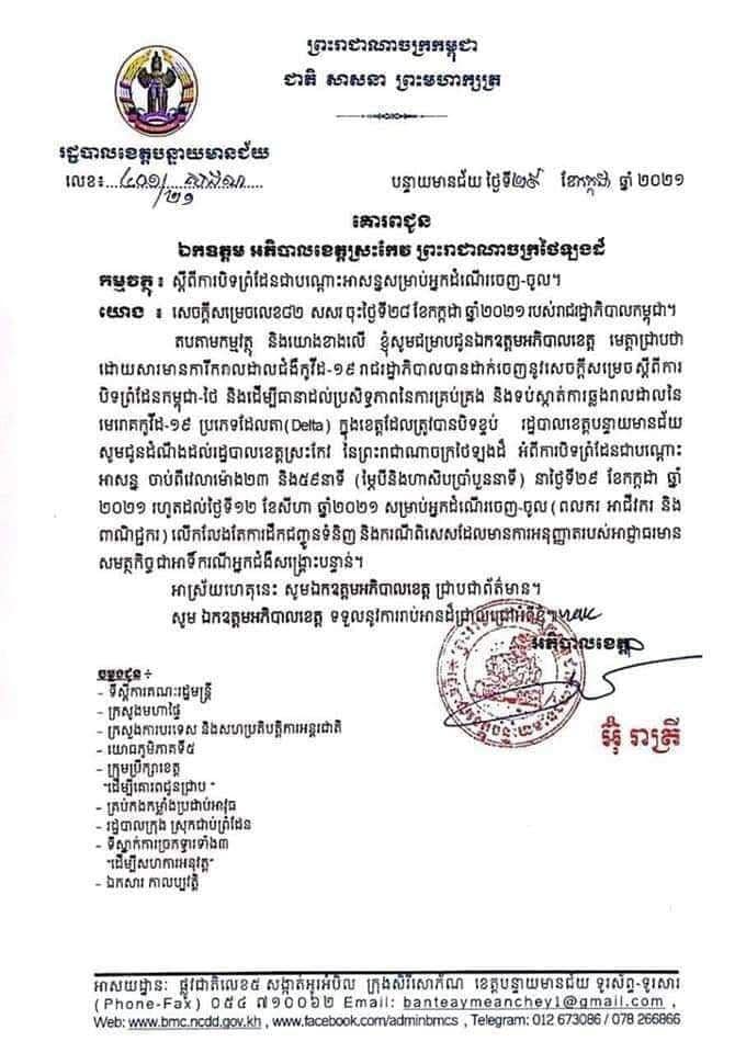 រដ្ឋបាលខេត្តបន្ទាយមានជ័យ សូមជូនដំណឹងដល់រដ្ឋបាលខេត្តស្រះកែវ នៃព្រះរាជាណាចក្រថៃឡងដ៍ អំពីការបិទព្រំដែនជាណ្ដោះអាសន្ន ចាប់ពីវេលាម៉ោង២៣ និង៥៩នាទី នាថ្ងៃទី២៩ ខែកក្កដា ឆ្នាំ២០២១ រហូតដល់ថ្ងៃទី១២ ខែសីហា ឆ្នាំ២០២១ សម្រាប់អ្នកដំណើរចេញ-ចូល (ពលករ អាជីវករ និងពាណិជ្ជករ) លើកលែងតែការដឹកជញ្ជូនទំនិញ និងករណីពិសេសដែលមានការអនុញ្ញាតរបស់អាជ្ញាធរមានសមត្ថកិច្ចជាអាទិ៍ករណីអ្នកជំងឺសង្គ្រោះបន្ទាន់ ៕