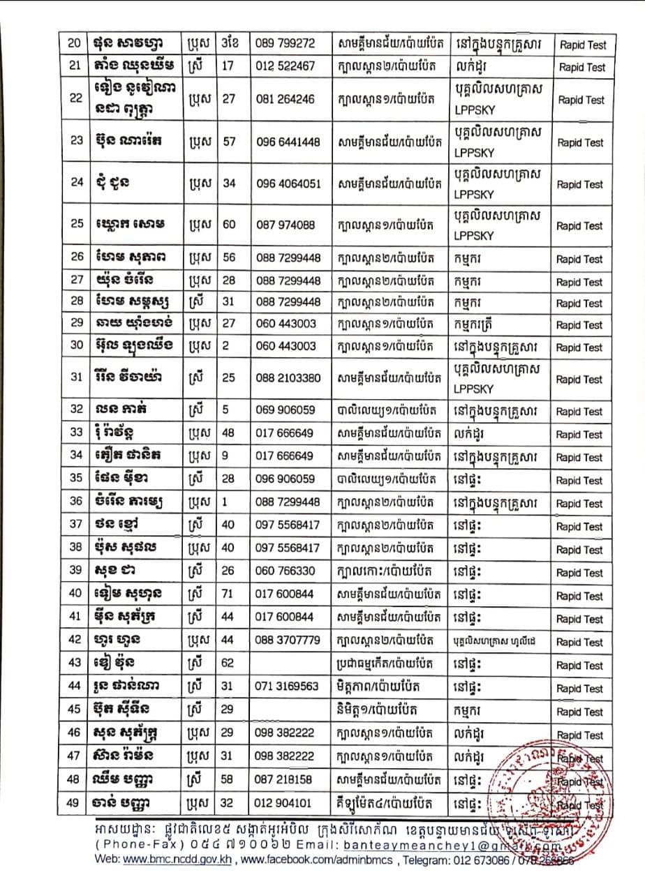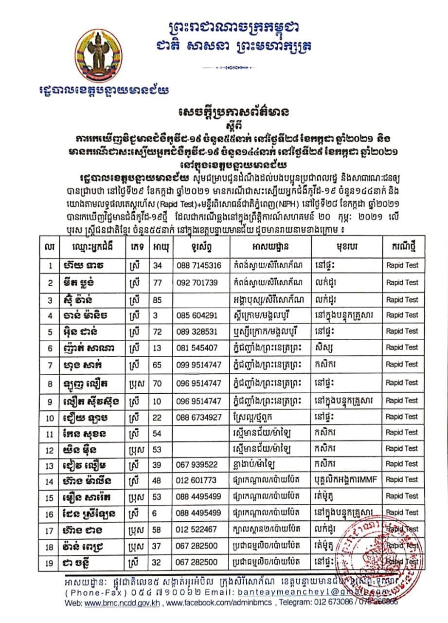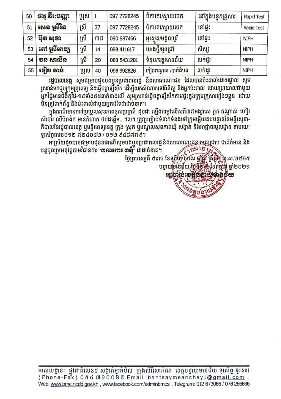 ខេត្តបន្ទាយមានជ័យ៖ យោងតាមការចុះផ្សាយរបស់ រដ្ឋបាលខេត្តបន្ទាយមានជ័យ បានចេញសេចក្តីប្រកាសព័ត៌មាន បន្តរកឃើញអ្នកវិជ្ជមានកូវីដ១៩ ចំនួន ៥៥នាក់ និងមានអ្នកជាសះស្បើយចំនួន ១៤៤នាក់ នៅថ្ងៃទី២៩ ខែកក្កដា ឆ្នាំ២០២១ ដោយយោងតាមលទ្ធផលតេស្តរហ័ស(Rapid Test) មន្ទីរពិសោធន៍ជាតិភ្នំពេញ(NIPH) បានរកឃើញវិជ្ជមានកូវីដ-១៩ថ្មី ដែលជាករណីឆ្លងនៅក្នុងព្រឹត្តិការណ៍សហគមន៍ ២០ កុម្ភៈ ២០២១ លើបុរស ស្រ្តីជនជាតិខ្មែរ ចំនួន ៥៥នាក់ នៅក្នុងខេត្តបន្ទាយមានជ័យ ដូចមានរាយនាមខាងក្រោម៖