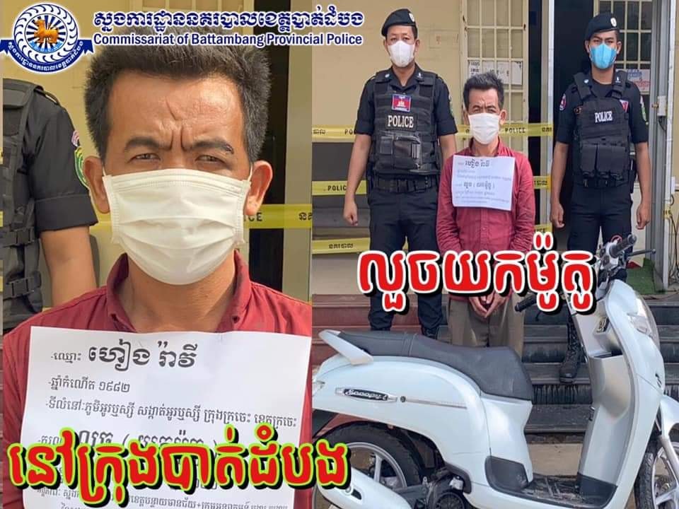 លួចម៉ូតូពីខេត្តបាត់ដំបង ជិះរត់គេចខ្លួនដល់ស្រុកមង្គលបូរី ខេត្តបន្ទាយមានជ័យ ត្រូវសមត្ថកិច្ចតាមចាប់ខ្លួនបានទាំងមនុស្សទាំងម៉ូតូ