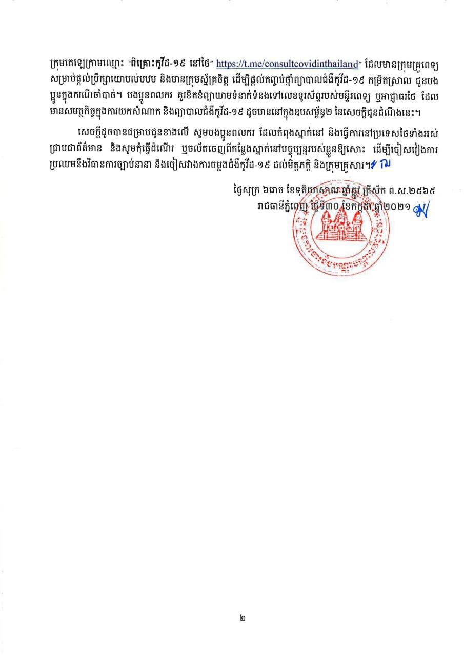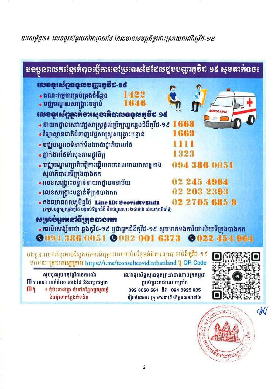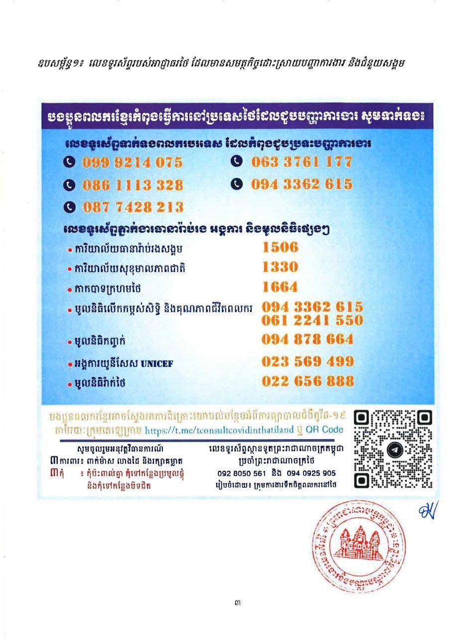 ប្រសិនជាបងប្អូនពលករខ្មែរជួបបញ្ហាការងារ និងជួបបញ្ហាកូវីដ គឺអាចទំនាក់ទំនងទៅស្ថានឯកអគ្គរាជទូតព្រះរាជាណាចក្រកម្ពុជាប្រចាំប្រទេសថៃ តាមរយៈលេខទូរស័ព្ទខាងក្រោម៖