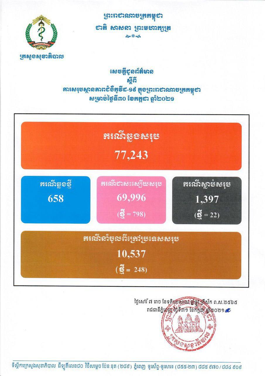 នៅថ្ងៃទី31 ខែកក្កដា ឆ្នាំ2021នេះ ក្រសួងសុខាភិបាលកម្ពុជា បានចេញសេចក្តីជូនដំណឹងពី ការរកឃើញករណីវិជ្ជមានវីរុសកូវីដ១៩ថ្មី ចំនួន 658នាក់ ខណៈអ្នកបានជាសះស្បើយថ្មីមានចំនួន 798នាក់ និងមានអ្នកបាត់បង់ជីវិត 22នាក់។ គិតមកទល់ពេលនេះ ករណីឆ្លងកូវីដ១៩ សរុបនៅក្នុងប្រទេសកម្ពុជា មានចំនួន 77,243នាក់, ករណីជាសះស្បើយសរុប 69,996នាក់ និងស្លាប់សរុប 1,397នាក់៕