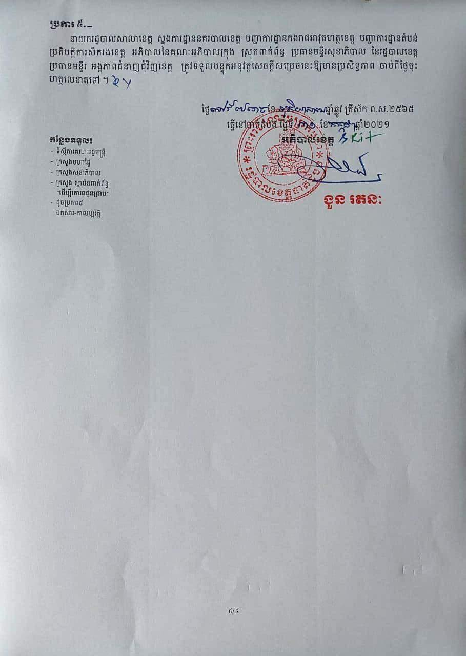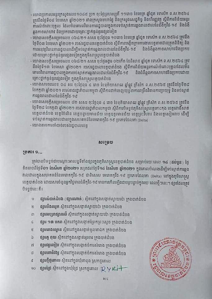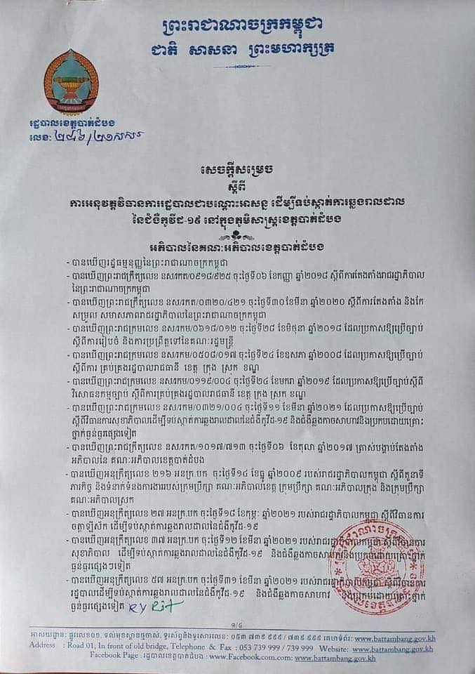 ខេត្តបាត់ដំបង៖ យោងតាមការចុះផ្សាយរបស់ រដ្ឋបាលខេត្តបាត់ដំបង នៅថ្ងៃទី៣១ ខែកក្កដា ឆ្នាំ២០២១ បានចេញសេចក្ដីសម្រេច ស្ដីពីការអនុវត្តវិធានការរដ្ឋបាលជាបណ្ដោះអាសន្ន ដើម្បីទប់ស្កាត់ការឆ្លងរាលដាល នៃជំងឺកូវីដ-១៩ នៅក្នុងភូមិសាស្ត្រខេត្តបាត់ដំបង។