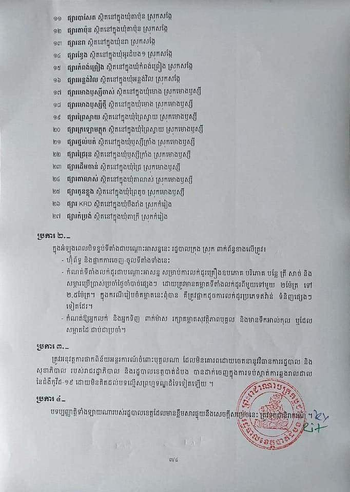 រដ្ឋបាល​ខេត្ត​បាត់ដំបង​ សម្រេចបិទខ្ទប់​ផ្សារចំនួន២៧ នៅក្នុង​ភូមិសាស្ត្រ​ខេត្តបាត់ដំបង​ រយៈពេល​ ១៤​ថ្ងៃ​