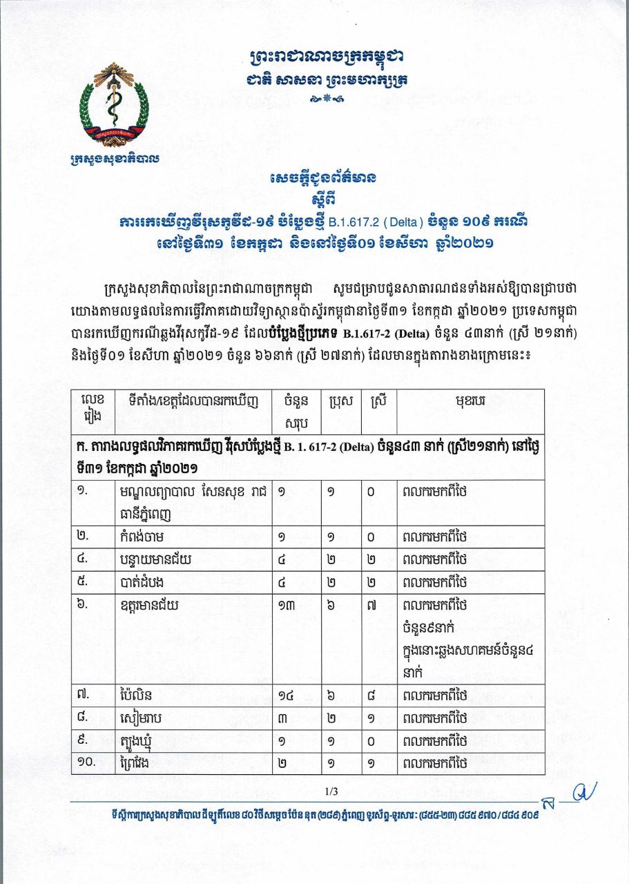 យោងតាមសេចក្តីប្រកាសដែលលោកជំទាវវេជ្ជបណ្ឌិត ឱ វណ្ណឌីន រដ្ឋលេខាធិការក្រសួងសុខាភិបាល បានផ្តល់ជូនបណ្តាញសារព័ត៌មាន បានឲ្យដឹងថា៖ ក្រសួងសុខាភិបាលកម្ពុជា នៅយប់ថ្ងៃទី០១ ខែសីហា ឆ្នាំ២០២១នេះ បានចេញសេចក្តីប្រកាសរកឃើញវីរុសកូវីដ១៩ បំប្លែងថ្មី (Delta) ចំនួន១០៩ករណី បន្ថែមទៀត