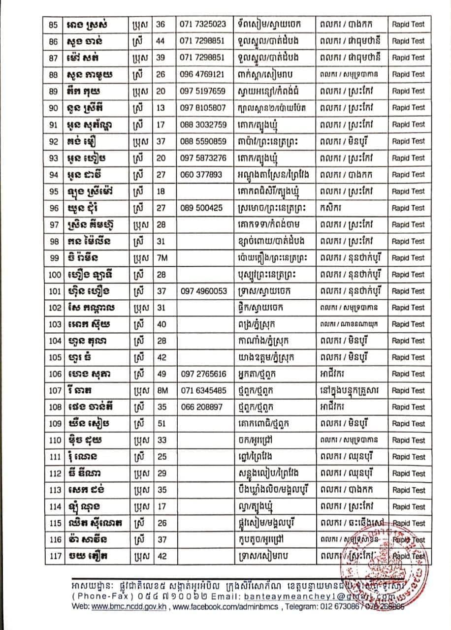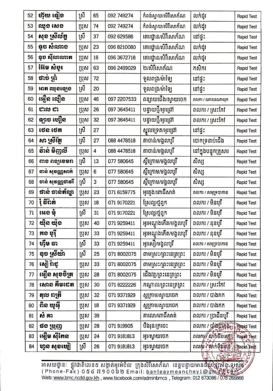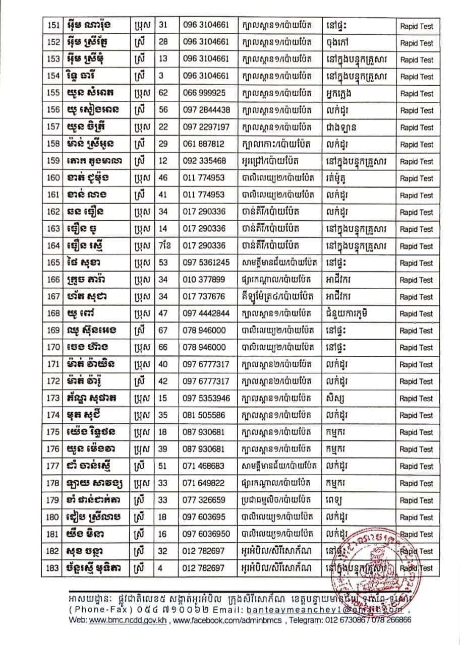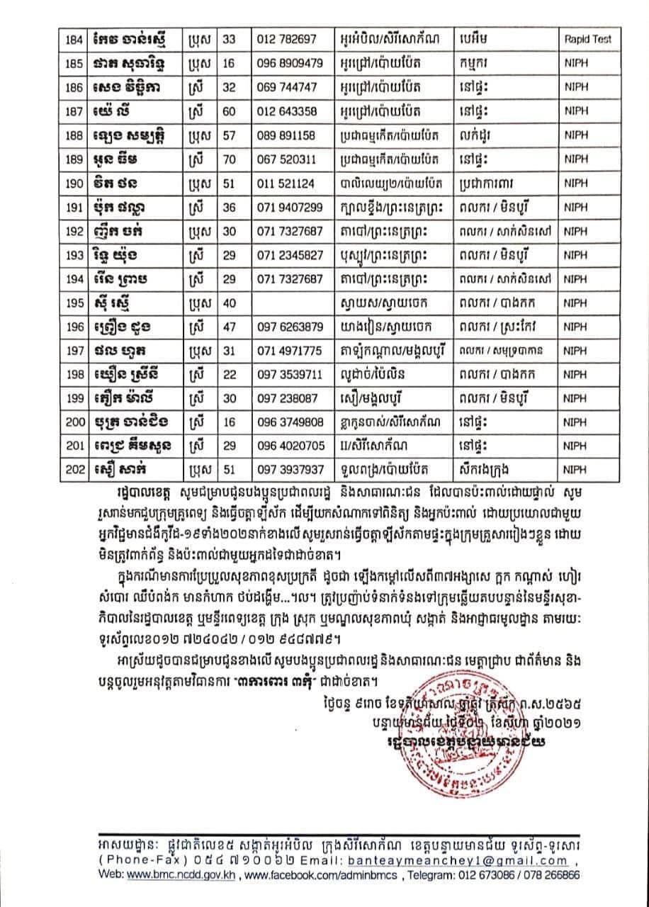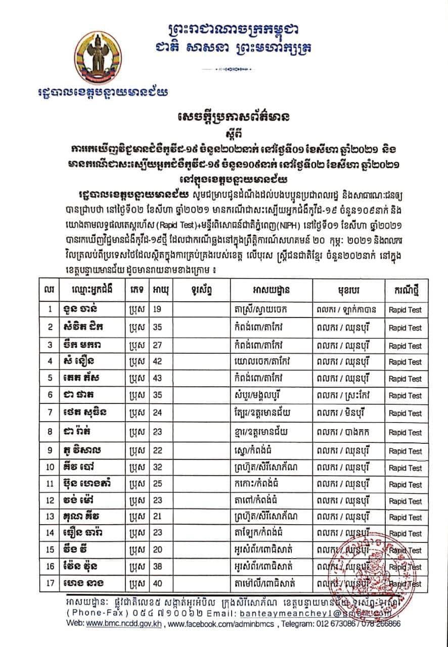 ខេត្តបន្ទាយមានជ័យ៖ យោងតាមការចុះផ្សាយរបស់ រដ្ឋបាលខេត្តបន្ទាយមានជ័យ សូមជម្រាបជូនដំណឹងដល់បងប្អូនប្រជាពលរដ្ឋ និងសាធារណជនឲ្យបានជ្រាបថា នៅថ្ងៃទី០២ ខែសីហា ឆ្នាំ២០២១ មានករណីជាសះស្បើយអ្នកជំងឺកូវីដ-១៩ ចំនួន ១០៩នាក់ និងយោងតាមលទ្ធផលតេស្តរហ័ស (Rapid Test) នៅមន្ទីរពិសោធន៍ជាតិភ្នំពេញ(NIPH) នៅថ្ងៃទី០១​ ខែសីហា ឆ្នាំ២០២១ បានរកឃើញវិជ្ជមានជំងឺកូវីដ-១៩ថ្មី​ ដែលជាករណីឆ្លងក្នុងព្រឹត្តិការណ៍សហគមន៍ ២០ កុម្ភៈ ២០២១ និងពលករវិលត្រឡប់ពីប្រទេសថៃស្ថិតនៅក្នុងការគ្រប់គ្រងរបស់ខេត្ត លើបុរស ស្ត្រីជនជាតិខ្មែរ ចំនួន ២០២នាក់ នៅក្នុងខេត្តបន្ទាយមានជ័យ ដូចមានរាយនាមខាងក្រោម៖