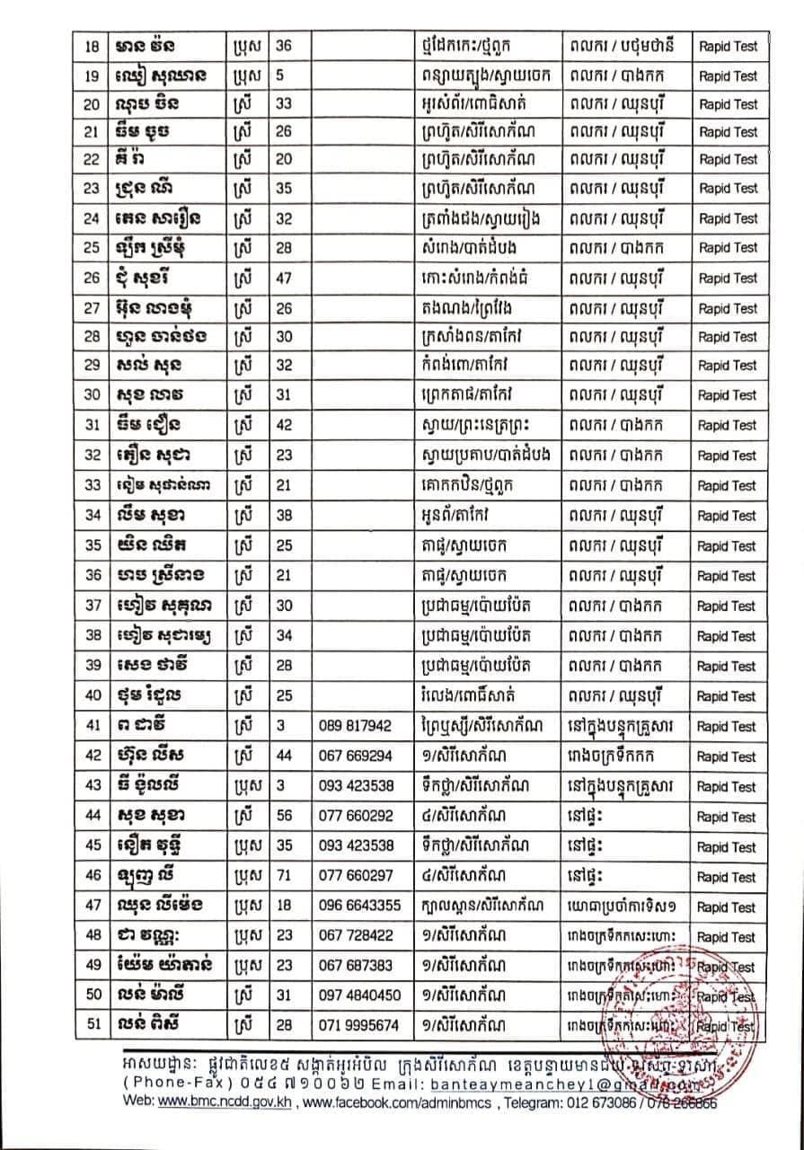 ខេត្តបន្ទាយមានជ័យ រកឃើញអ្នកវិជ្ជមានកូវីដ១៩ថ្មី ចំនួន ២០២នាក់បន្ថែមទៀត ក្នុងនោះមានពលករមកពីថៃ១២១នាក់