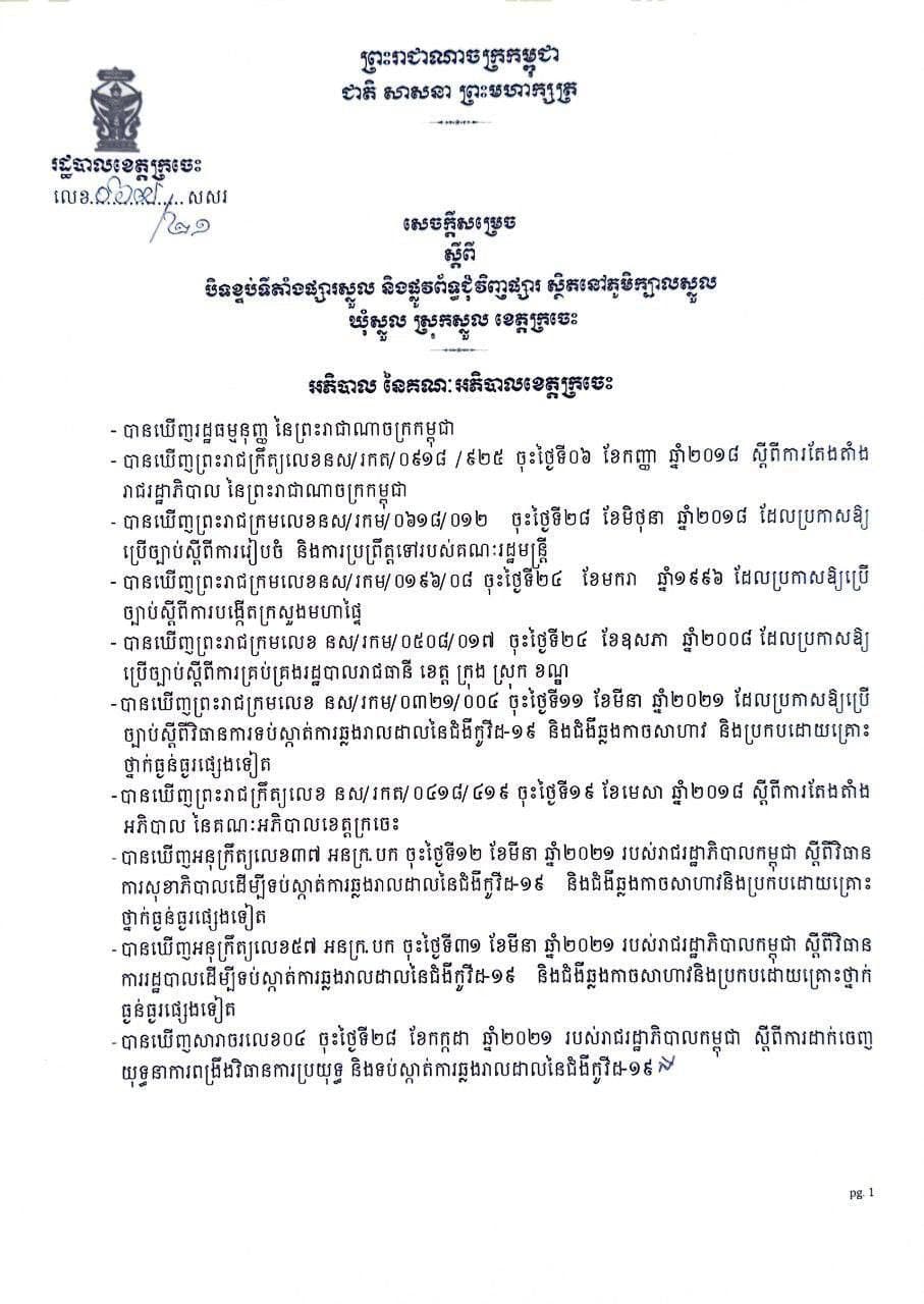 រដ្ឋបាលខេត្តក្រចេះ សម្រេចផ្អាកសកម្មភាពអាជីវកម្មការចេញ-ចូល ទីតាំងផ្សារស្នួលជាបណ្ដោះអាសន្ន