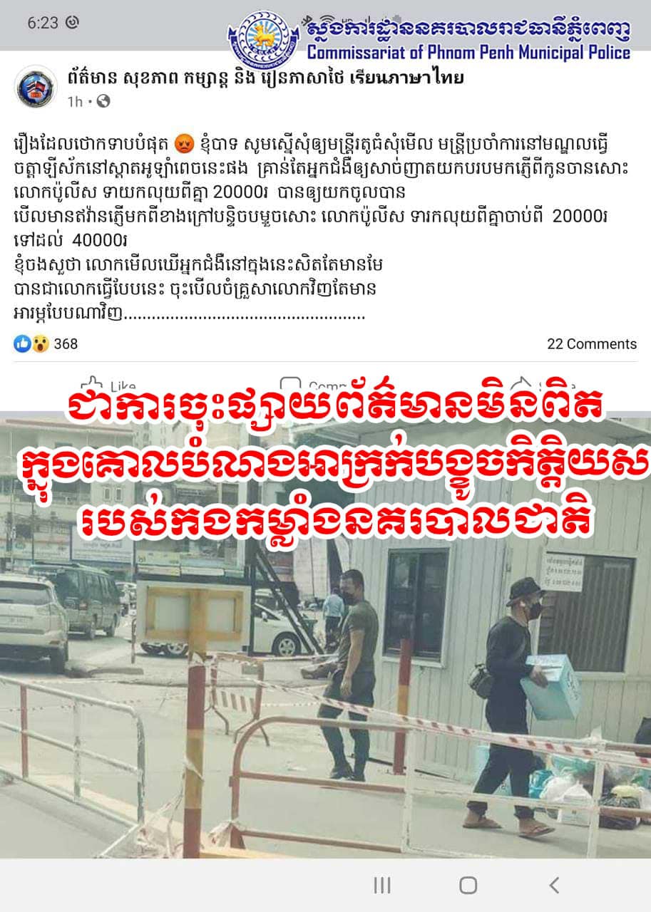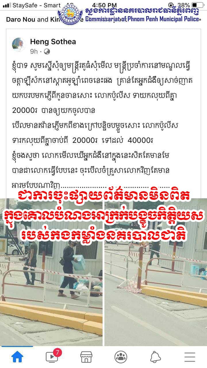 ស្នងការរាជធានីភ្នំពេញ ធ្វើការបកស្រាយបំភ្លឺករណីបង្ហោះក្នុងហ្វេសប៊ុកថា មានមន្ត្រីយកលុយពីប្រជាពលរដ្ឋជាថ្នូរនឹងការចូលយកម្ហូបអាហារឲ្យសាច់ញាតិ ដែលកំពុងសម្រាកព្យាបាលជំងឺកូវីដនៅស្តាតអូឡាំពិក