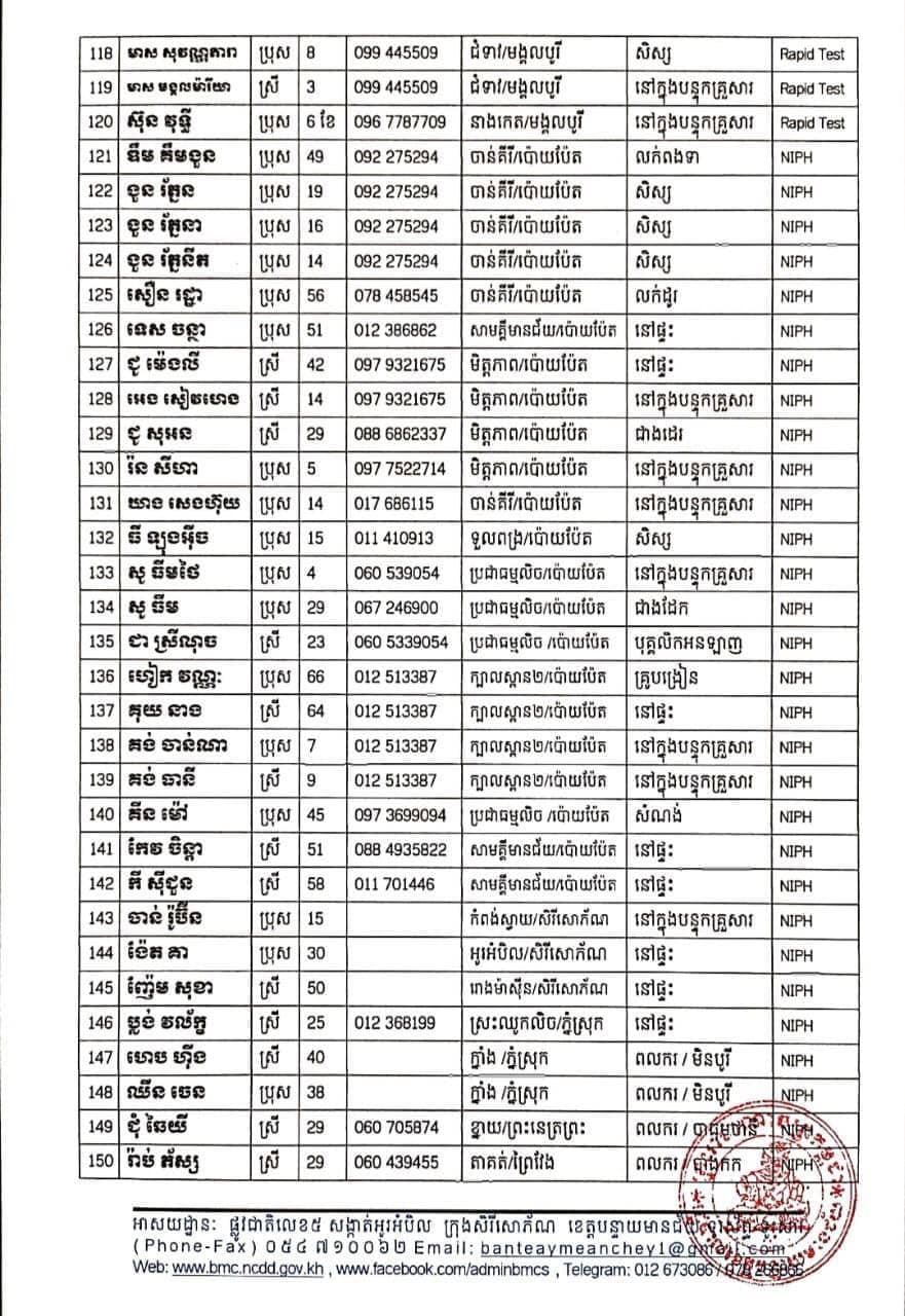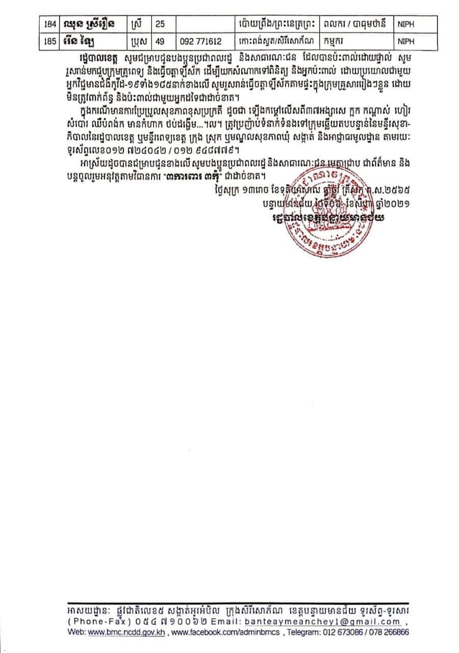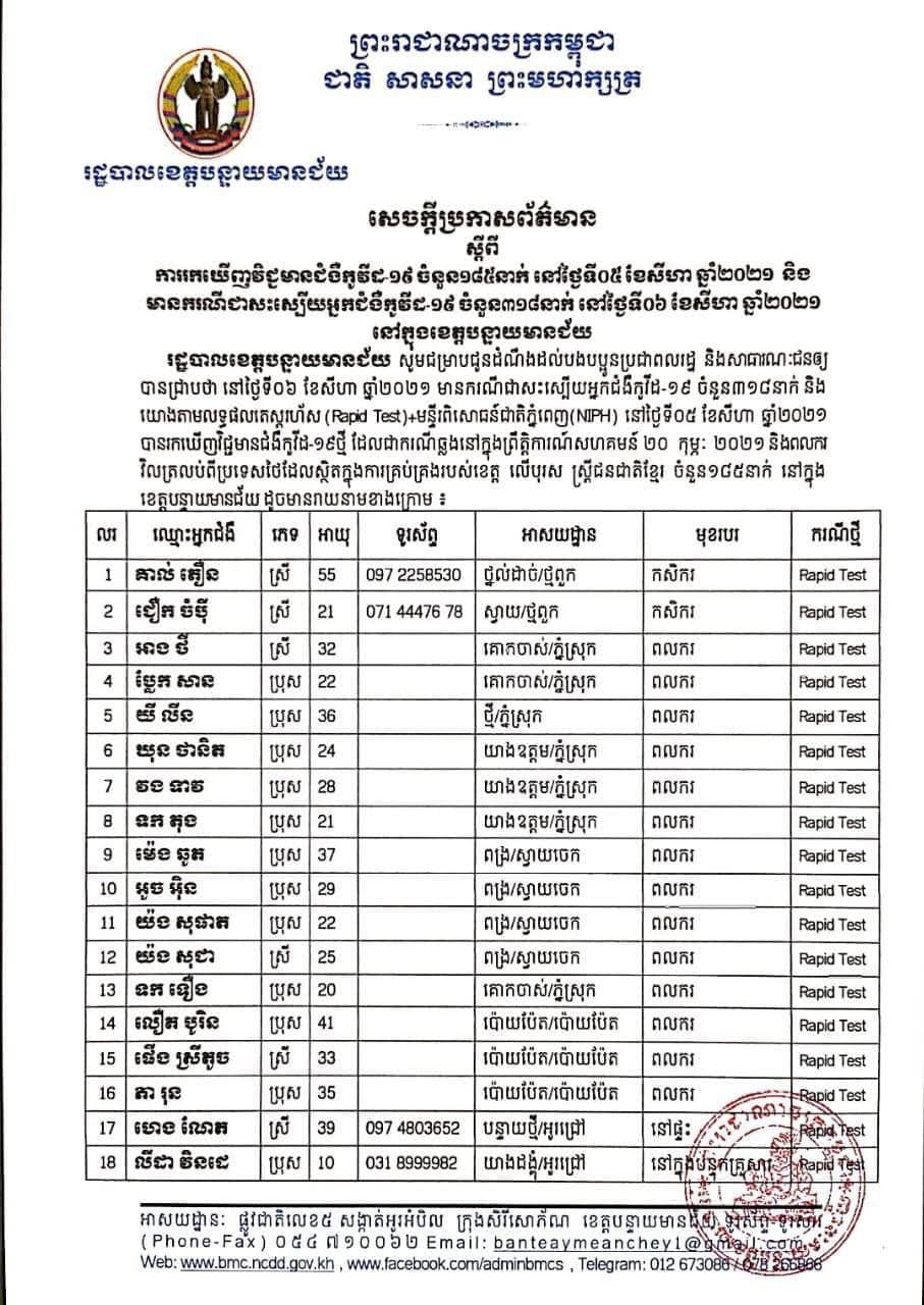 ខេត្តបន្ទាយមានជ័យ៖ យោងតាមសេចក្ដីប្រកាសព័ត៌មានរបស់ រដ្ឋបាលខេត្តបន្ទាយមានជ័យ សូមជម្រាបជូនដំណឹងដល់បងប្អូនប្រជាពលរដ្ឋ និងសាធារណៈជនឲ្យបានជ្រាបថា នៅថ្ងៃទី០៦ ខែសីហា ឆ្នាំ២០២១ មានករណីជាសះស្បើយអ្នកជំងឺកូវីដ-១៩ ចំនួន ៣១៨នាក់ និងយោងតាមលទ្ធផលតេស្តរហ័ស (Rapid Test) មន្ទីរពិសោធន៍ជាតិភ្នំពេញ(NIPH) នៅថ្ងៃទី០៥ ខែសីហា ឆ្នាំ២០២១ បានរកឃើញវិជ្ជមានជំងឺកូវីដ-១៩ថ្មី ដែលករណីឆ្លងនៅក្នុងព្រឹត្តិការណ៍សហគមន៍ ២០កុម្ភៈ ២០២១ និងពលករ វិលត្រឡប់ពីប្រទេសថៃ ដែលស្ថិតក្នុងការគ្រប់គ្រងរបស់ខេត្ត លើបុរស ស្រ្តីជនជាតិខ្មែរ ចំនួន ១៨៥នាក់ នៅក្នុងខេត្តបន្ទាយមានជ័យ ដូចមានរាយនាមខាងក្រោម៖