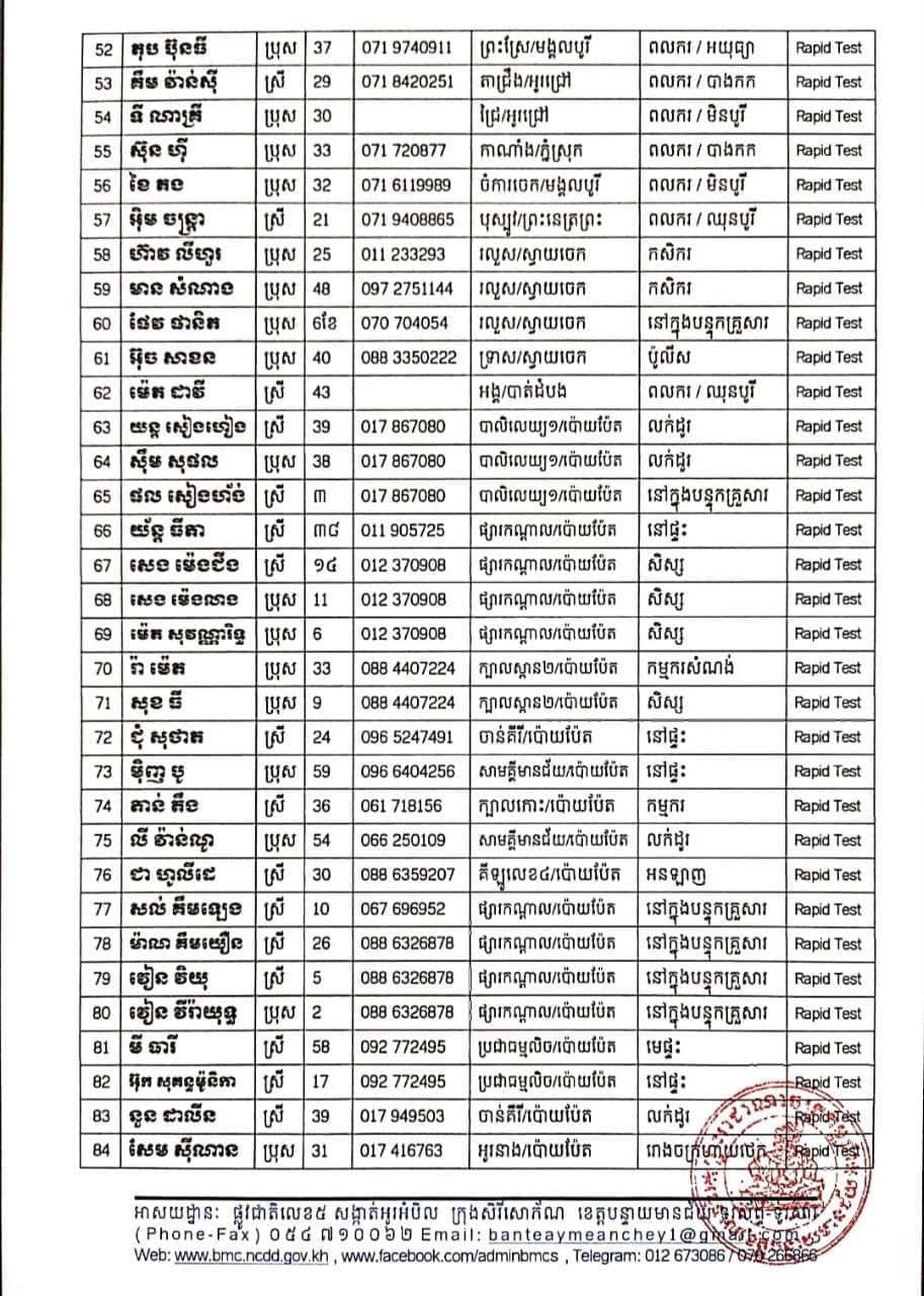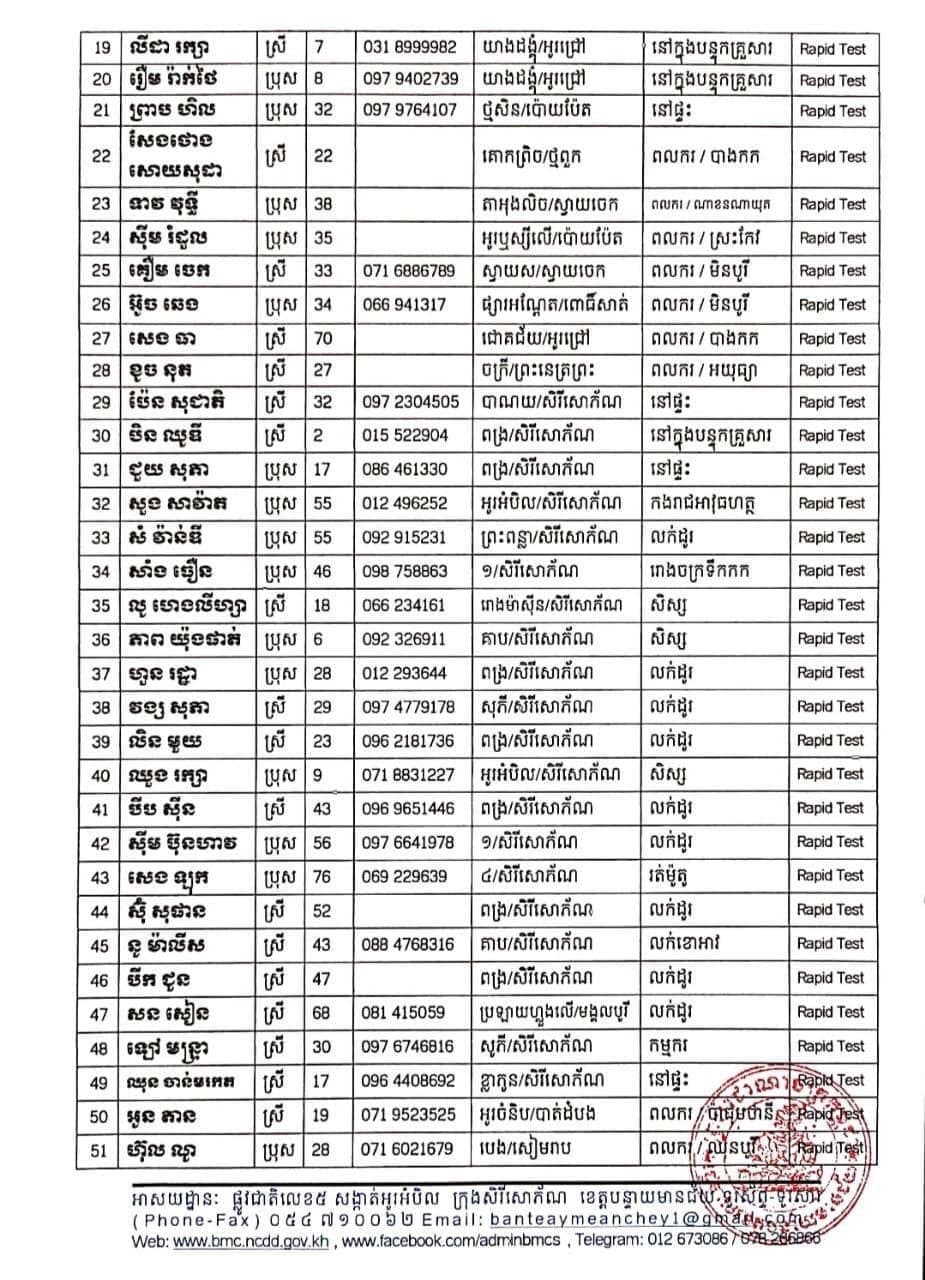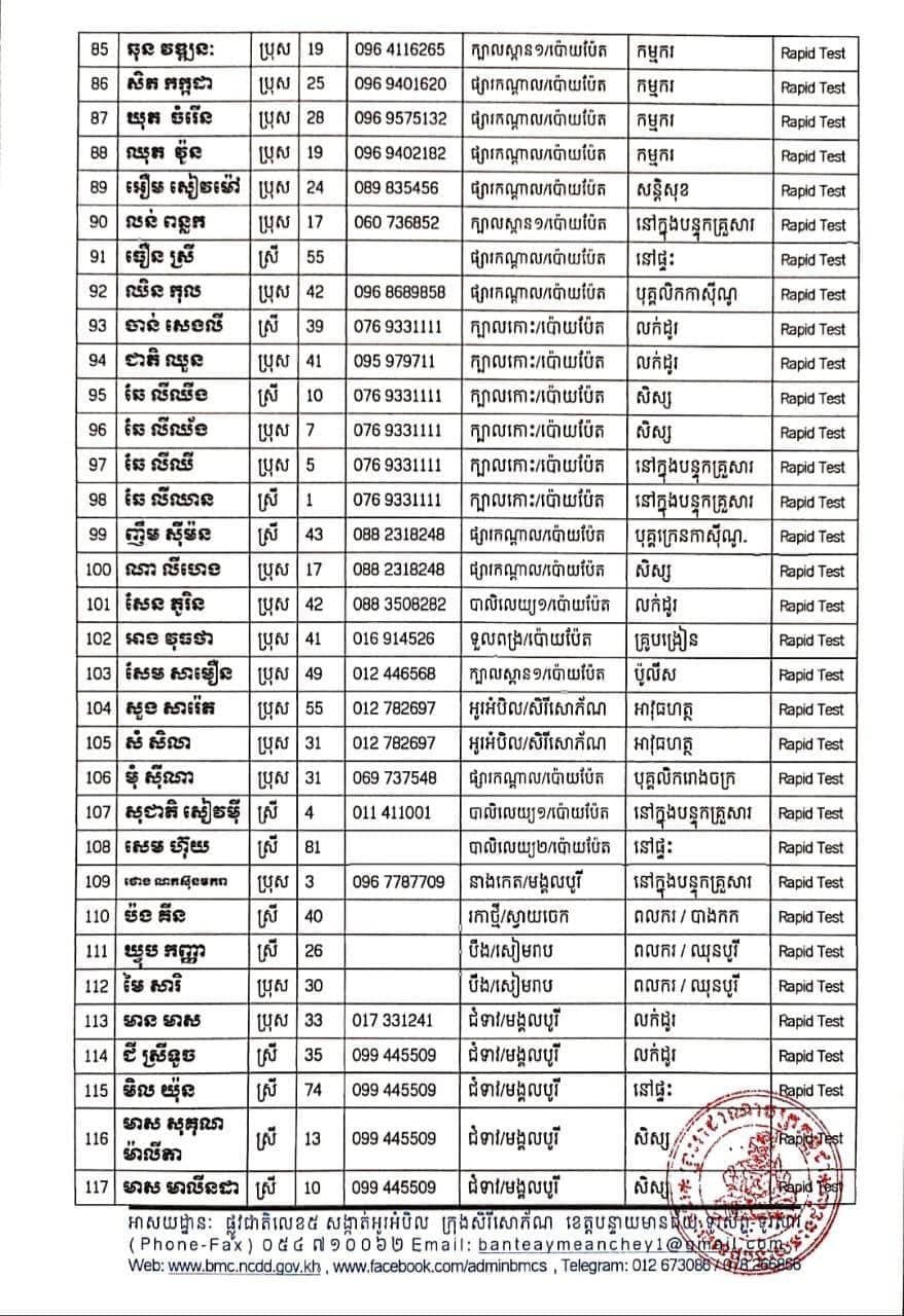 ខេត្តបន្ទាយមានជ័យ៖ យោងតាមសេចក្ដីប្រកាសព័ត៌មានរបស់ រដ្ឋបាលខេត្តបន្ទាយមានជ័យ សូមជម្រាបជូនដំណឹងដល់បងប្អូនប្រជាពលរដ្ឋ និងសាធារណៈជនឲ្យបានជ្រាបថា នៅថ្ងៃទី០៦ ខែសីហា ឆ្នាំ២០២១ មានករណីជាសះស្បើយអ្នកជំងឺកូវីដ-១៩ ចំនួន ៣១៨នាក់ និងយោងតាមលទ្ធផលតេស្តរហ័ស (Rapid Test) មន្ទីរពិសោធន៍ជាតិភ្នំពេញ(NIPH) នៅថ្ងៃទី០៥ ខែសីហា ឆ្នាំ២០២១ បានរកឃើញវិជ្ជមានជំងឺកូវីដ-១៩ថ្មី ដែលករណីឆ្លងនៅក្នុងព្រឹត្តិការណ៍សហគមន៍ ២០កុម្ភៈ ២០២១ និងពលករ វិលត្រឡប់ពីប្រទេសថៃ ដែលស្ថិតក្នុងការគ្រប់គ្រងរបស់ខេត្ត លើបុរស ស្រ្តីជនជាតិខ្មែរ ចំនួន ១៨៥នាក់ នៅក្នុងខេត្តបន្ទាយមានជ័យ ដូចមានរាយនាមខាងក្រោម៖