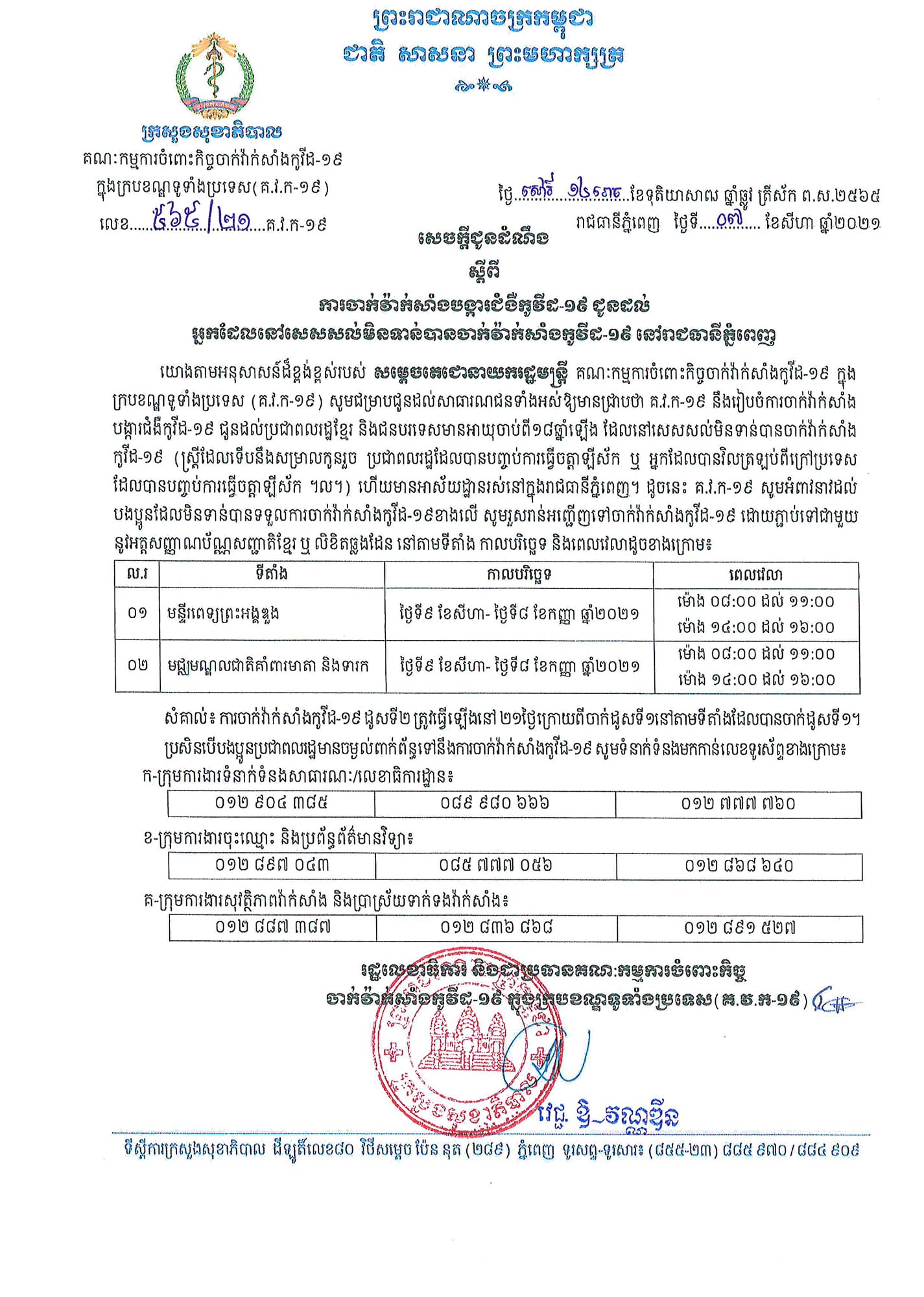 គណៈកម្មការចំពោះកិច្ចចាក់វ៉ាក់សាំងកូវីដ-១៩ នឹងរៀបចំការចាក់វ៉ាក់សាំងបង្ការជំងឺកូវីដ-១៩ ជូនដល់ប្រជាពលរដ្ឋខ្មែរ និងជនបរទេសមានអាយុចាប់ពី១៨ឆ្នាំឡើង ដែលនៅសេសសល់មិនទាន់បានចាក់វ៉ាក់សាំងកូវីដ-១៩ (ស្ត្រីដែលទើបនឹងសម្រាលកូនរួច ប្រជាពលរដ្ឋដែលបានបញ្ចប់ការការធ្វើចត្តាឡីស័ក ឬអ្នកដែលបានវិលត្រឡប់ពីក្រៅប្រទេសដែលបានបញ្ជប់ការធ្វើចត្តាឡីស័ក។ល។) ហើយមានអាស័យដ្ឋានរស់នៅក្នុងរាជធានីភ្នំពេញ។ ដូចនេះ គ.វ.ក-១៩ សូមអំពាវនាវដល់បងប្អូន ដែលមិនទាន់បានទទួលការចាក់វ៉ាក់សាំងកូវីដ-១៩ខាងលើ សូមរួសរាន់អញ្ជើញទៅចាក់វ៉ាកសាំងកូវីដ-១៩ ដោយភ្ជាប់ទៅជាមួយនូវអត្តសញ្ញាណប័ណ្ណសញ្ជាតិខ្មែរ ឬលិខិតឆ្លងដែន នៅតាមទីតាំងកាលបរិច្ឆេទ និងពេលវេលាដូចខាងក្រោម៖