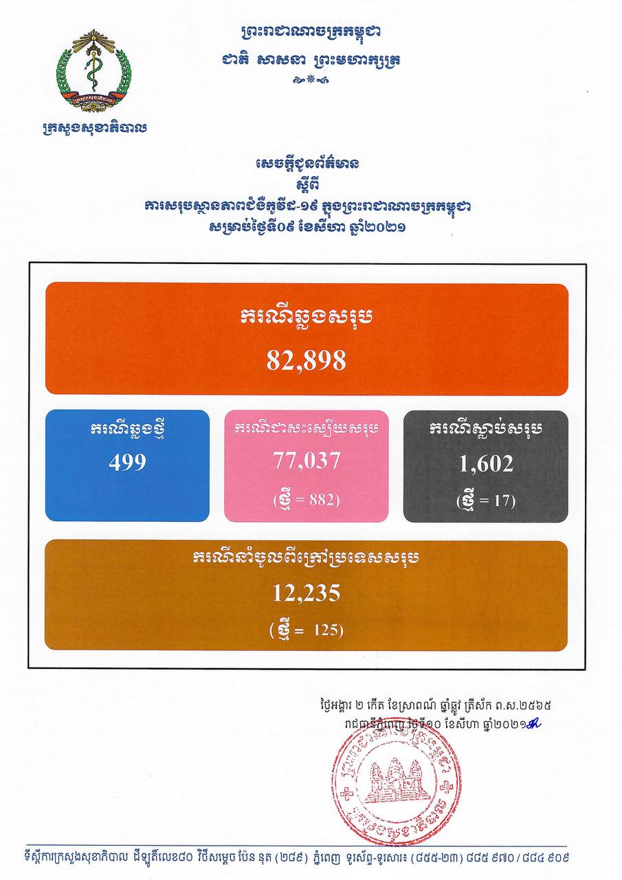 នៅថ្ងៃទី10 ខែសីហា ឆ្នាំ2021នេះ ក្រសួងសុខាភិបាលកម្ពុជា បានចេញសេចក្តីជូនដំណឹងពី ការរកឃើញករណីវិជ្ជមានវីរុសកូវីដ១៩ថ្មី ចំនួន 499នាក់ ខណៈអ្នកបានជាសះស្បើយថ្មីមានចំនួន 882នាក់ និងមានអ្នកបាត់បង់ជីវិត 17នាក់។ គិតមកទល់ពេលនេះ ករណីឆ្លងកូវីដ១៩ សរុបនៅក្នុងប្រទេសកម្ពុជា មានចំនួន 82,898នាក់, ករណីជាសះស្បើយសរុប 77,037នាក់ និងស្លាប់សរុប 1,602នាក់៕