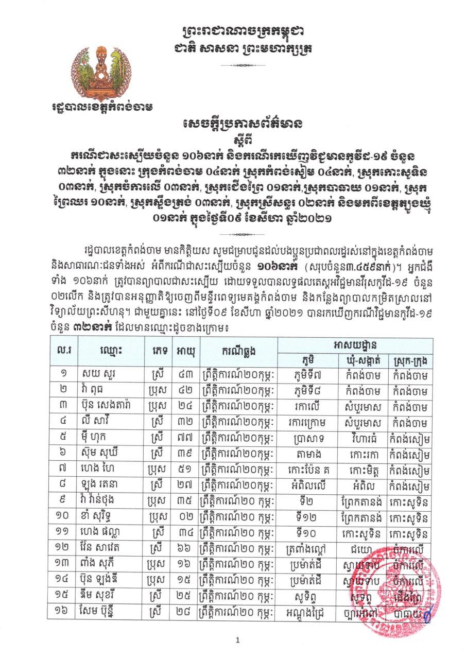 រដ្ឋបាលខេត្តកំពង់ចាម សូមជម្រាបជូនដល់បងប្អូនប្រជាពលរដ្ឋនៅក្នុងខេត្តកំពង់ចាម និងសាធារណៈជនទាំងអស់ អំពីករណីជាសះស្បើយចំនួន ១០៦នាក់ (សរុបចំនួន៣,៤៥៩នាក់)។ អ្នកជំងឺទាំង ១០៦នាក់ ត្រូវបានព្យាបាលជាសះស្បើយ ដោយទទួលបានលទ្ធផលតេស្តអវិជ្ជមានវីរុសកូវីដ-១៩ ចំនួន ០២លើក និងត្រូវបានអនុញ្ញាតិឲ្យចេញពីមន្ទីរពេទ្យមេគង្គកំពង់ចាម និងកន្លែងព្យាបាលកម្រិតស្រាលនៅវិទ្យាល័យព្រះសីហនុ។ ជាមួយគ្នានេះ នៅថ្ងៃទី០៩ ខែសីហា ឆ្នាំ២០២១ បានរកឃើញករណីវិជ្ជមានកូវីដ-១៩ ចំនួន ៣២នាក់ ដែលមានឈ្មោះដូចខាងក្រោម៖