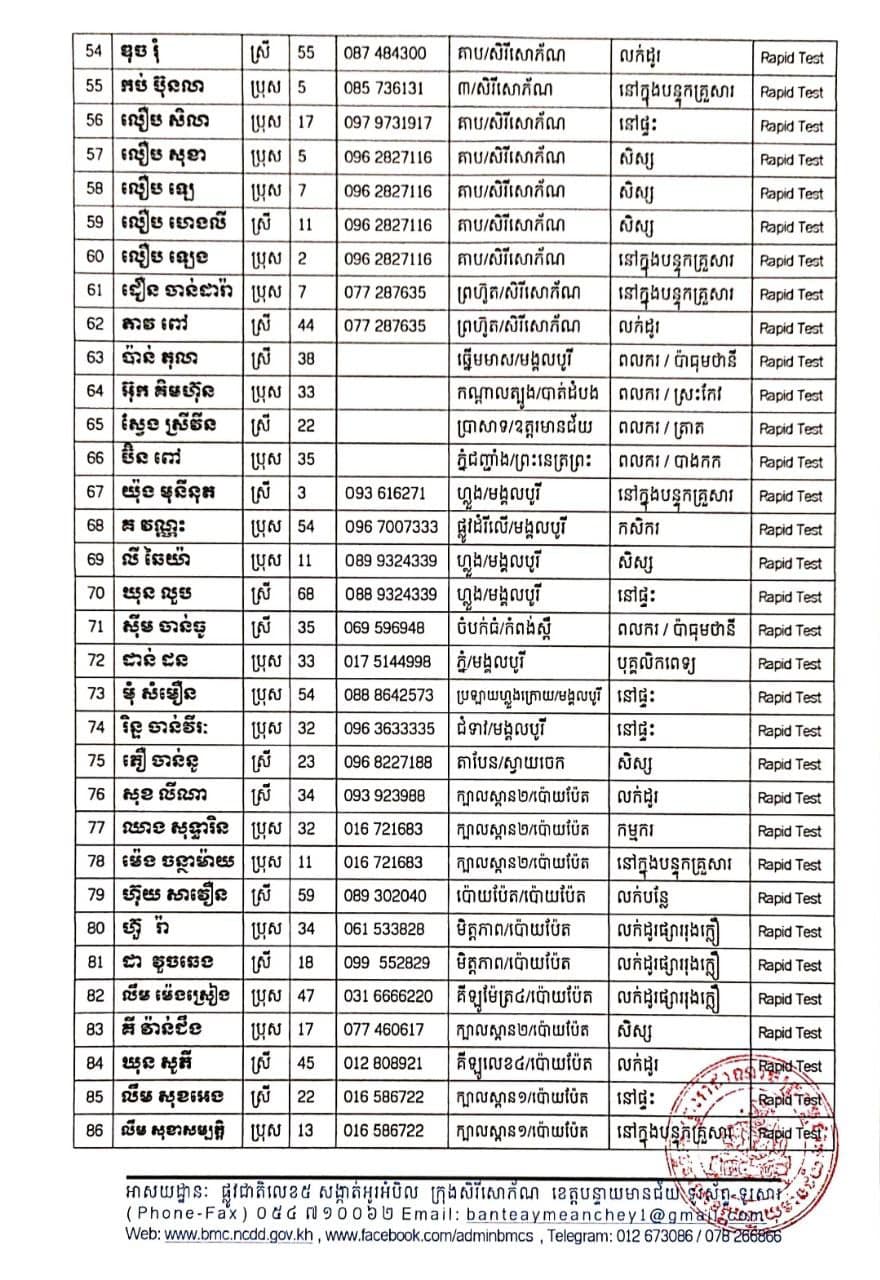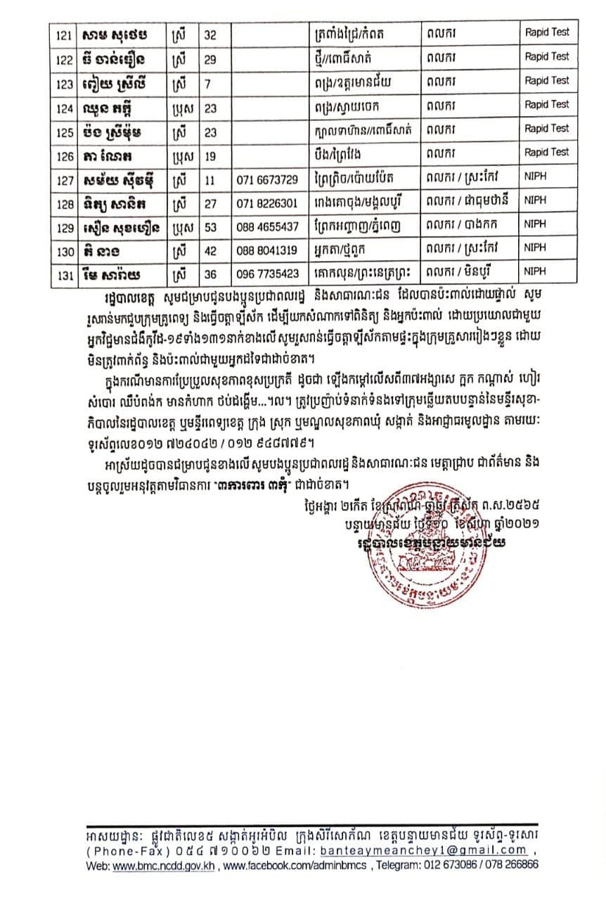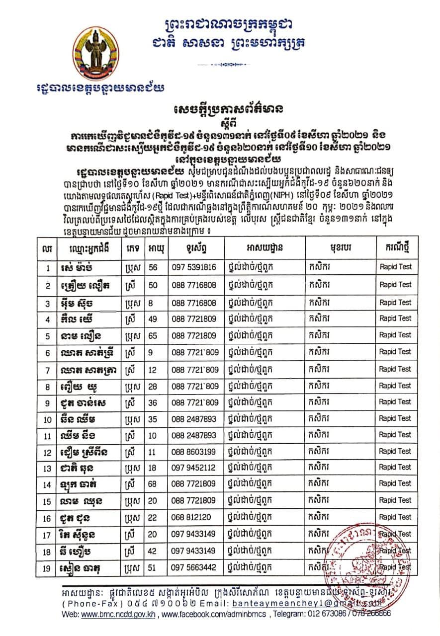 ខេត្តបន្ទាយមានជ័យ៖ យោងតាមការចុះផ្សាយរបស់ រដ្ឋបាលខេត្តបន្ទាយមានជ័យ បានចេញសេចក្តីប្រកាសព័ត៌មាន នៅថ្ងៃទី១០ ខែសីហា ឆ្នាំ២០២១ ដោយរដ្ឋបាលខេត្ត បន្តរកឃើញអ្នកវិជ្ជមាន ១៣១នាក់ និងចំនួនអ្នកព្យាបាលជាសះស្បេីយ ៦២០នាក់ យោងតាមលទ្ធផលតេស្តរហ័ស(Rapid Test) មន្ទីរពិសោធន៍ជាតិភ្នំពេញ (NIPH) នៅថ្ងៃទី០៩ ខែសីហា ឆ្នាំ២០២១ បានរកឃើញវិជ្ជមានជំងឺកូវីដ-១៩ថ្មី ដែលជាករណីឆ្លងនៅក្នុងព្រឹត្តិការណ៍សហគមន៍ ២០ កុម្ភៈ ២០២១ និងពលករ វិលត្រឡប់ពីប្រទេសថៃ ដែលស្ថិតនៅក្នុងការគ្រប់គ្រងរបស់រដ្ឋបាលខេត្ត លើបុរស ស្ត្រីជនជាតិខ្មែរ ចំនួន ១៣១នាក់ ក្នុងខេត្តបន្ទាយមានជ័យ ដូចមានរាយនាមខាងក្រោម៖