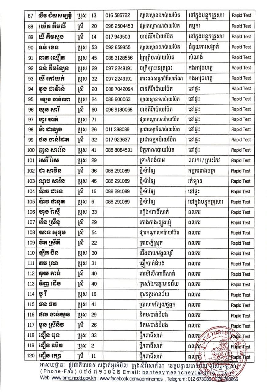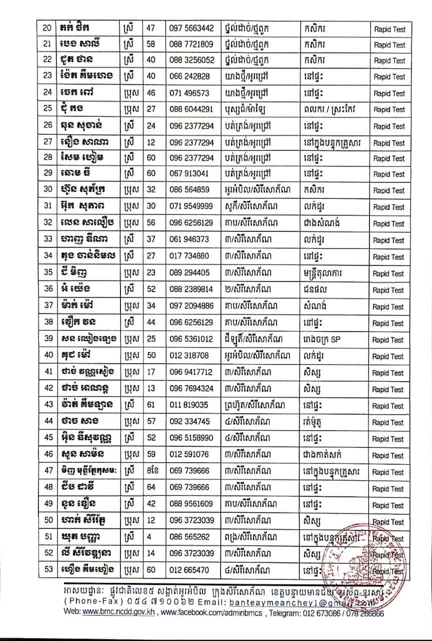រដ្ឋបាលខេត្តបន្ទាយមានជ័យ បន្តរកឃើញអ្នកវិជ្ជមានកូវីដ-១៩ថ្មី ចំនួន ១៣១នាក់ និងជាសះស្បើយរហូតដល់ ៦២០នាក់