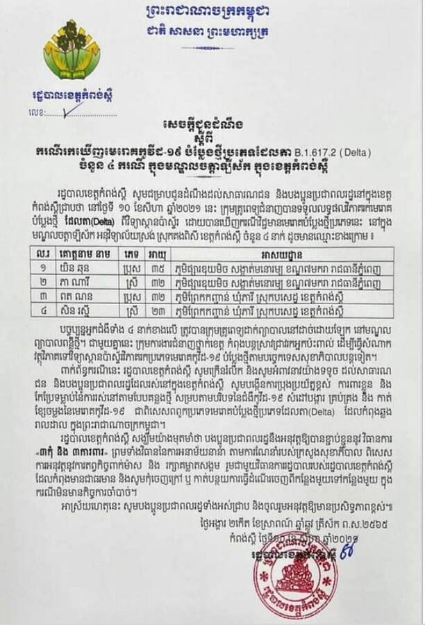 រដ្ឋបាលខេត្តកំពង់ស្ពឺ ប្រកាសរកឃើញមេរោគកូវីដ-១៩ បំប្លែងថ្មី ដែលតា (Delta) ចំនួន០៤ករណី