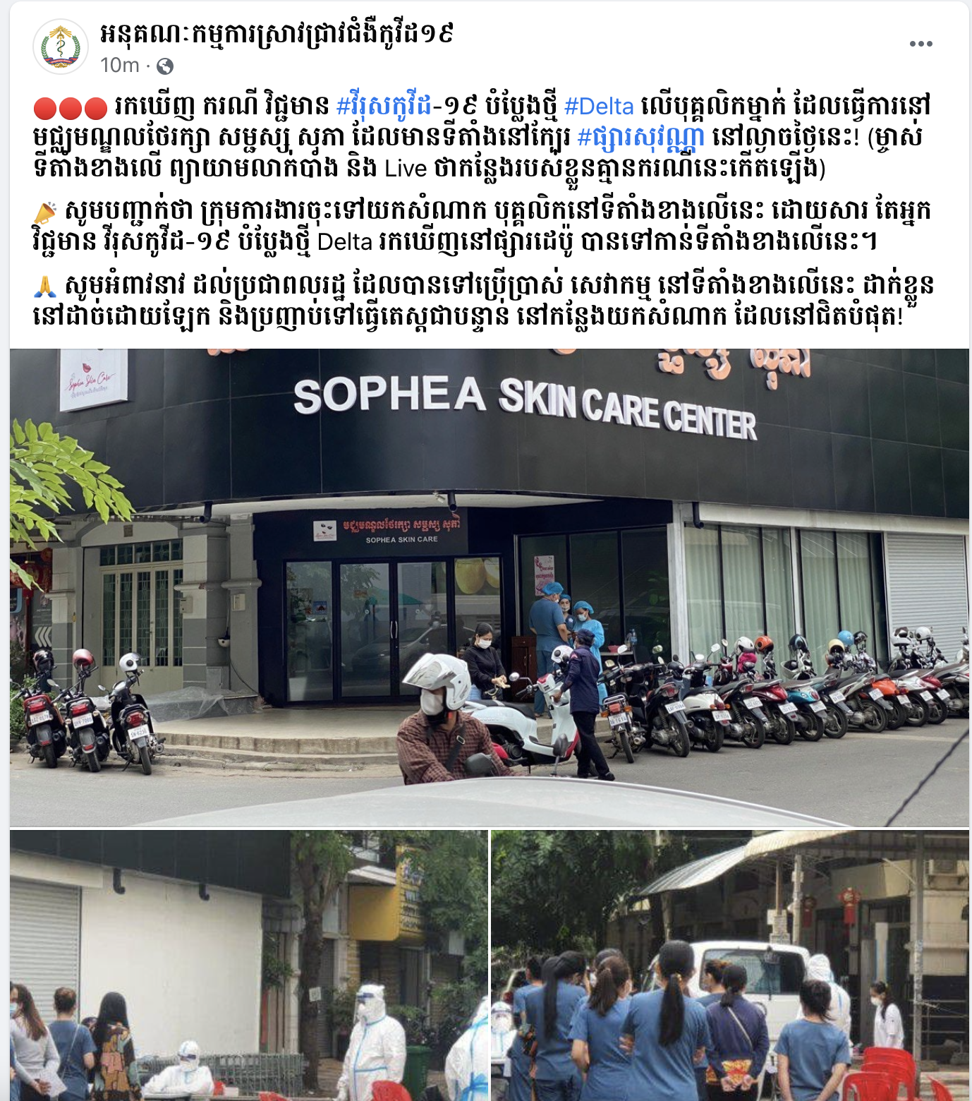 មុននេះបន្តិច នៅលើទំព័រ ហ្វេសបុក អនុគណៈកម្មការស្រាវជ្រាវជំងឺកូវីដ១៩ បានប្រកាសឲ្យដឹងថា៖ រកឃើញ ករណី វិជ្ជមាន វីរុសកូវីដ-១៩ បំប្លែងថ្មី Delta លើបុគ្គលិកម្នាក់ ដែលធ្វើការនៅ មជ្ឈមណ្ឌលថែរក្សា សម្ជស្ស សុភា ដែលមានទីតាំងនៅក្បែរ ផ្សារសុវណ្ណា នៅល្ងាចថ្ងៃនេះ! (ម្ចាស់ទីតាំងខាងលើ ព្យាយាមលាក់បាំង និង Live ថាកន្លែងរបស់ខ្លួនគ្មានករណីនេះកើតឡើង)។
