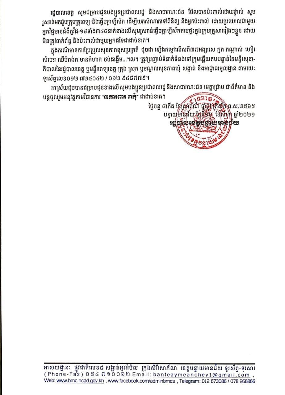 ខេត្តបន្ទាយមានជ័យ រកឃើញអ្នកវិជ្ជមានកូវីដ-១៩ថ្មី ចំនួន ៣៤៨នាក់ និងជាសះស្បើយ ២៣៥នាក់