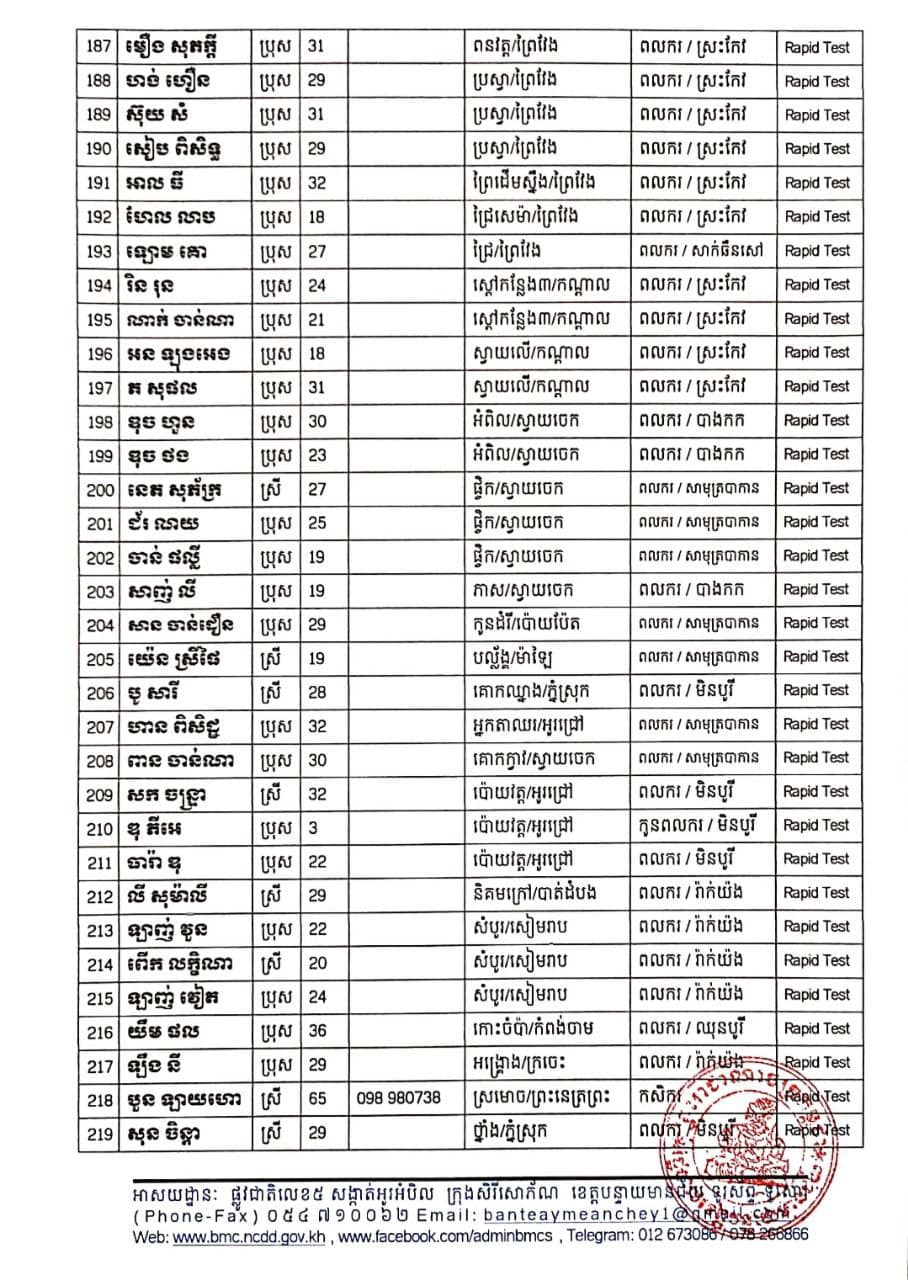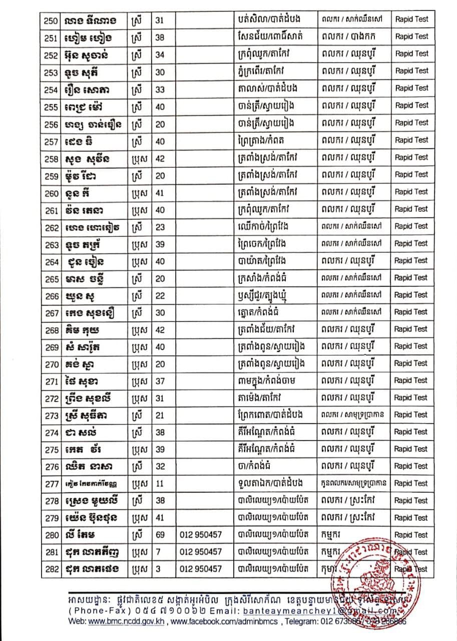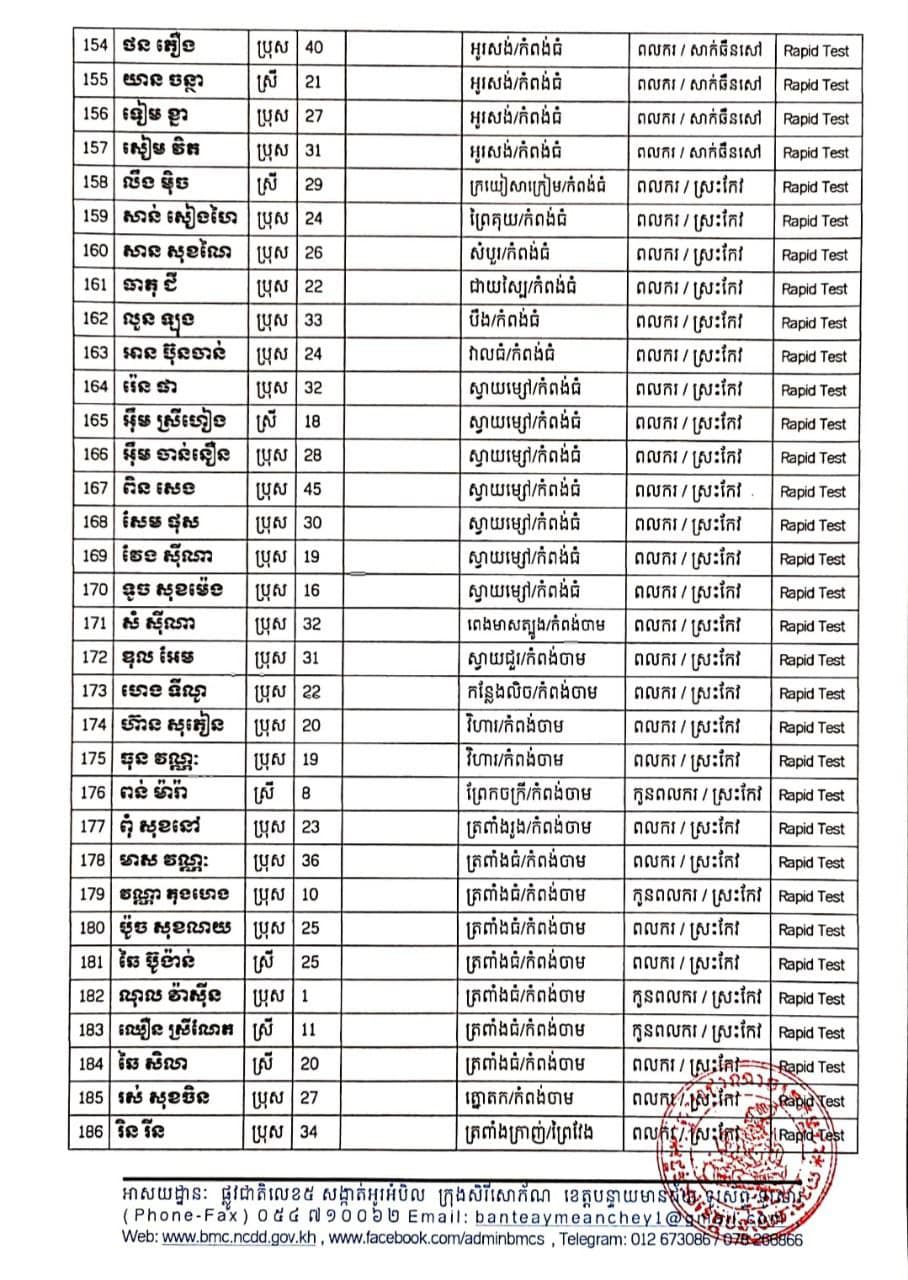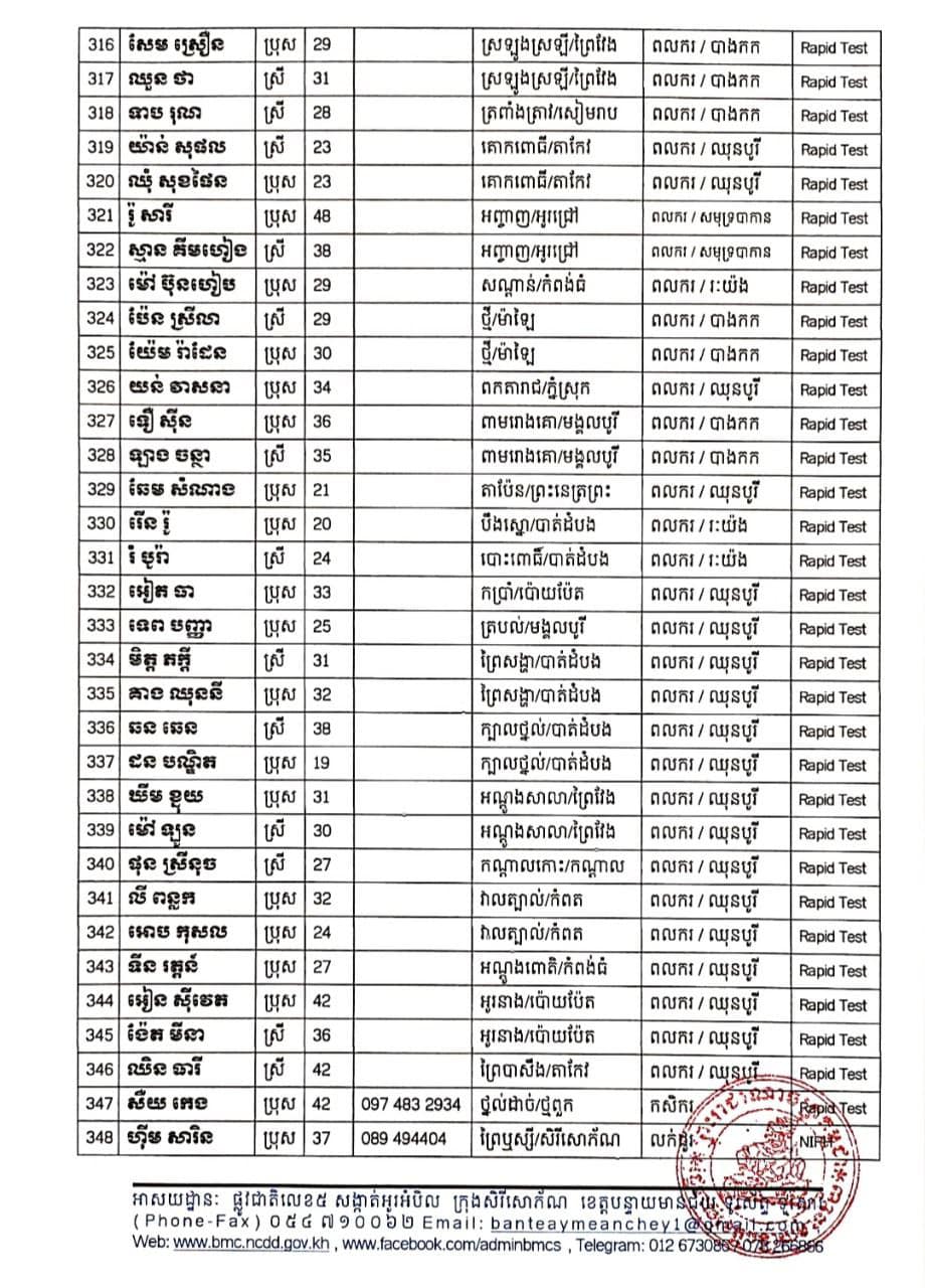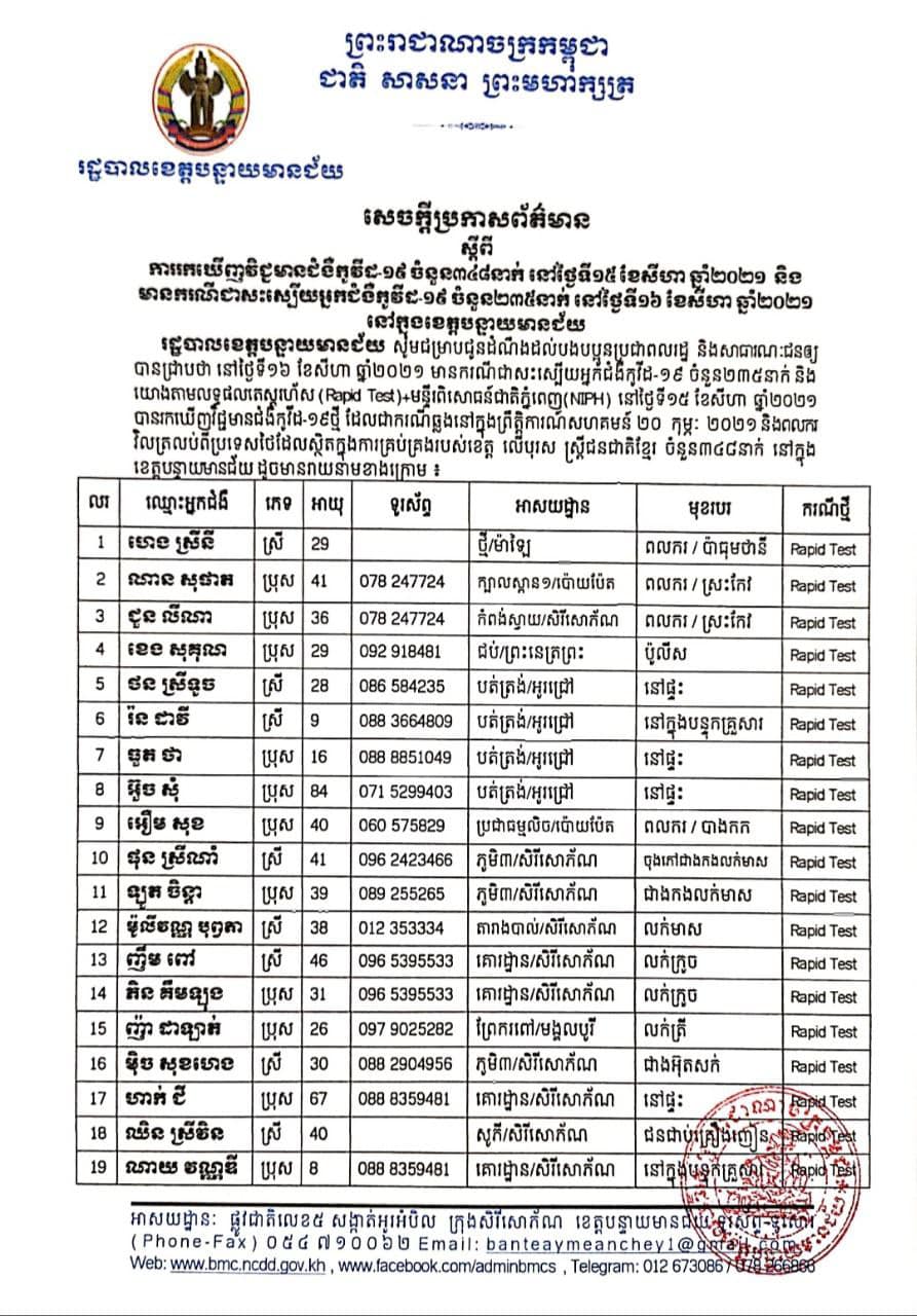 ខេត្តបន្ទាយមានជ័យ៖ យោងតាមសេចក្តីប្រកាសព័ត៌មានរបស់ រដ្ឋបាលខេត្តបន្ទាយមានជ័យ បានឲ្យដឹងថា រដ្ឋបាលខេត្ត បន្តរកឃើញអ្នកវិជ្ជមានកូវីដ១៩ថ្មី ចំនួន ៣៤៨នាក់ និងមានអ្នកជាសះស្បើយចំនួន ២៣៥នាក់ នៅថ្ងៃទី១៦ ខែសីហា ឆ្នាំ២០២១ ដោយយោងតាមលទ្ធផលតេស្តរហ័ស(Rapid Test) មន្ទីរពិសោធន៍ជាតិភ្នំពេញ (NIPH) នៅថ្ងៃទី១៥ ខែសីហា ឆ្នាំ២០២១ បានរកឃើញវិជ្ជមានជំងឺកូវីដ-១៩ ដែលជាករណីឆ្លងក្នុងព្រឹត្តិការណ៍សហគមន៍ ២០ កុម្ភៈ ២០២១ និងពលករវិលត្រឡប់ពីប្រទេសថៃ ដែលស្ថិតនៅក្នុងការគ្រប់គ្រងរបស់ខេត្ត លើបុរស ស្ត្រីជនជាតិខ្មែរ ចំនួន ៣៤៨នាក់ នៅក្នុងខេត្តបន្ទាយមានជ័យ ដូចមានរាយនាមខាងក្រោម៖