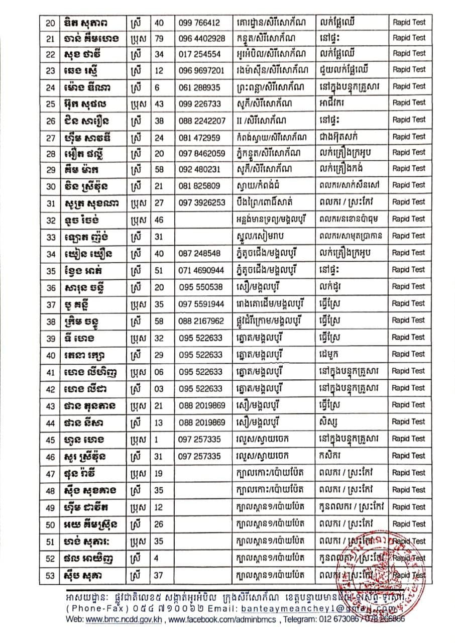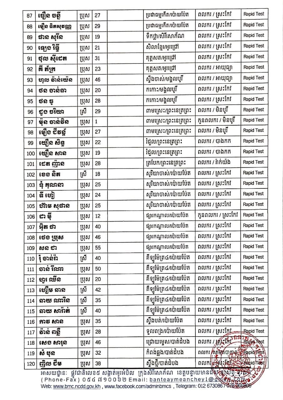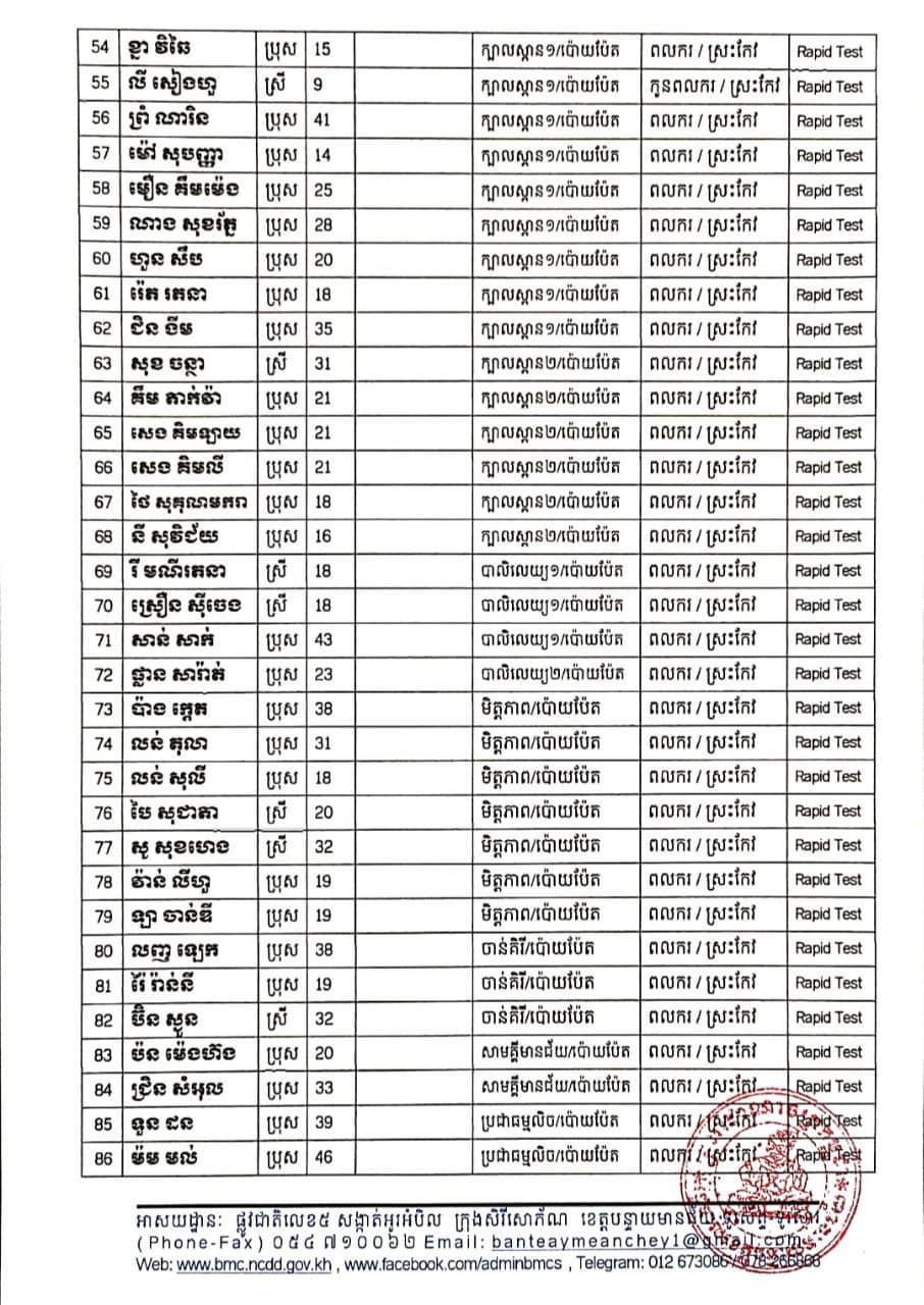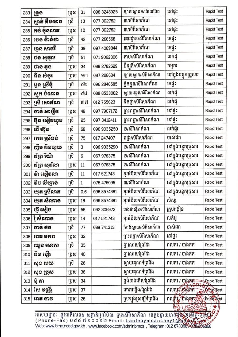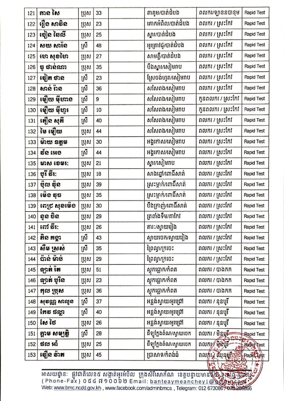 ខេត្តបន្ទាយមានជ័យ៖ យោងតាមសេចក្តីប្រកាសព័ត៌មានរបស់ រដ្ឋបាលខេត្តបន្ទាយមានជ័យ បានឲ្យដឹងថា រដ្ឋបាលខេត្ត បន្តរកឃើញអ្នកវិជ្ជមានកូវីដ១៩ថ្មី ចំនួន ៣៤៨នាក់ និងមានអ្នកជាសះស្បើយចំនួន ២៣៥នាក់ នៅថ្ងៃទី១៦ ខែសីហា ឆ្នាំ២០២១ ដោយយោងតាមលទ្ធផលតេស្តរហ័ស(Rapid Test) មន្ទីរពិសោធន៍ជាតិភ្នំពេញ (NIPH) នៅថ្ងៃទី១៥ ខែសីហា ឆ្នាំ២០២១ បានរកឃើញវិជ្ជមានជំងឺកូវីដ-១៩ ដែលជាករណីឆ្លងក្នុងព្រឹត្តិការណ៍សហគមន៍ ២០ កុម្ភៈ ២០២១ និងពលករវិលត្រឡប់ពីប្រទេសថៃ ដែលស្ថិតនៅក្នុងការគ្រប់គ្រងរបស់ខេត្ត លើបុរស ស្ត្រីជនជាតិខ្មែរ ចំនួន ៣៤៨នាក់ នៅក្នុងខេត្តបន្ទាយមានជ័យ ដូចមានរាយនាមខាងក្រោម៖
