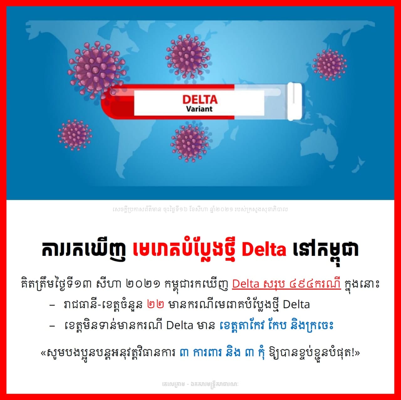 រាជធានីភ្នំពេញ៖ យោងតាមលិខិតរបស់ក្រសួងសុខាភិបាល បានឲ្យដឹងថា គិតចាប់ពីថ្ងៃទី៣១ ខែមីនា ឆ្នាំ២០២១ ដល់ថ្ងៃទី១៣ ខែសីហា ឆ្នាំ២០២១ កម្ពុជាបានរកឃើញអ្នកវិជ្ជមានវីរុសកូវីដ-១៩ ប្រភេទ ដែលតា (Delta) លើពលករត្រលប់ពីប្រទេសថៃ និងប្រទេសវៀតណាម អ្នកដំណើរមកតាមជើងហោះហើរ បុគ្គលិកសុខាភិបាល មន្ត្រីរាជការ និងអ្នកភូមិនៅក្នុងសហគមន៍ សរុបទាំងអស់ចំនួន ៤៩៤នាក់ (ស្ត្រី ២៤៣នាក់)។