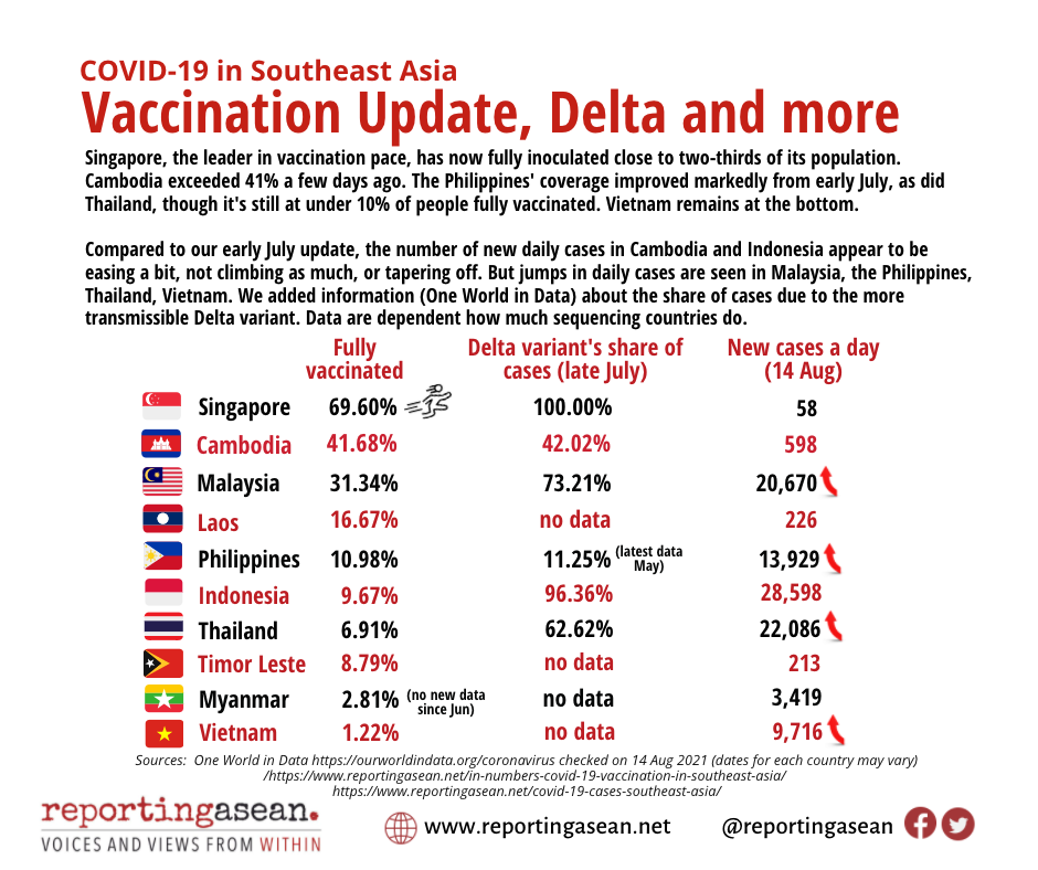 គេហទំព័រនេះបានបញ្ជាក់ផងដែរថា ប្រទេសសិង្ហបុរីដែលជាប្រទេសឈានមុខគេក្នុងការចាក់វ៉ាក់សាំង បានផ្តល់វ៉ាក់សាំងពេញលេញដល់ប្រជាជនខ្លួន បានប្រមាណជិតពីរភាគបី នៃប្រជាជនសរុបហើយ ខណៈប្រទេសកម្ពុជាវិញ បានចាក់វ៉ាក់សាំងគ្រប់ដូសដល់ប្រជាជនច្រើនជាង ៤១ភាគរយ កាលពីប៉ុន្មានថ្ងៃមុននេះ។ ចំណែកឯប្រទេសហ្វីលីពីន ក៏កំពុងមានសន្ទុះគួរឱ្យកត់សម្គាល់ដែរ ចាប់ពីដើមខែកក្កដាមក ខណៈប្រទេសថៃ ក៏ដូចគ្នា បើទោះបីចំនួនប្រជាជនដែលទទួលបានវ៉ាក់សាំងគ្រប់ដូស នៅមានកម្រិតទាបជាង ១០ភាគរយ ក៏ដោយ។ ចំពោះប្រទេសវៀតណាមវិញ នៅតែស្ថិតនៅលំដាប់ក្រោមគេដដែល»។