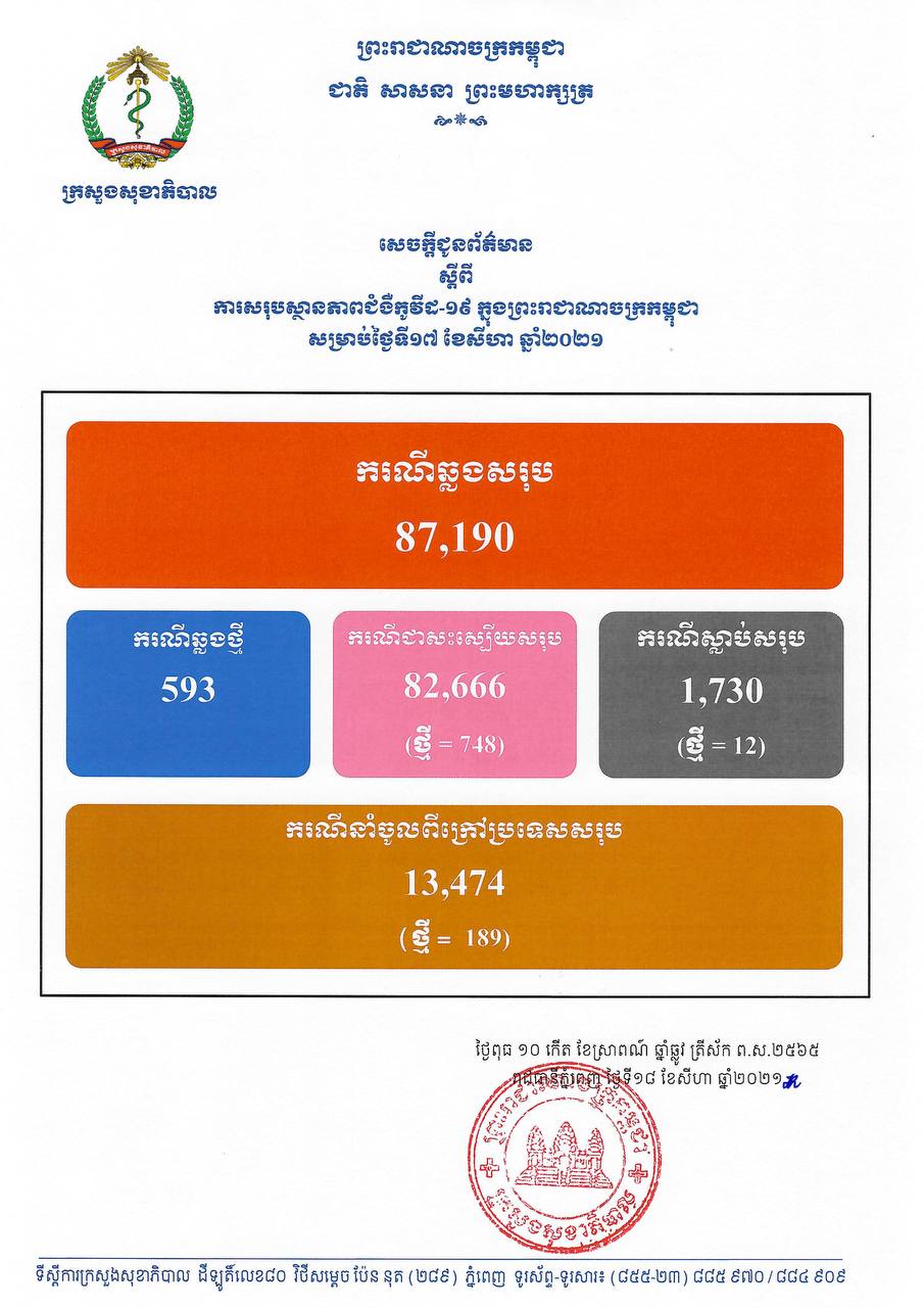 នៅថ្ងៃទី18 ខែសីហា ឆ្នាំ2021នេះ ក្រសួងសុខាភិបាលកម្ពុជា បានចេញសេចក្តីជូនដំណឹងពី ការរកឃើញករណីវិជ្ជមានវីរុសកូវីដ១៩ថ្មី ចំនួន 593នាក់ ខណៈអ្នកបានជាសះស្បើយថ្មីមានចំនួន 748នាក់ និងមានអ្នកបាត់បង់ជីវិត 12នាក់។ គិតមកទល់ពេលនេះ ករណីឆ្លងកូវីដ១៩ សរុបនៅក្នុងប្រទេសកម្ពុជា មានចំនួន 87,190នាក់, ករណីជាសះស្បើយសរុប 82,666នាក់ និងស្លាប់សរុប 1,730នាក់៕