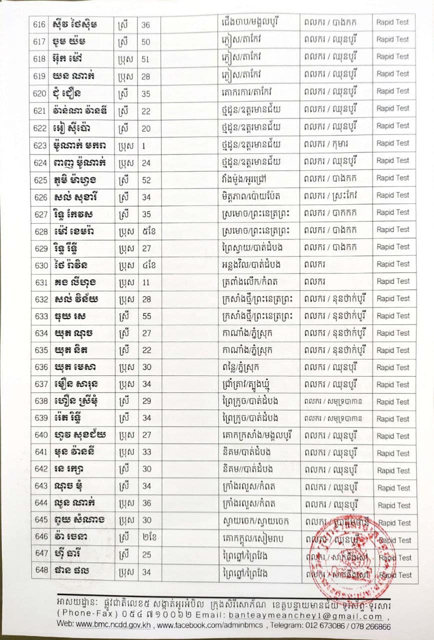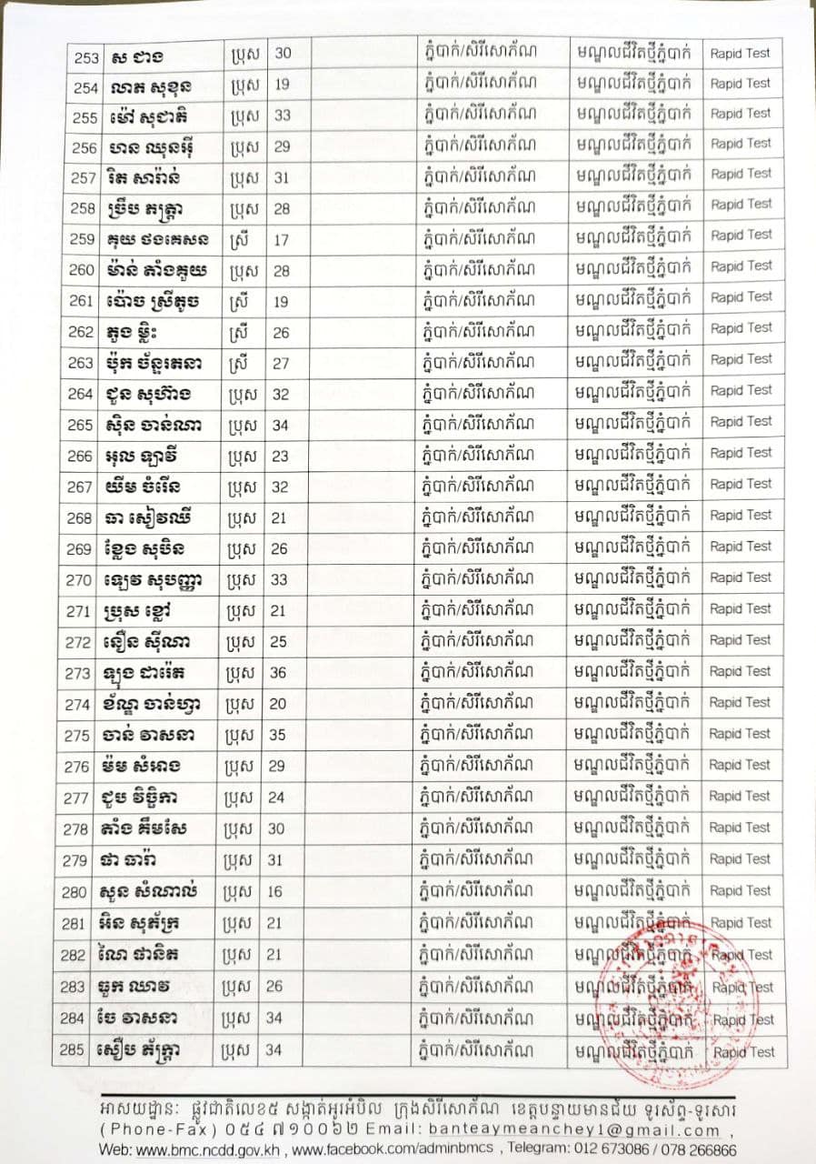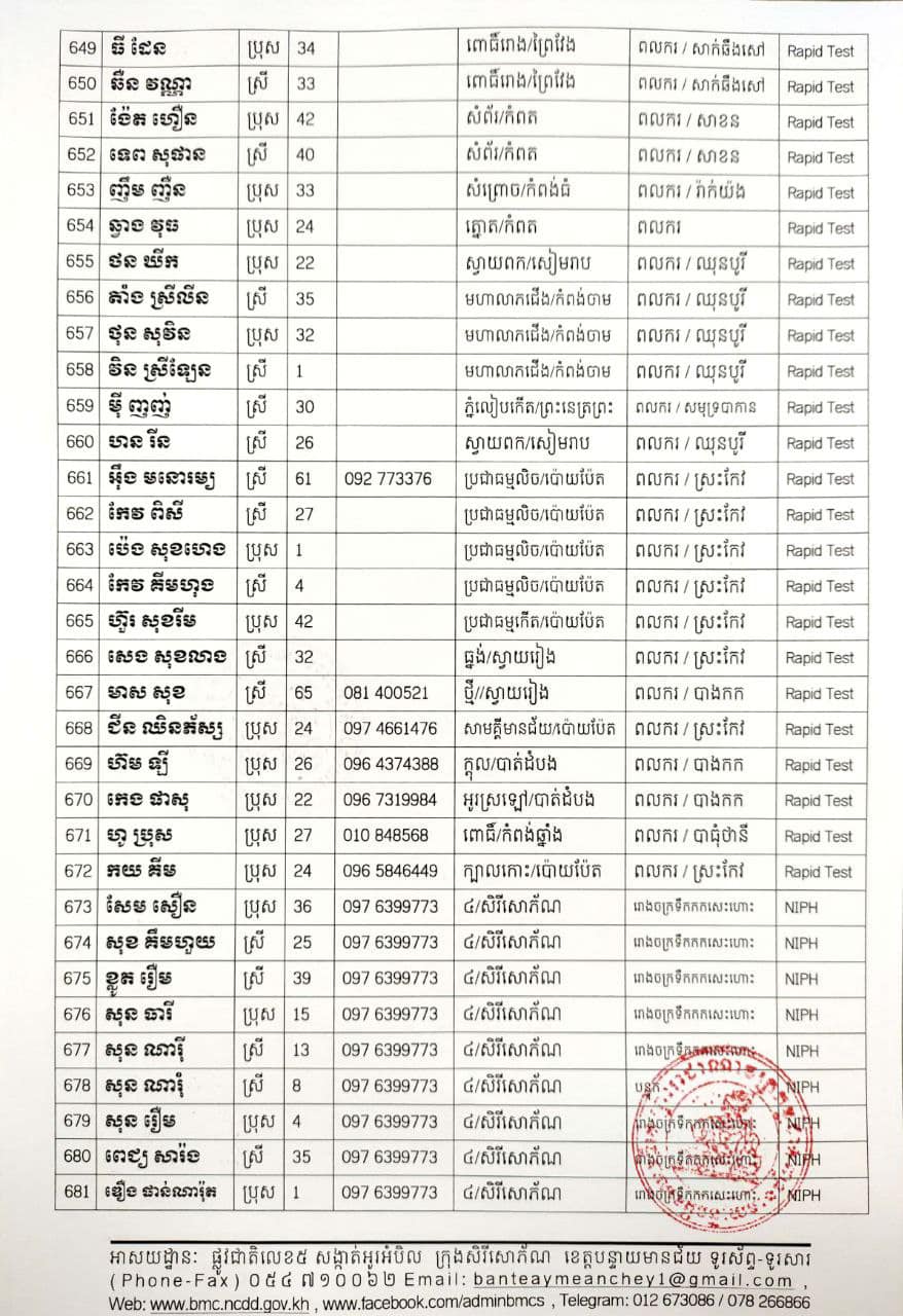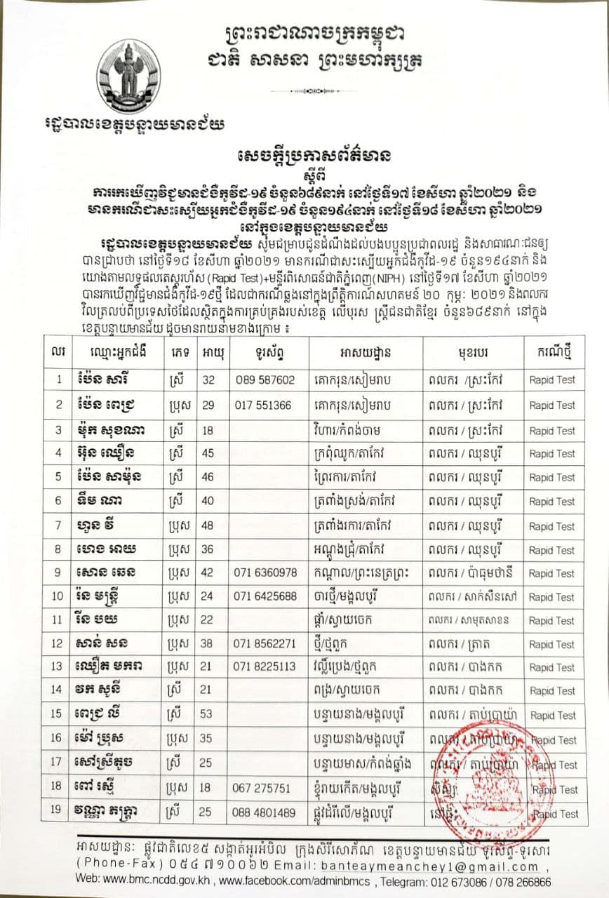 ខេត្តបន្ទាយមានជ័យ៖ យោងតាមសេចក្តីប្រកាសព័ត៌មានរបស់ រដ្ឋបាលខេត្តបន្ទាយមានជ័យ បន្តរកឃើញអ្នកវិជ្ជមានថ្មី ៦៨៩នាក់ និងអ្នកជាសះស្បើយចំនួន ១៩៤នាក់ នៅថ្ងៃទី១៨ ខែសីហា ឆ្នាំ២០២១ ដោយយោងតាមលទ្ធផលតេស្តរហ័ស(Rapid Test) មន្ទីរពិសោធន៍ជាតិភ្នំពេញ(NIPH) នៅថ្ងៃទី១៧ ខែសីហា ឆ្នាំ២០២១ និងបានរកឃើញវិជ្ជមានជំងឺកូវីដ-១៩ថ្មី ដែលជាករណីឆ្លងនៅក្នុងព្រឹត្តិការណ៍សហគមន៍ ២០ កុម្ភៈ ២០២១ និងពលករវិលត្រលប់ពីប្រទេសថៃ ដែលស្ថិតក្នុងការគ្រប់គ្រងរបស់ខេត្ត លើបុរស ស្ត្រីជនជាតិខ្មែរ ចំនួន ៦៨៩នាក់ នៅក្នុងខេត្តបន្ទាយមានជ័យ ដូចមានរាយនាមខាងក្រោម៖