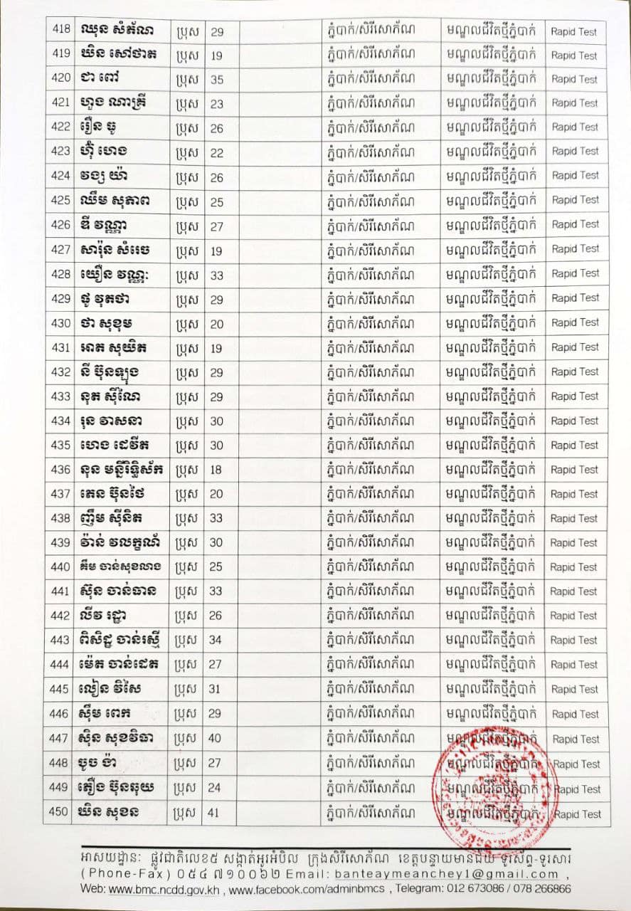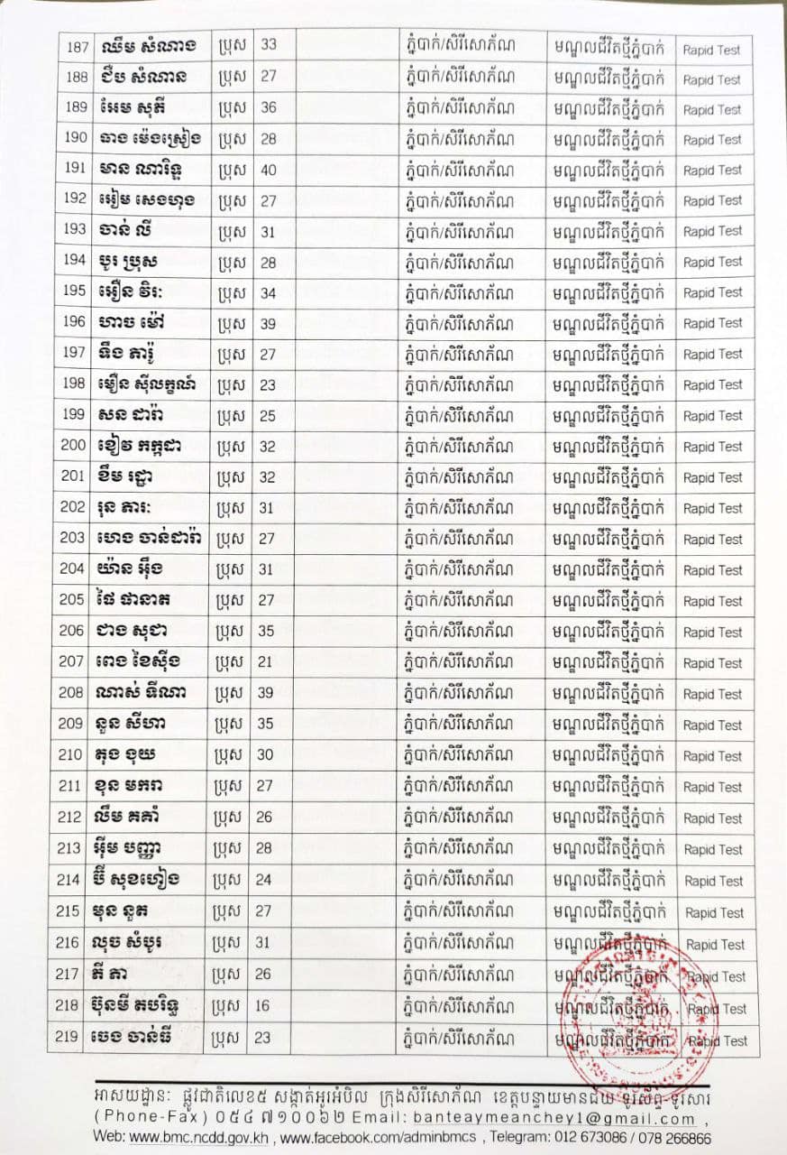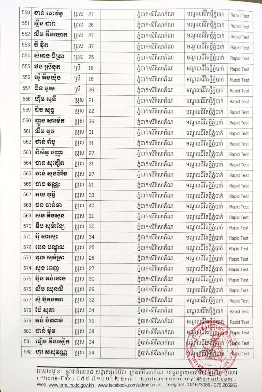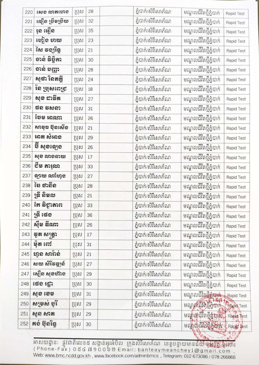 ខេត្តបន្ទាយមានជ័យ៖ យោងតាមសេចក្តីប្រកាសព័ត៌មានរបស់ រដ្ឋបាលខេត្តបន្ទាយមានជ័យ បន្តរកឃើញអ្នកវិជ្ជមានថ្មី ៦៨៩នាក់ និងអ្នកជាសះស្បើយចំនួន ១៩៤នាក់ នៅថ្ងៃទី១៨ ខែសីហា ឆ្នាំ២០២១ ដោយយោងតាមលទ្ធផលតេស្តរហ័ស(Rapid Test) មន្ទីរពិសោធន៍ជាតិភ្នំពេញ(NIPH) នៅថ្ងៃទី១៧ ខែសីហា ឆ្នាំ២០២១ និងបានរកឃើញវិជ្ជមានជំងឺកូវីដ-១៩ថ្មី ដែលជាករណីឆ្លងនៅក្នុងព្រឹត្តិការណ៍សហគមន៍ ២០ កុម្ភៈ ២០២១ និងពលករវិលត្រលប់ពីប្រទេសថៃ ដែលស្ថិតក្នុងការគ្រប់គ្រងរបស់ខេត្ត លើបុរស ស្ត្រីជនជាតិខ្មែរ ចំនួន ៦៨៩នាក់ នៅក្នុងខេត្តបន្ទាយមានជ័យ ដូចមានរាយនាមខាងក្រោម៖