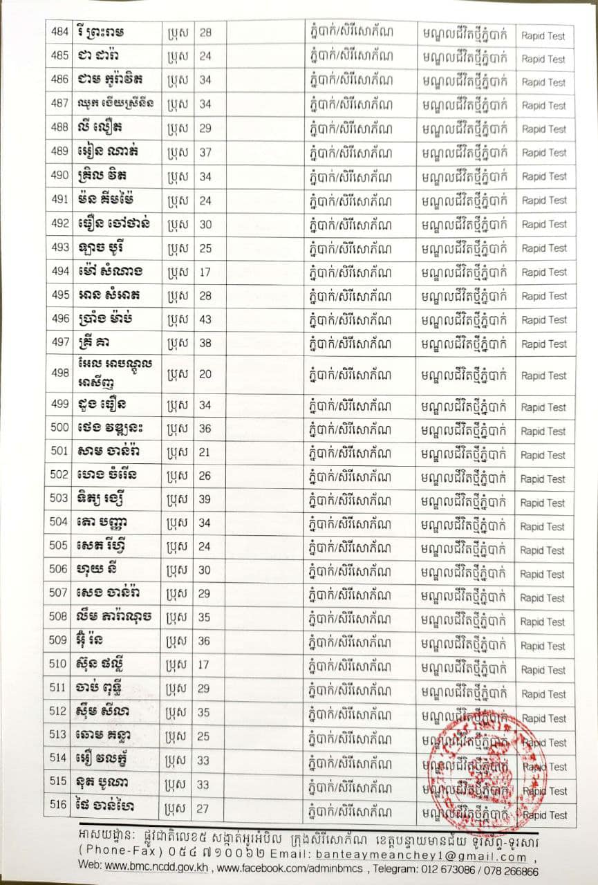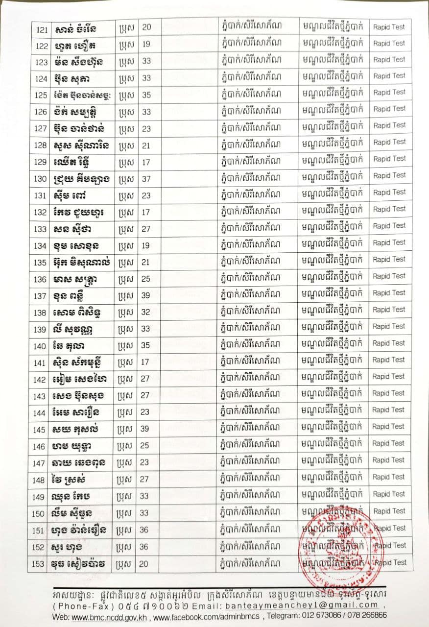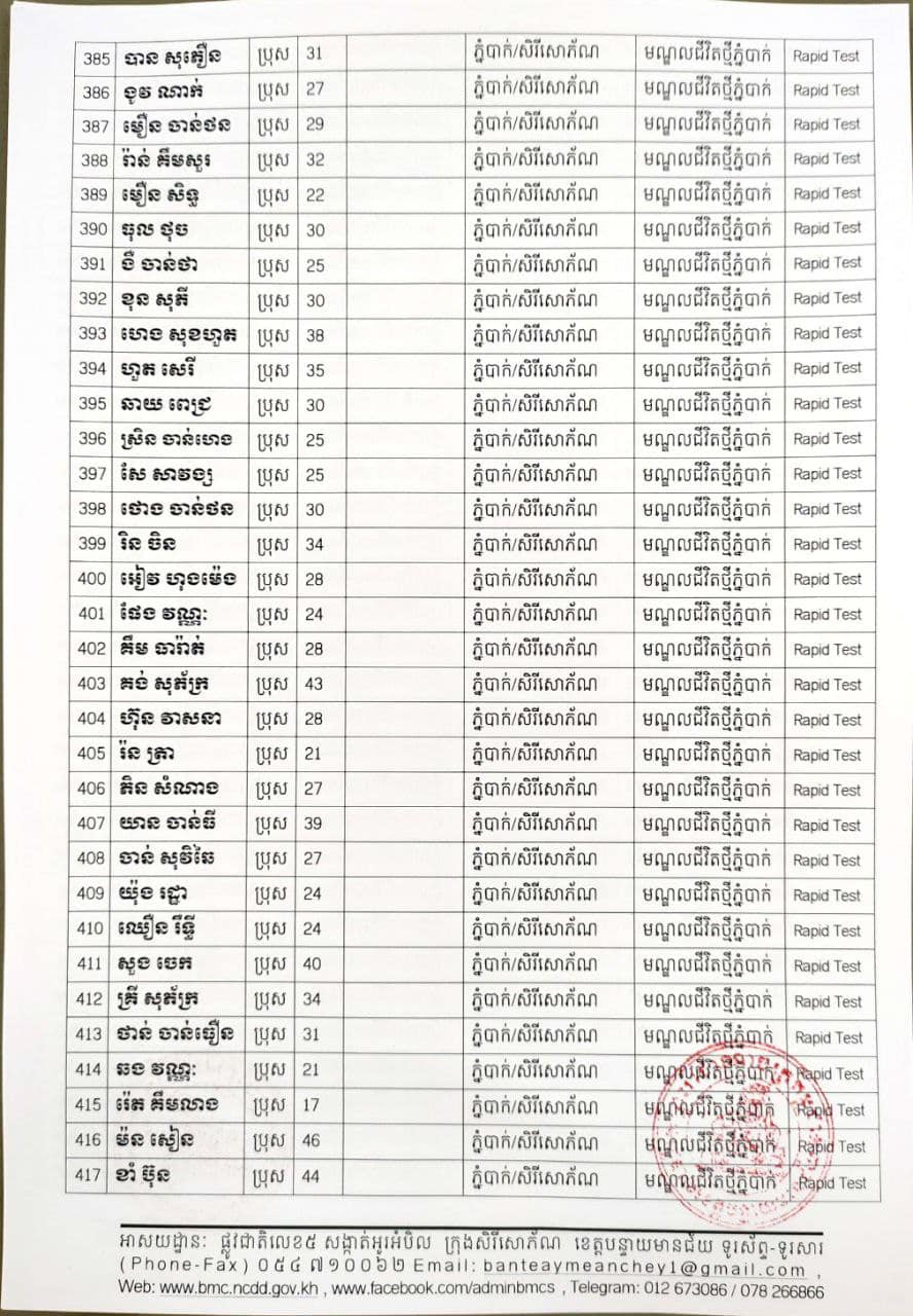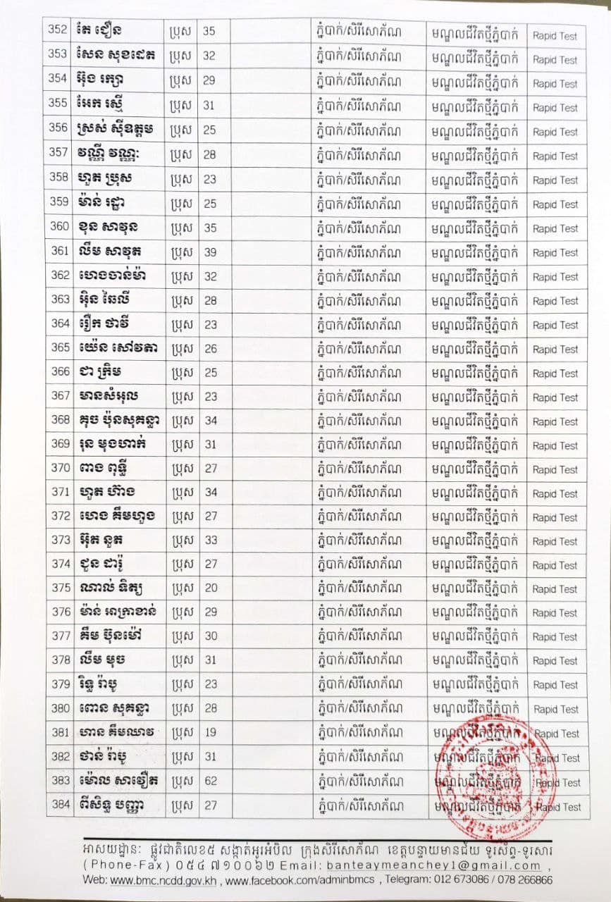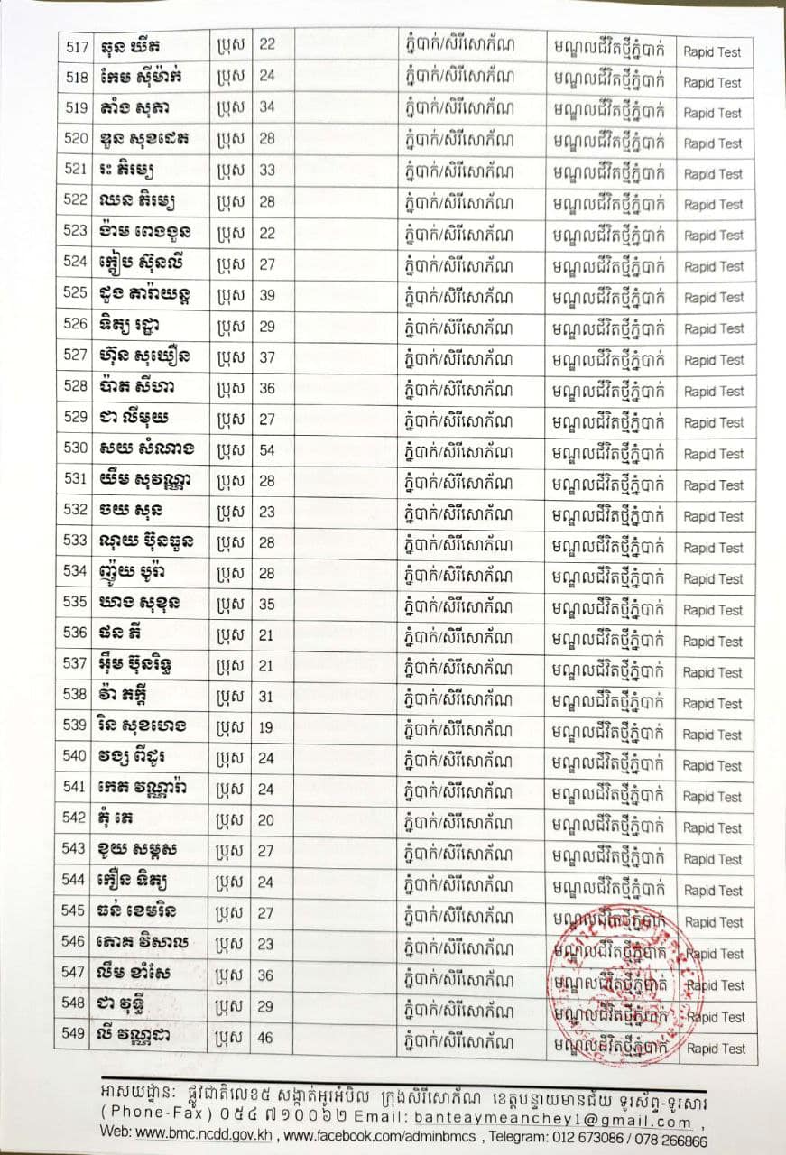 ខេត្តបន្ទាយមានជ័យ៖ យោងតាមសេចក្តីប្រកាសព័ត៌មានរបស់ រដ្ឋបាលខេត្តបន្ទាយមានជ័យ បន្តរកឃើញអ្នកវិជ្ជមានថ្មី ៦៨៩នាក់ និងអ្នកជាសះស្បើយចំនួន ១៩៤នាក់ នៅថ្ងៃទី១៨ ខែសីហា ឆ្នាំ២០២១ ដោយយោងតាមលទ្ធផលតេស្តរហ័ស(Rapid Test) មន្ទីរពិសោធន៍ជាតិភ្នំពេញ(NIPH) នៅថ្ងៃទី១៧ ខែសីហា ឆ្នាំ២០២១ និងបានរកឃើញវិជ្ជមានជំងឺកូវីដ-១៩ថ្មី ដែលជាករណីឆ្លងនៅក្នុងព្រឹត្តិការណ៍សហគមន៍ ២០ កុម្ភៈ ២០២១ និងពលករវិលត្រលប់ពីប្រទេសថៃ ដែលស្ថិតក្នុងការគ្រប់គ្រងរបស់ខេត្ត លើបុរស ស្ត្រីជនជាតិខ្មែរ ចំនួន ៦៨៩នាក់ នៅក្នុងខេត្តបន្ទាយមានជ័យ ដូចមានរាយនាមខាងក្រោម៖