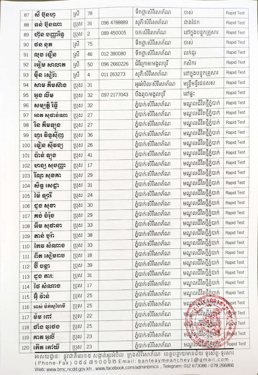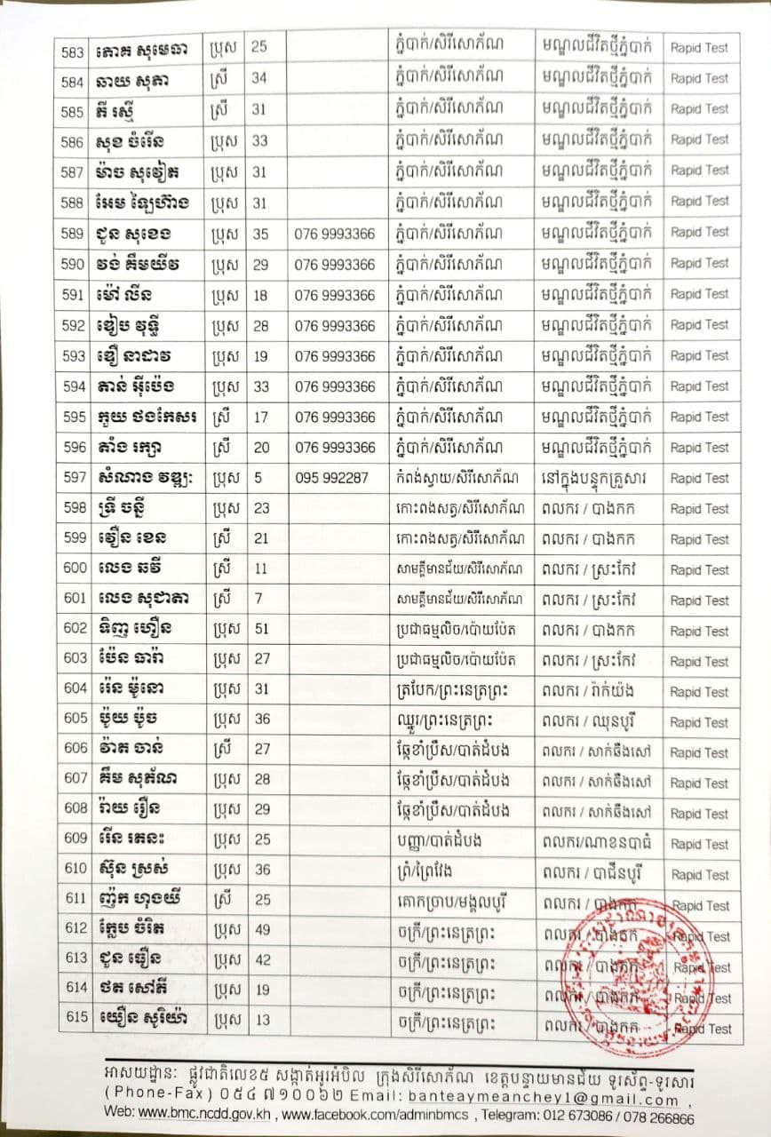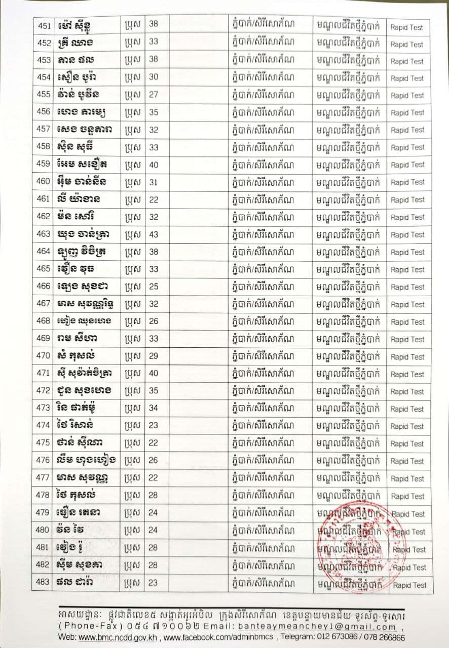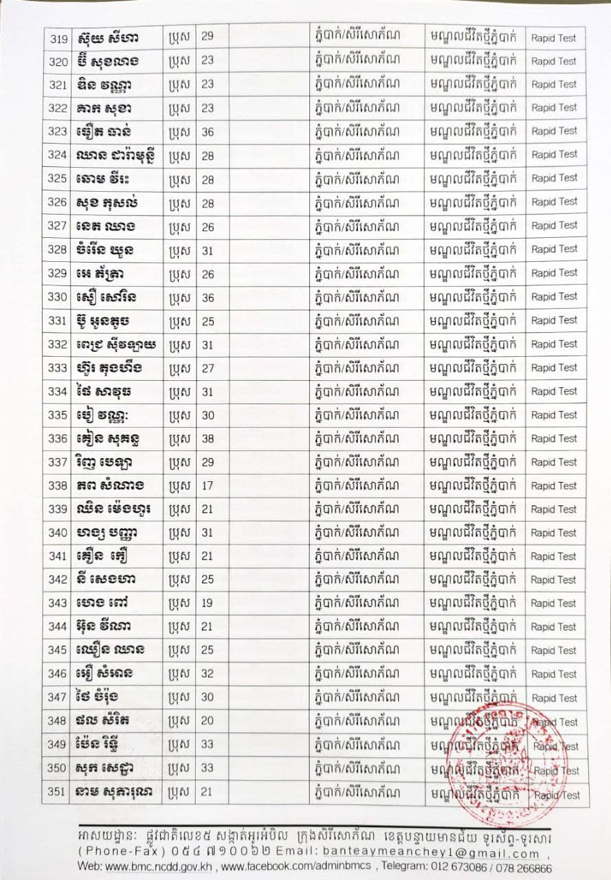 ខេត្តបន្ទាយមានជ័យ៖ យោងតាមសេចក្តីប្រកាសព័ត៌មានរបស់ រដ្ឋបាលខេត្តបន្ទាយមានជ័យ បន្តរកឃើញអ្នកវិជ្ជមានថ្មី ៦៨៩នាក់ និងអ្នកជាសះស្បើយចំនួន ១៩៤នាក់ នៅថ្ងៃទី១៨ ខែសីហា ឆ្នាំ២០២១ ដោយយោងតាមលទ្ធផលតេស្តរហ័ស(Rapid Test) មន្ទីរពិសោធន៍ជាតិភ្នំពេញ(NIPH) នៅថ្ងៃទី១៧ ខែសីហា ឆ្នាំ២០២១ និងបានរកឃើញវិជ្ជមានជំងឺកូវីដ-១៩ថ្មី ដែលជាករណីឆ្លងនៅក្នុងព្រឹត្តិការណ៍សហគមន៍ ២០ កុម្ភៈ ២០២១ និងពលករវិលត្រលប់ពីប្រទេសថៃ ដែលស្ថិតក្នុងការគ្រប់គ្រងរបស់ខេត្ត លើបុរស ស្ត្រីជនជាតិខ្មែរ ចំនួន ៦៨៩នាក់ នៅក្នុងខេត្តបន្ទាយមានជ័យ ដូចមានរាយនាមខាងក្រោម៖