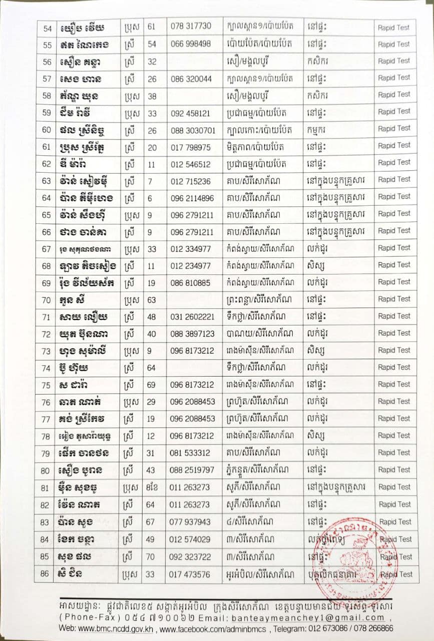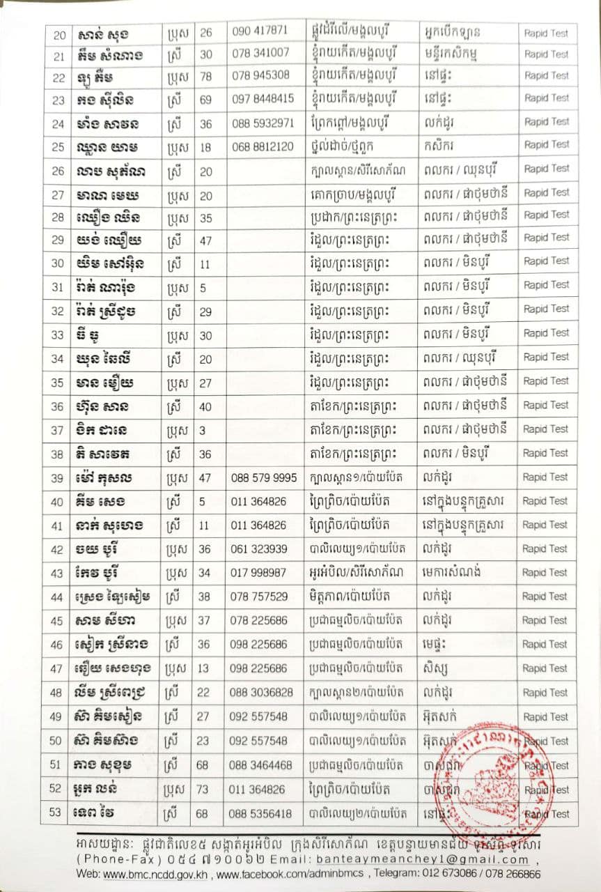 រដ្ឋបាលខេត្តបន្ទាយមានជ័យ បន្តរកឃើញអ្នកវិជ្ជមានកូវីដ-១៩ថ្មី ចំនួន ៦៨៩នាក់ ​និងជាសះស្បើយ ១៩៤នាក់