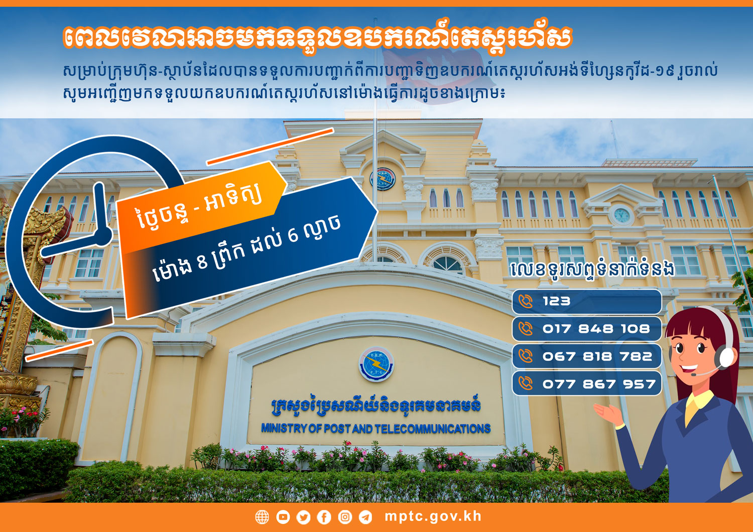 សម្រាប់ព័ត៌មានបន្ថែម សូមទាក់ទងទូរសព្ទលេខ ១២៣ / ០៦៧ ៨១៨ ៧៨២ / ០១៧ ៨៤៨ ១០៨ / ០៧៧ ៨៦៧ ៩៥៧ ។