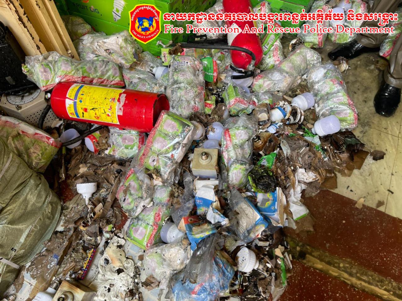 – ខូចខាតសំភារះ : ឆេះគ្រឿងអគ្គិសនីដែលស្តុបទុកក្នុងទីតាំងកើតខាងលើប្រហែល ៦៥% នឹងបានបណ្តាលអោយឆេះរាលដល់ផ្ទះចំនួន០២លែ្វង ។