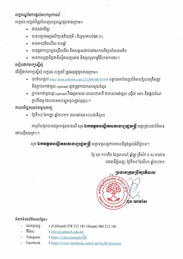 ក្នុងលិខិតមួយច្បាប់ផ្ញើជូន ឯកឧត្តមបណ្ឌិតសភាចារ្យ ហង់ជួន ណារ៉ុង បានគូសបញ្ជាក់ ចំពោះអាហារូបករណ៍១០០% ដែលសាកលវិទ្យាល័យបច្ចេកវិទ្យា និងវិទ្យាសាស្ដ្រកម្ពុជា (Cam Tech) ផ្តល់ជូនសិស្ស និស្សិតមានដូចជា៖