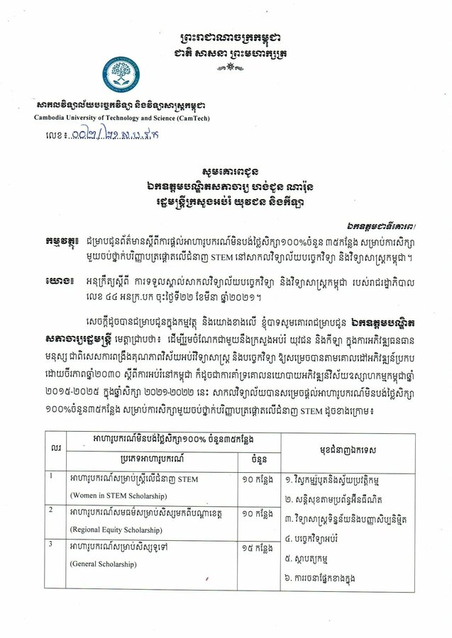 រាជធានីភ្នំពេញ៖ យោងតាមការចុះផ្សាយពី ក្រសួងព័ត៌មាន នៅថ្ងៃទី២០ ខែសីហា ឆ្នាំ២០២១ បានឲ្យដឹងថា ដើម្បីរួមចំណែកជាមួយនិង ក្រសួងអប់រំ យុវជន និងកីឡា ក្នុងការអភិវឌ្ឍធនធានមនុស្ស ជាពិសេសការពង្រឹងគុណភាពវិស័យអប់រំវិទ្យាសាស្រ្ដ និងបច្ចេកវិទ្យា ឲ្យសម្រេចបានតាមគោលដៅអភិវឌ្ឍន៍ប្រកបដោយចីរភាពឆ្នាំ២០៣០ ស្ដីពីការអប់រំនៅកម្ពុជា ក៏ដូចជាការគាំទ្រគោលនយោបាយអភិវឌ្ឍន៍វិស័យឧស្សាហកម្មកម្ពុជា ឆ្នាំ២០១៥-២០២៥ ក្នុងឆ្នាំសិក្សា ២០២១-២០២២ នេះ លោកឧញ៉ា ពុង ឃាវសែ ប្រធានក្រុមប្រឹក្សាភិបាល សាកលវិទ្យាល័យបច្ចេកវិទ្យា និងវិទ្យាសាស្ដ្រកម្ពុជា (Cam Tech) បានសម្រេចផ្ដល់អាហារូបករណ៍មិនបង់ថ្លៃសិក្សា១០០% ចំនួន ៣៥ កន្លែង សម្រាប់ការសិក្សាមួយចប់ថ្នាក់បរិញ្ញាបត្រលើជំនាញ STEM។